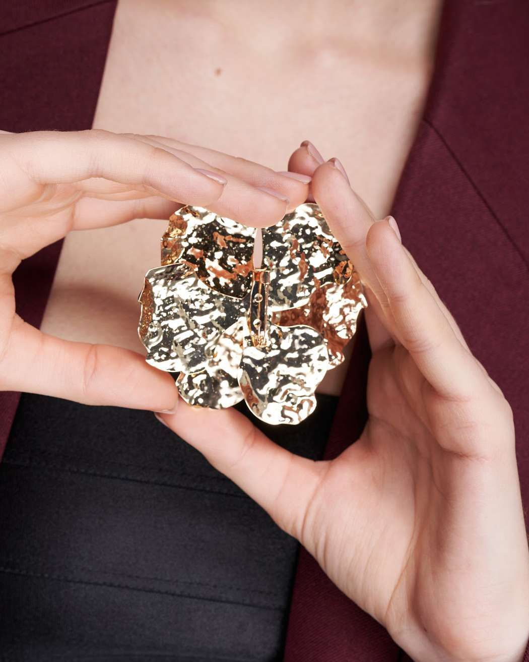 Золотая брошь-цветок притягивает взгляд своим уникальным дизайном. Это не просто брошь-булавка, это произведение искусства, созданное для того, чтобы выделяться.
