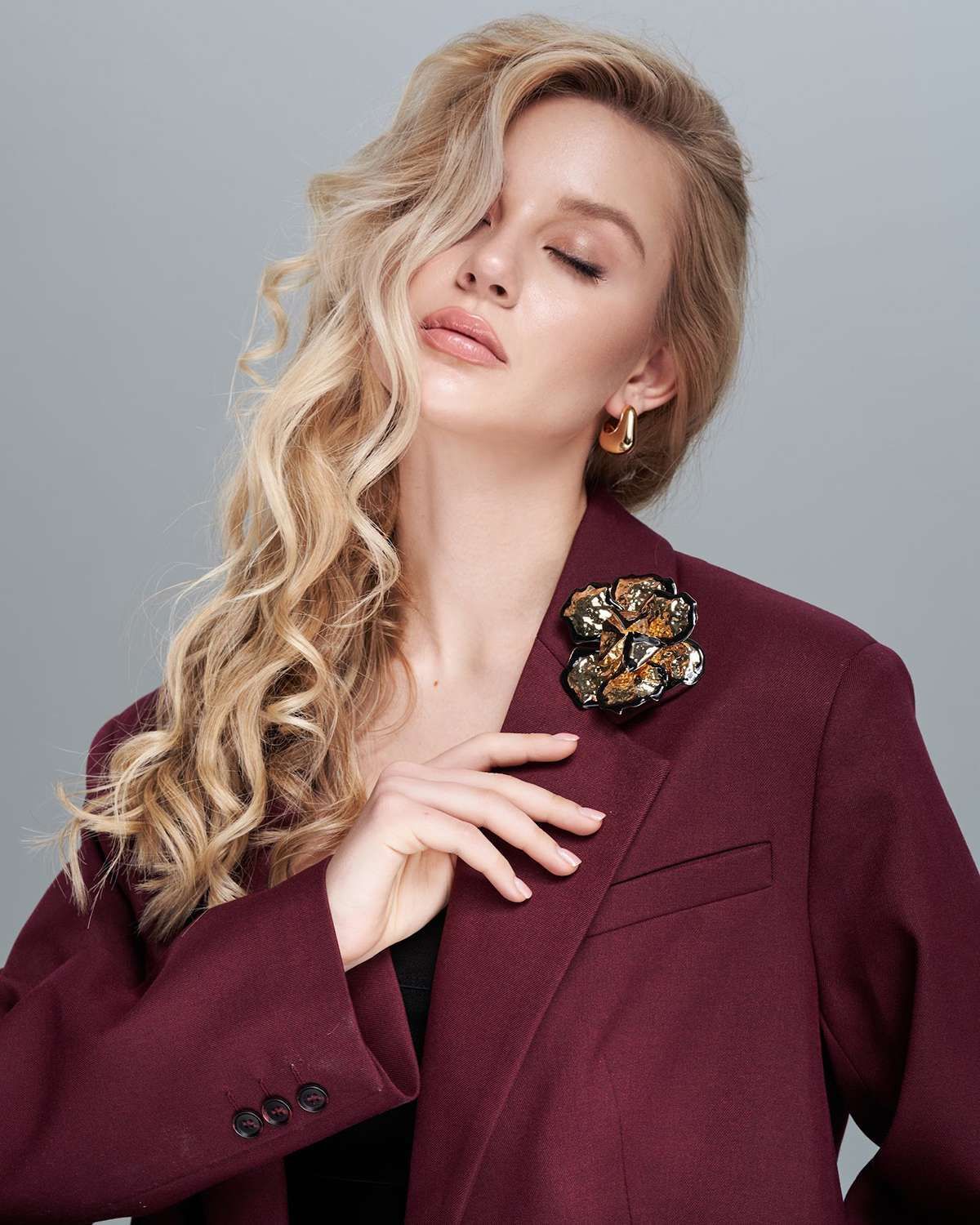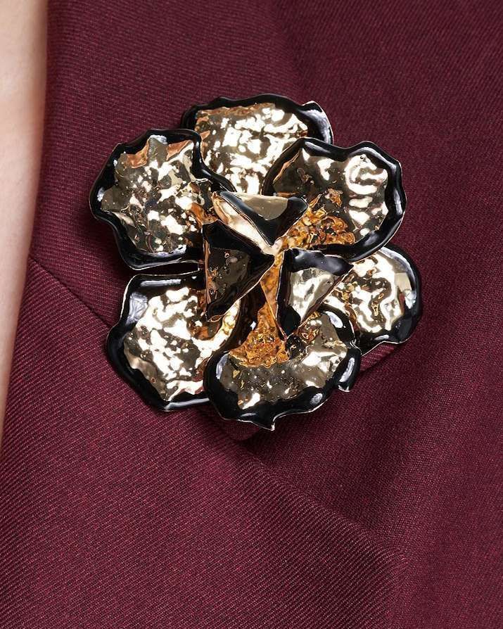 Каждый лепесток этого металлического цветка – результат кропотливой работы дизайнера. Черные края лепестков создают дерзкий контраст, подчеркивая глубину и сложность формы. Эмалевое покрытие придает лепесткам насыщенный цвет и глянцевый блеск, делая брошь особенно привлекательной.
