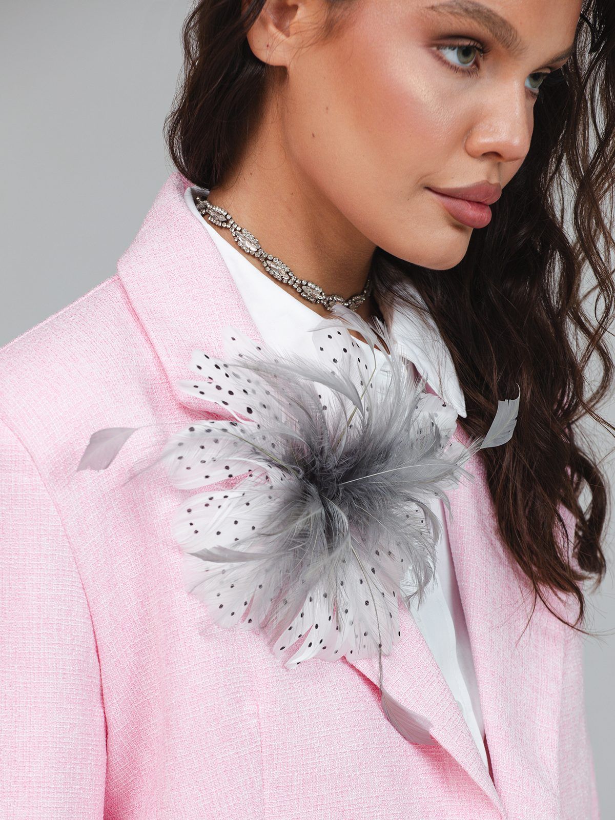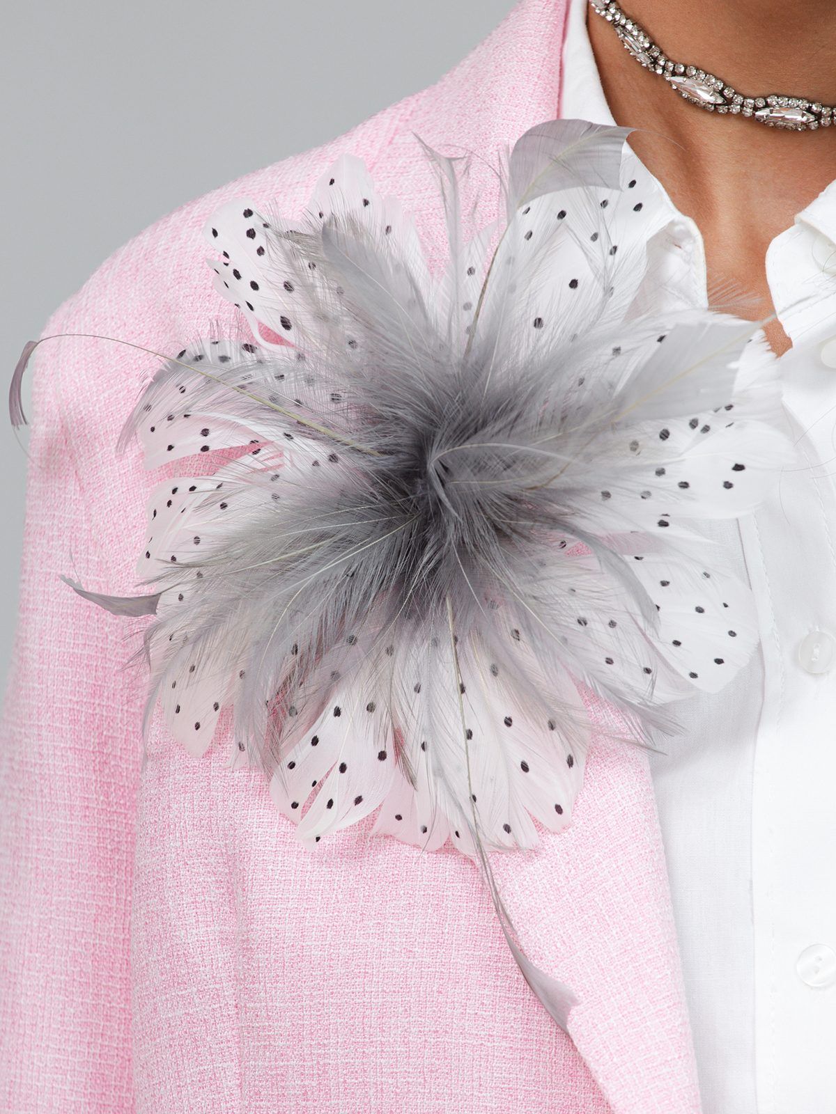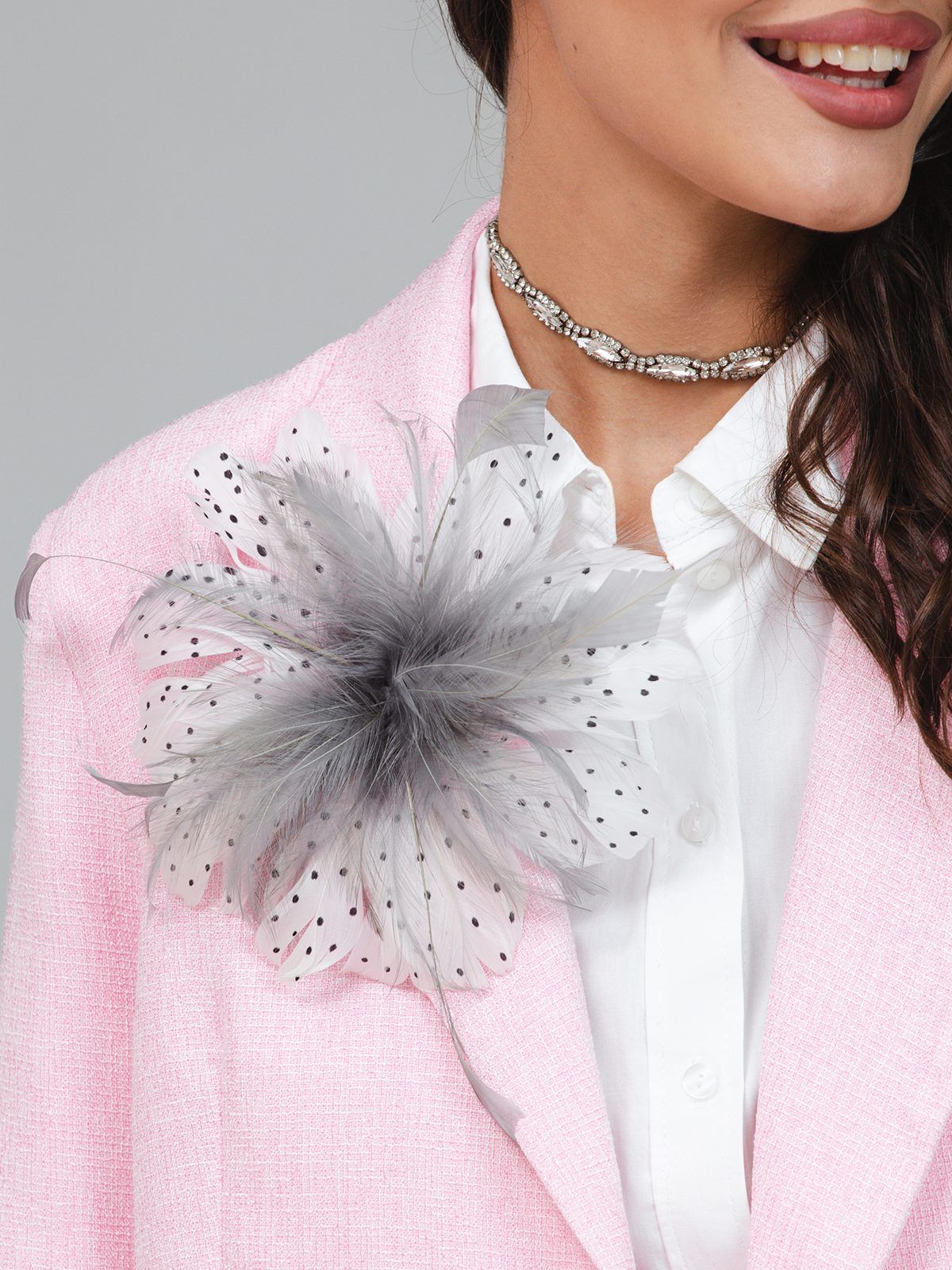 Необычайно романтичная большая брошь цветок из перьев станет изысканным акцентом в вашем образе. Выполненная из натуральных перьев, она олицетворяет естественную красоту и утонченность. Перья разной формы придают броши динамичность и уникальный вид, делая каждый экземпляр по-настоящему неповторимым. Лепестки цветка в горошек добавляют игривости и легкости, создавая необычный и запоминающийся образ.