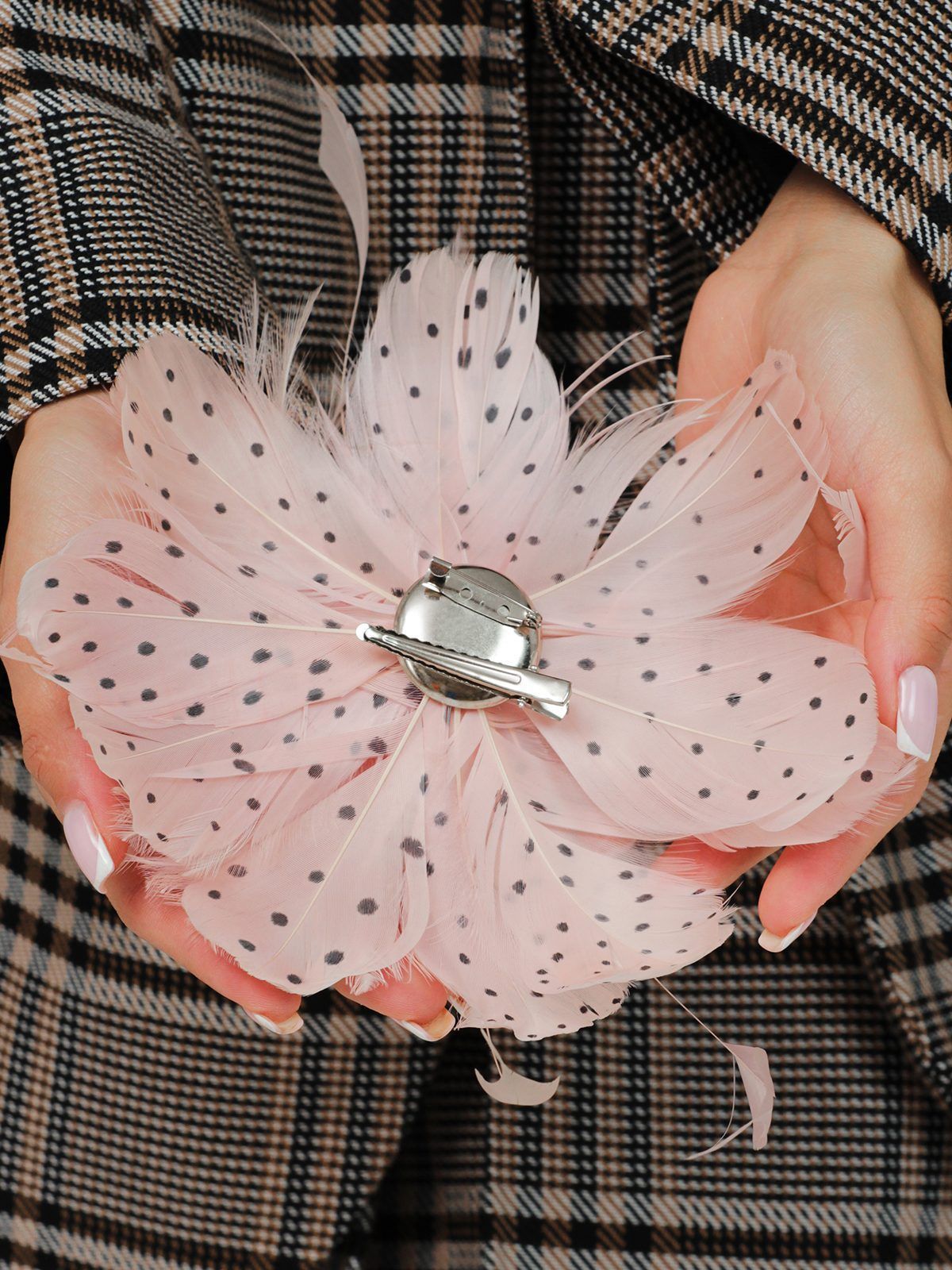 Необычайно романтичная большая брошь цветок из перьев станет изысканным акцентом в вашем образе. Выполненная из натуральных перьев, она олицетворяет естественную красоту и утонченность. Перья разной формы придают броши динамичность и уникальный вид, делая каждый экземпляр по-настоящему неповторимым. Лепестки цветка в горошек добавляют игривости и легкости, создавая необычный и запоминающийся образ.