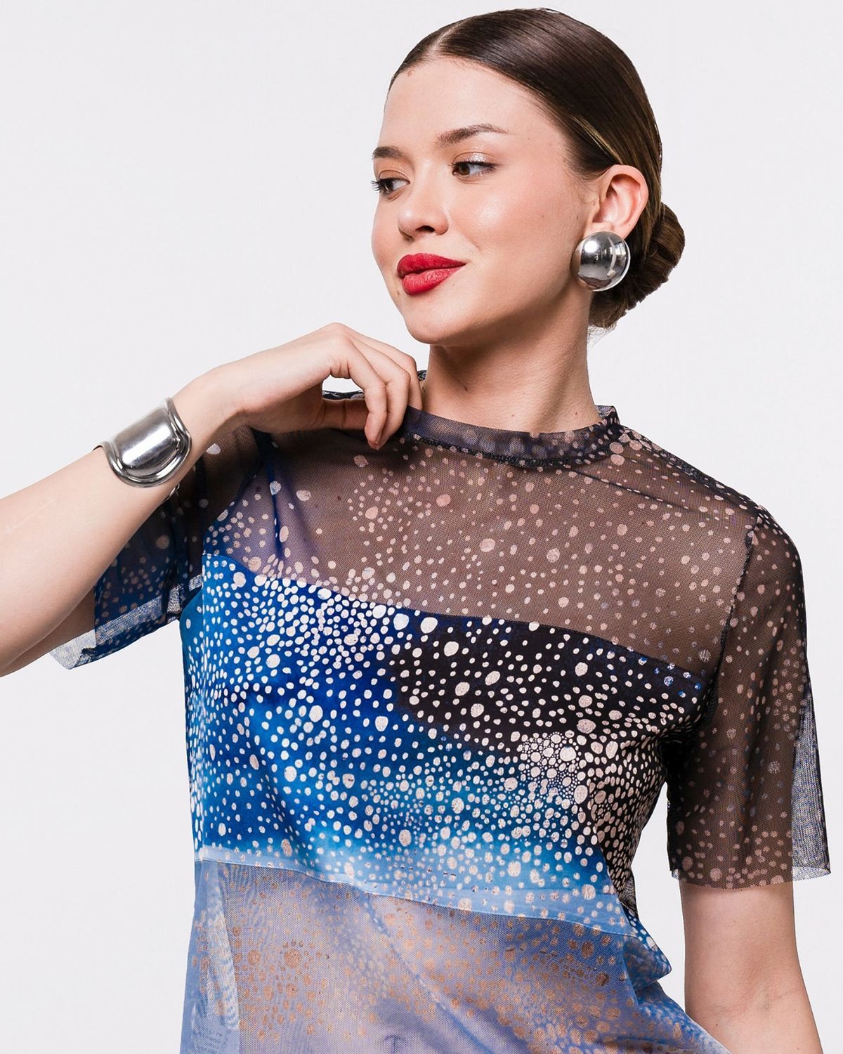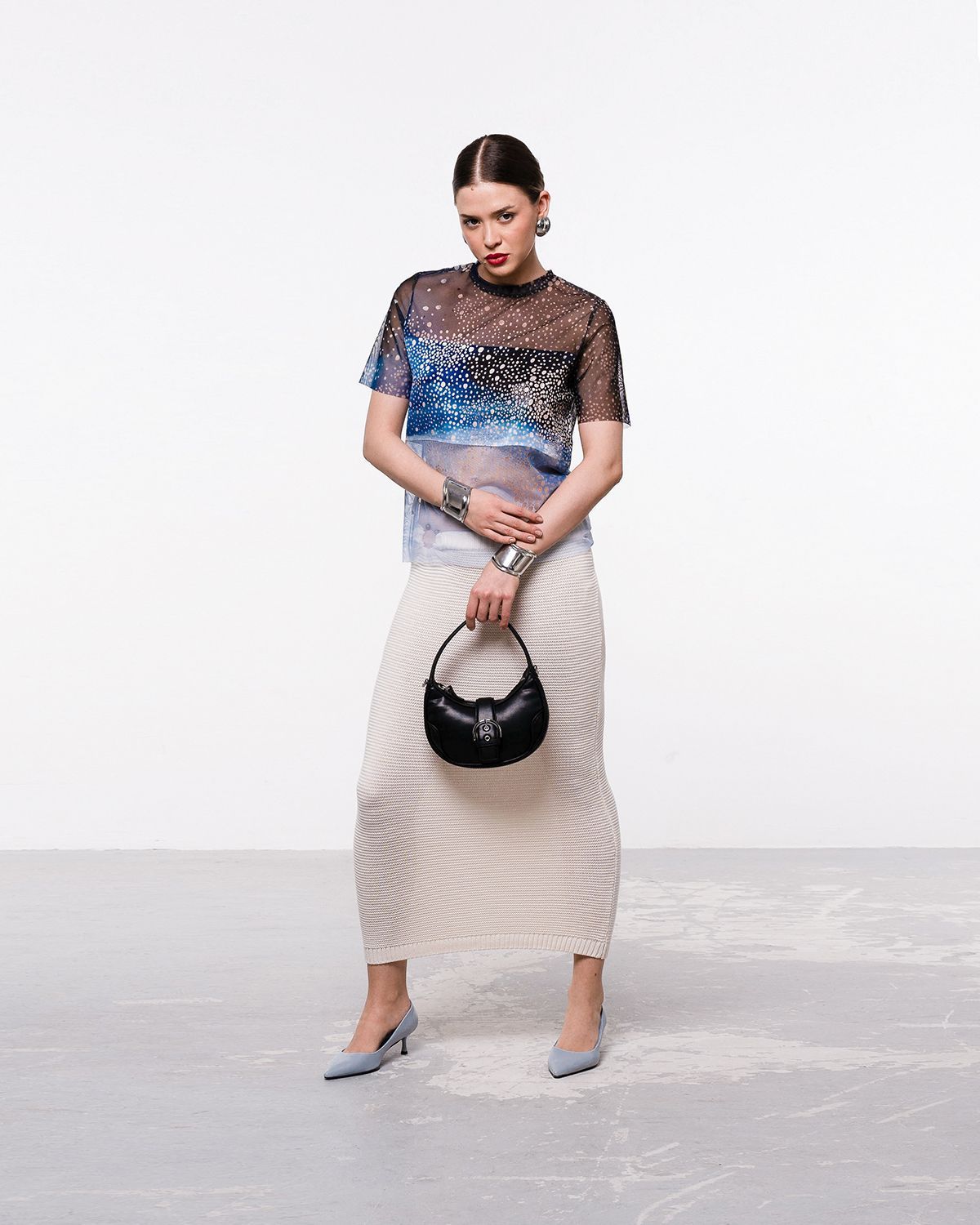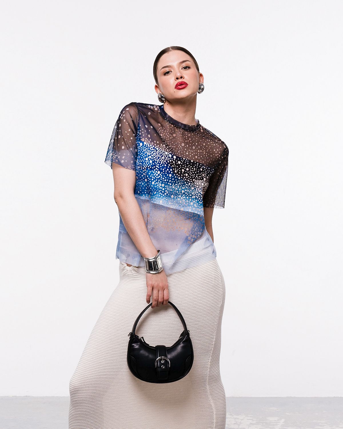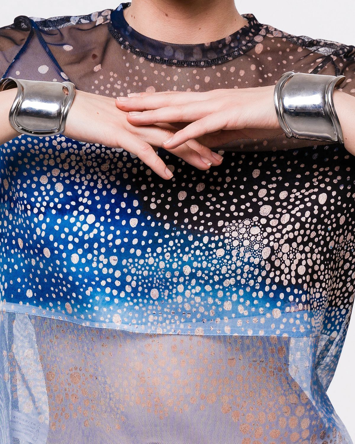Самый явный тренд с подиумов — прозрачность. Мы, как всегда, обыграли его со своим видением. Получилась футболка из сетки с шелковой вставкой по центру в районе груди. Спинка при этом полностью сделана из сетки.