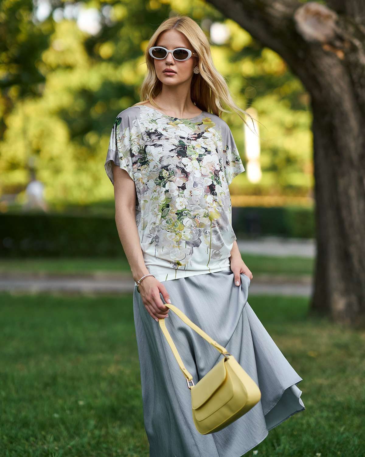 Футболка "Кимоно-баллон" из вискозной ткани "Венеция" с полной запечаткой авторским принтом. Это тонкий плотный трикотаж с матовой поверхностью, мягкий и шелковистый на ощупь, не образует катышков. Защипы чуть ниже талии позволяют скрыть проблемные зоны фигуры. Принт наносится таким образом, что краска введена в саму текстуру ткани и надежно там закреплена. Трикотаж остается эластичным, нет никаких слоев нанесения сверху ткани. Благодаря такой технологии рисунок остается ярким даже после многочисленных стирок.