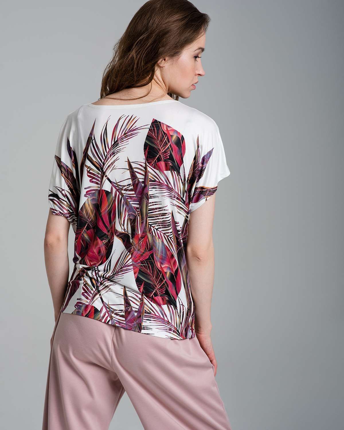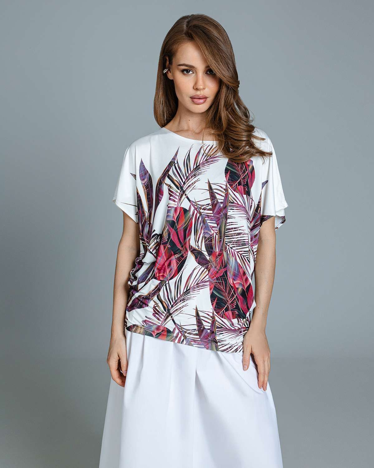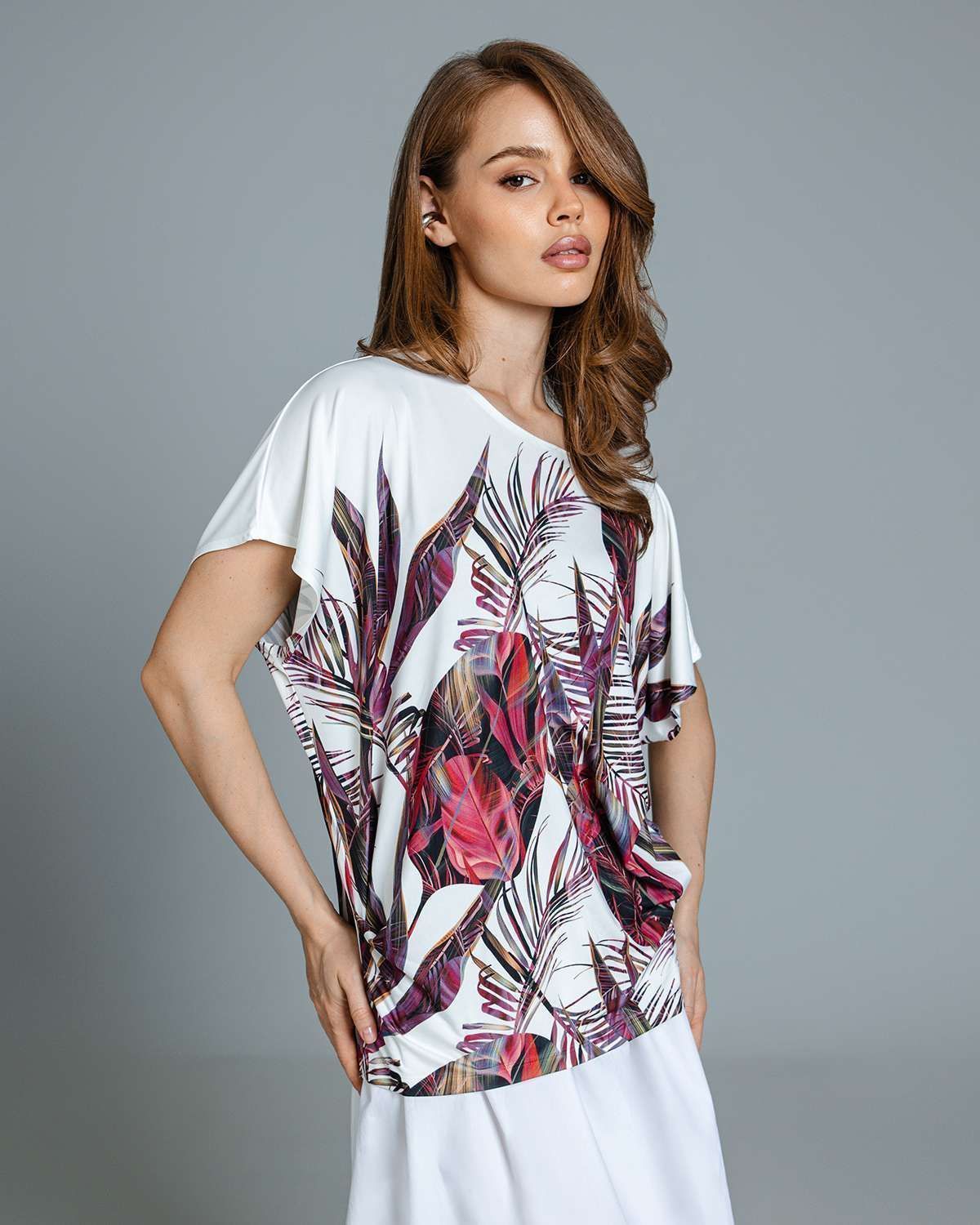 Футболка "Кимоно-баллон" из вискозной ткани "Венеция" с полной запечаткой авторским принтом. Это тонкий плотный трикотаж с матовой поверхностью, мягкий и шелковистый на ощупь, не образует катышков. Защипы чуть ниже талии позволяют скрыть проблемные зоны фигуры. Принт наносится таким образом, что краска введена в саму текстуру ткани и надежно там закреплена. Трикотаж остается эластичным, нет никаких слоев нанесения сверху ткани. Благодаря такой технологии рисунок остается ярким даже после многочисленных стирок.