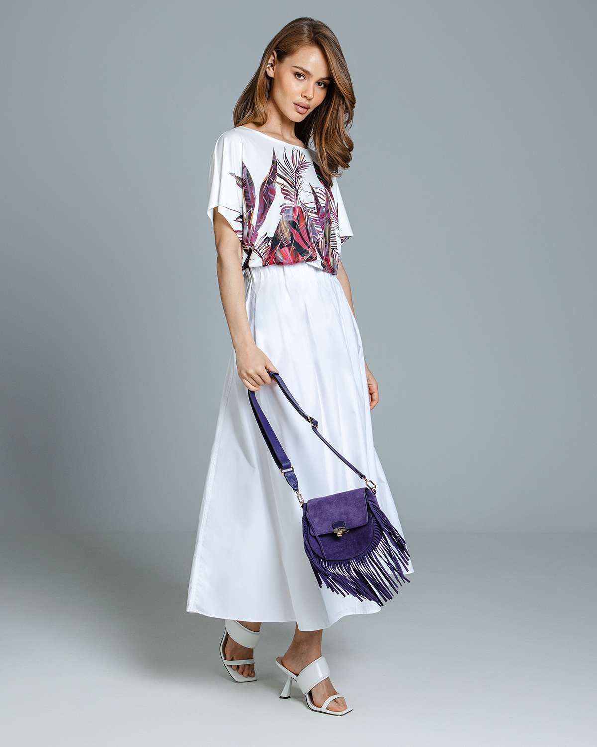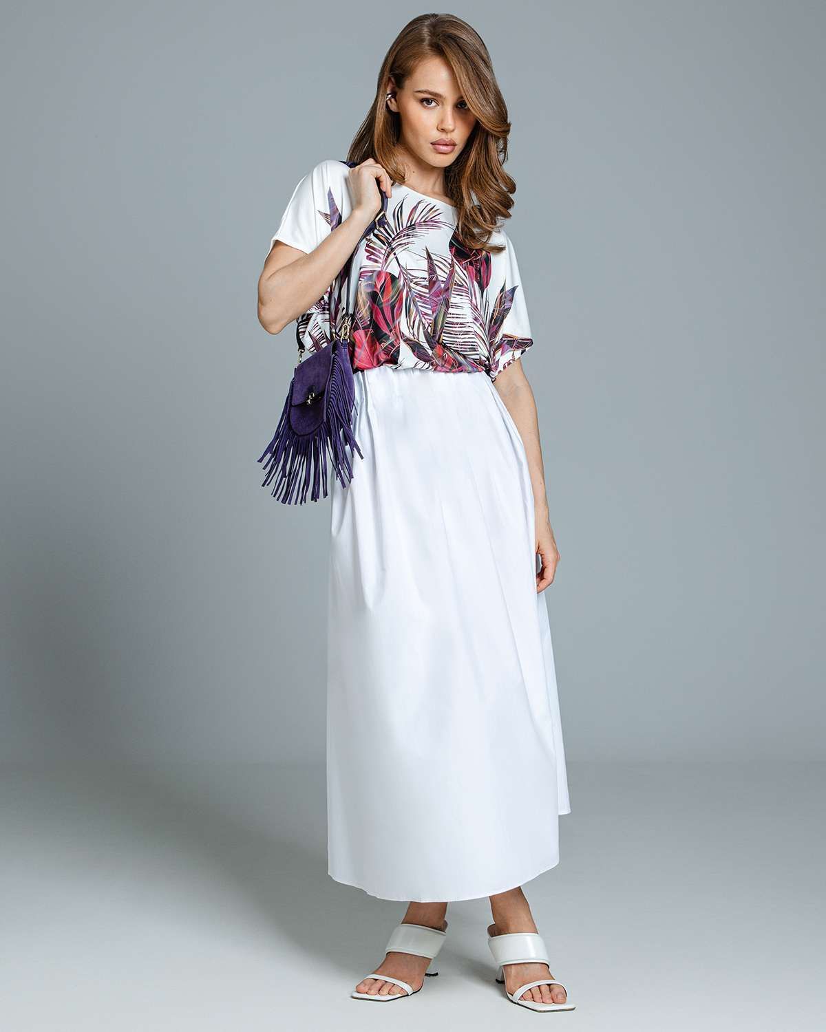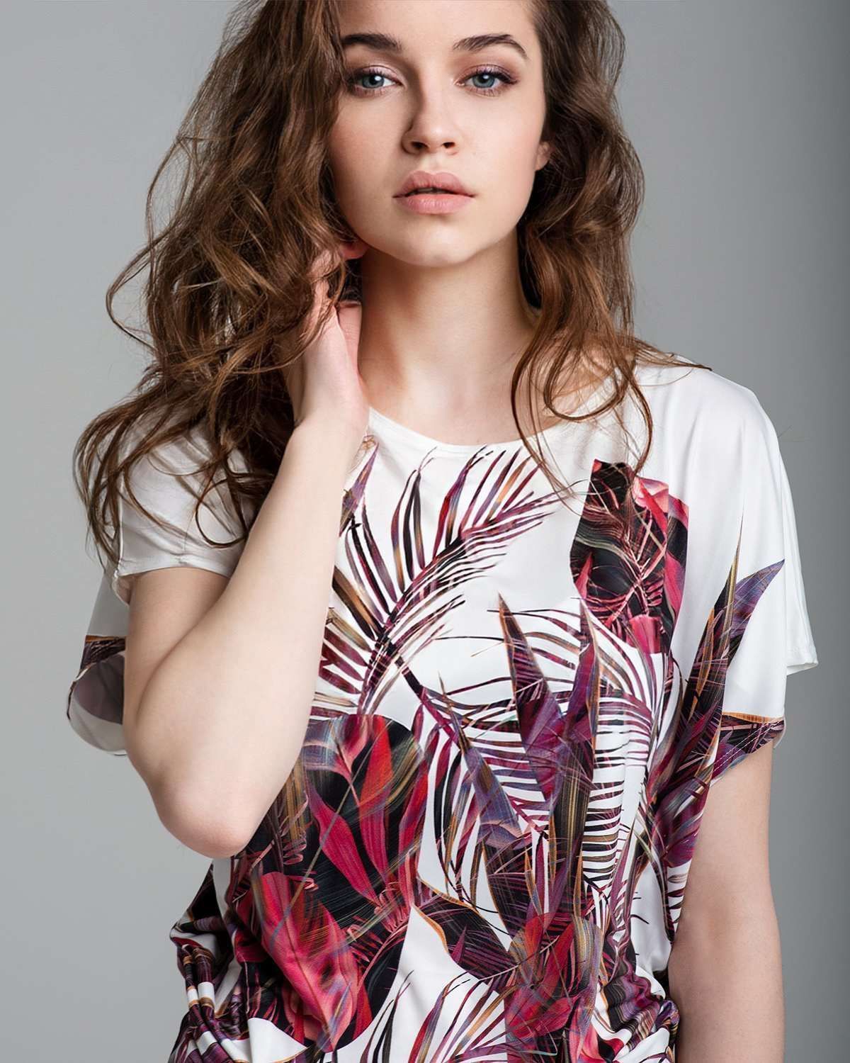 Футболка "Кимоно-баллон" из вискозной ткани "Венеция" с полной запечаткой авторским принтом. Это тонкий плотный трикотаж с матовой поверхностью, мягкий и шелковистый на ощупь, не образует катышков. Защипы чуть ниже талии позволяют скрыть проблемные зоны фигуры. Принт наносится таким образом, что краска введена в саму текстуру ткани и надежно там закреплена. Трикотаж остается эластичным, нет никаких слоев нанесения сверху ткани. Благодаря такой технологии рисунок остается ярким даже после многочисленных стирок.