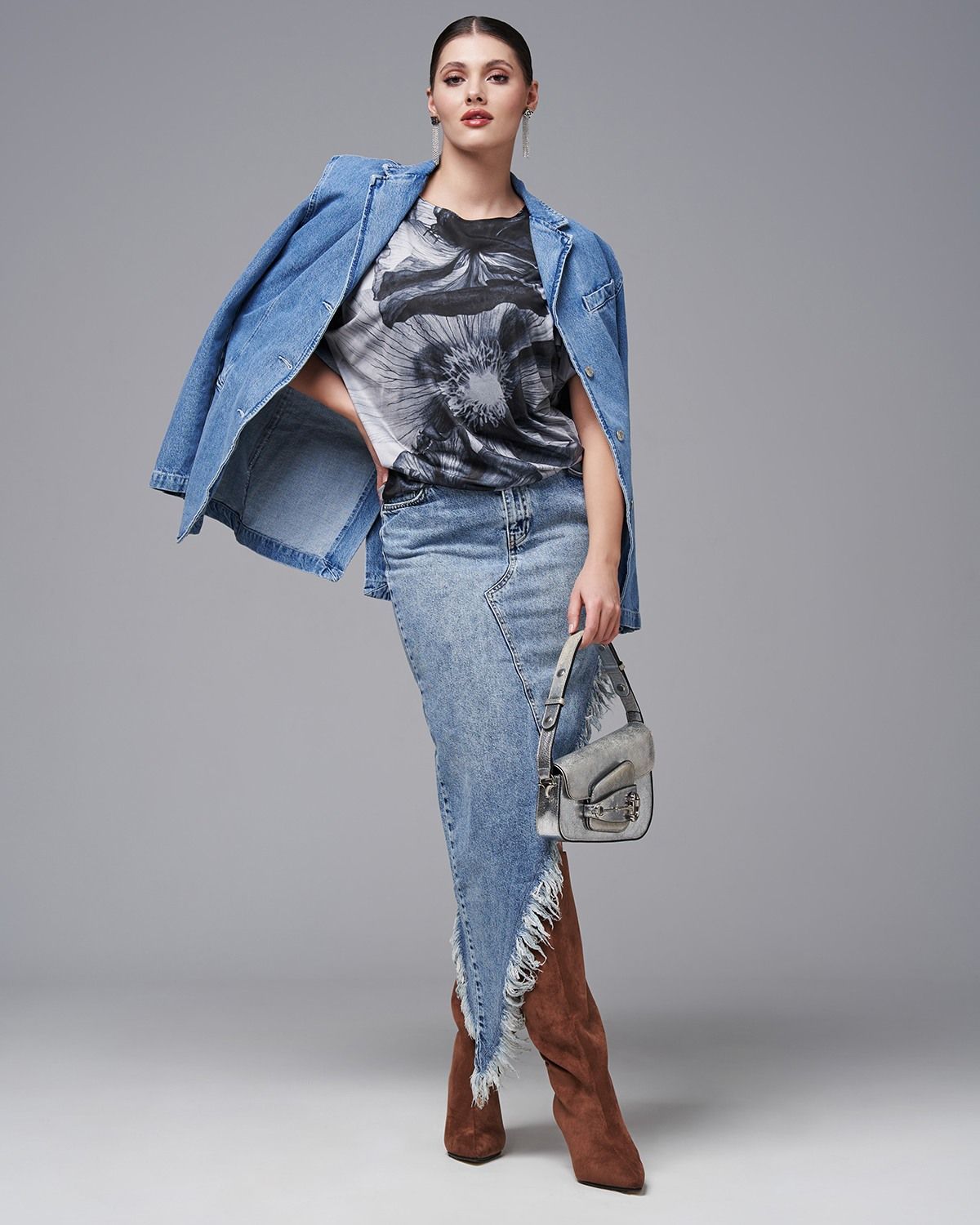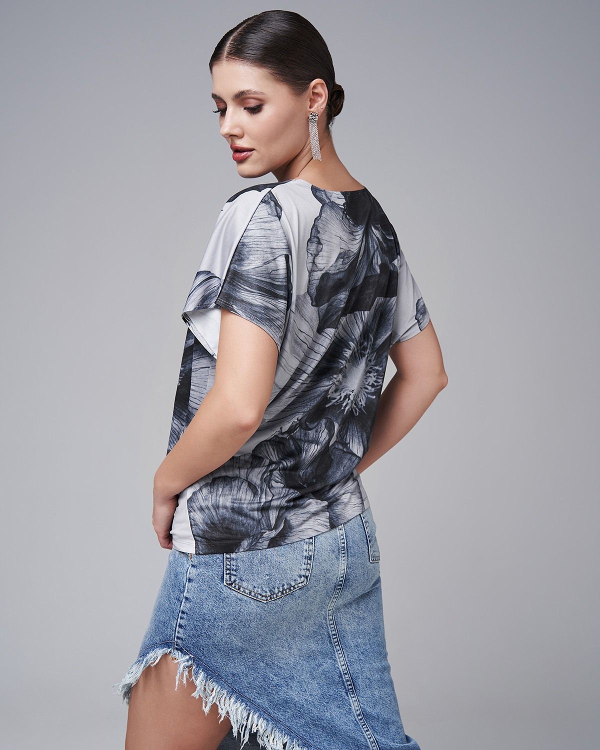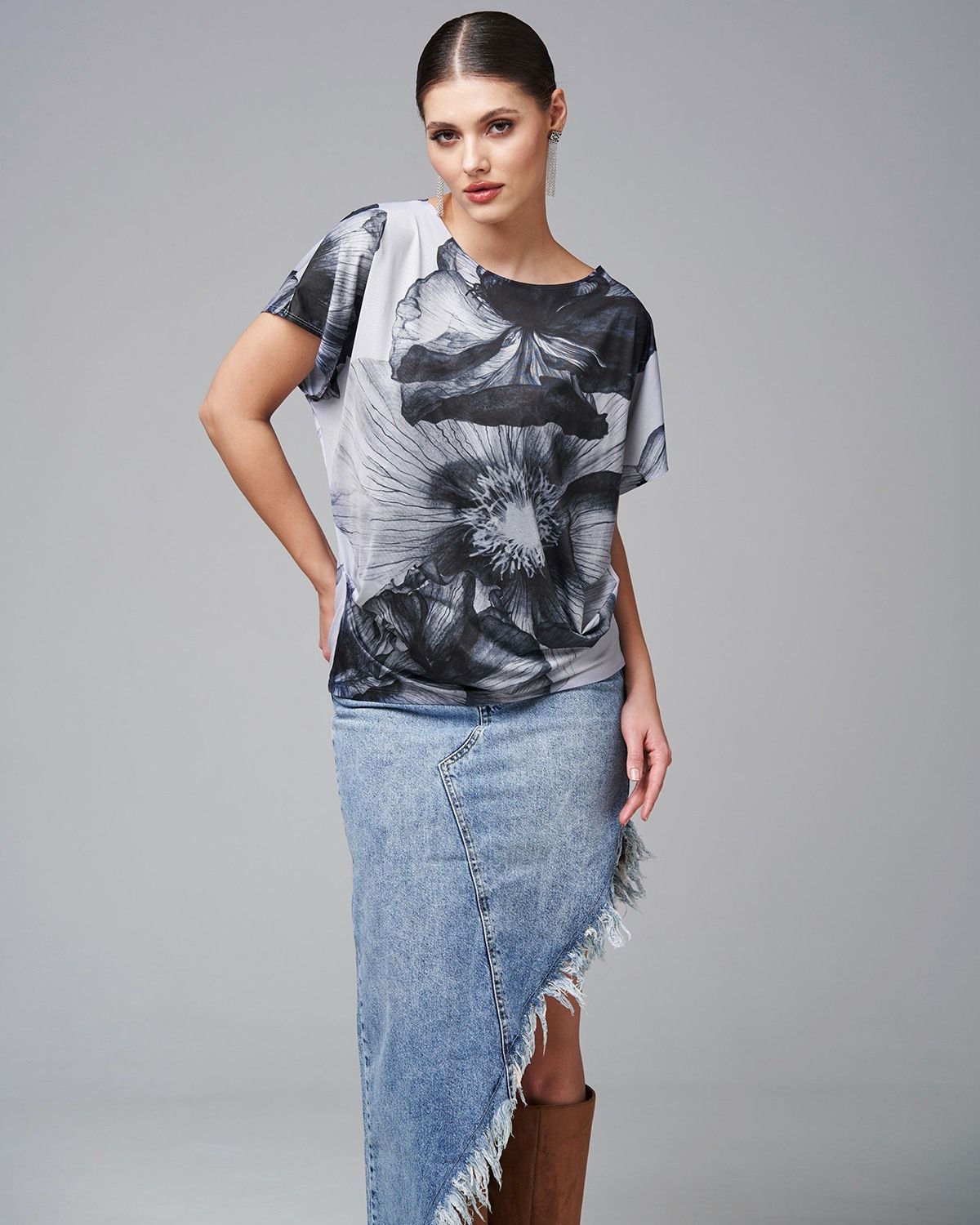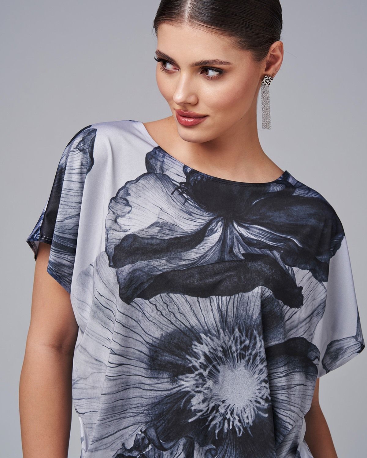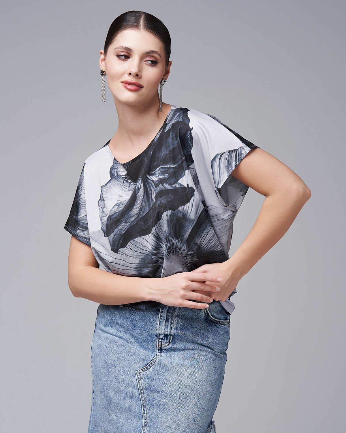Футболка "Кимоно-баллон" из вискозной ткани "Венеция" с полной запечаткой авторским принтом. Это тонкий плотный трикотаж с матовой поверхностью, мягкий и шелковистый на ощупь, не образует катышков. Защипы чуть ниже талии позволяют скрыть проблемные зоны фигуры. Принт наносится таким образом, что краска введена в саму текстуру ткани и надежно там закреплена. Трикотаж остается эластичным, нет никаких слоев нанесения сверху ткани. Благодаря такой технологии рисунок остается ярким даже после многочисленных стирок.