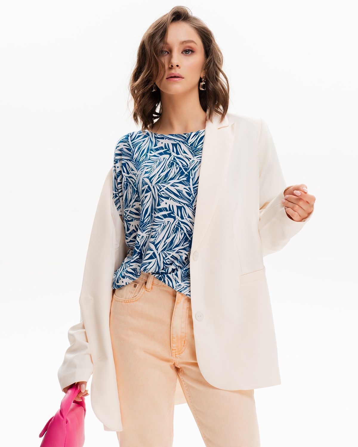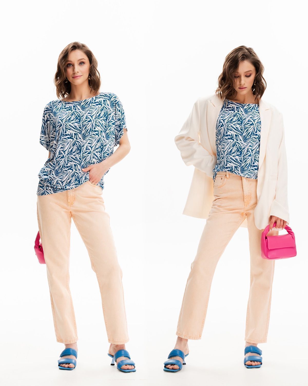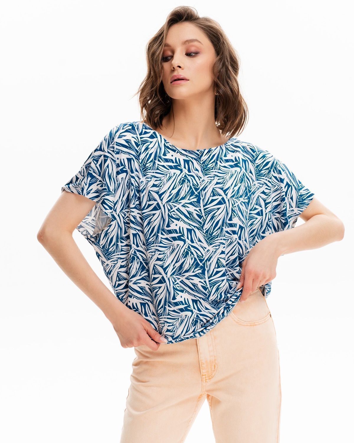 Футболка "Кимоно-баллон" из принтованной вискозной ткани "Венеция". Это тонкий плотный трикотаж с матовой поверхностью, мягкий и шелковистый на ощупь, не образует катышков. Защипы чуть ниже талии позволяют скрыть проблемные зоны фигуры.