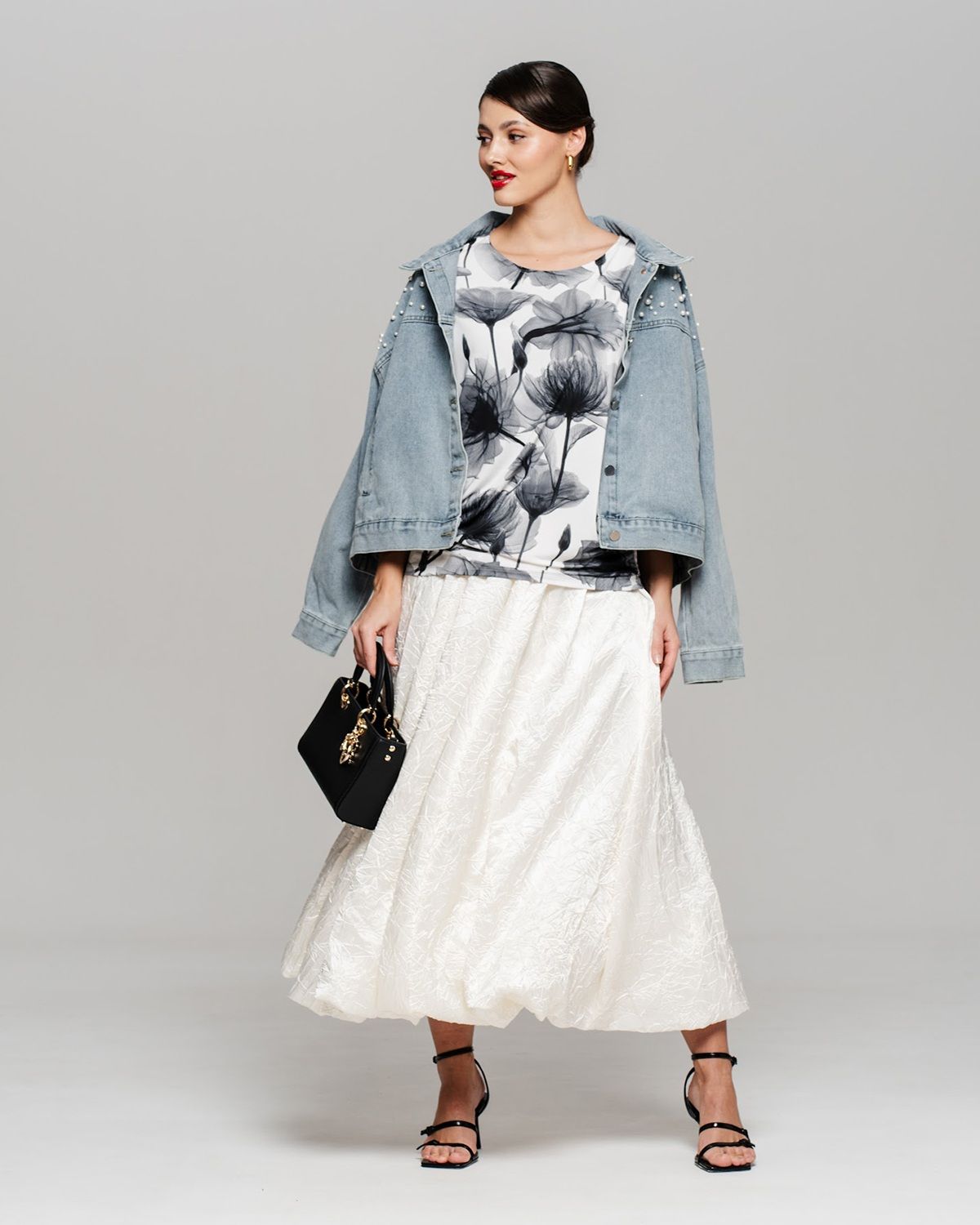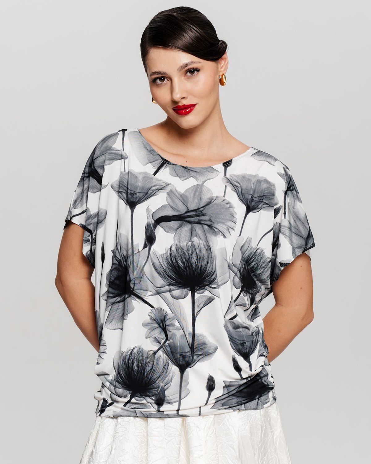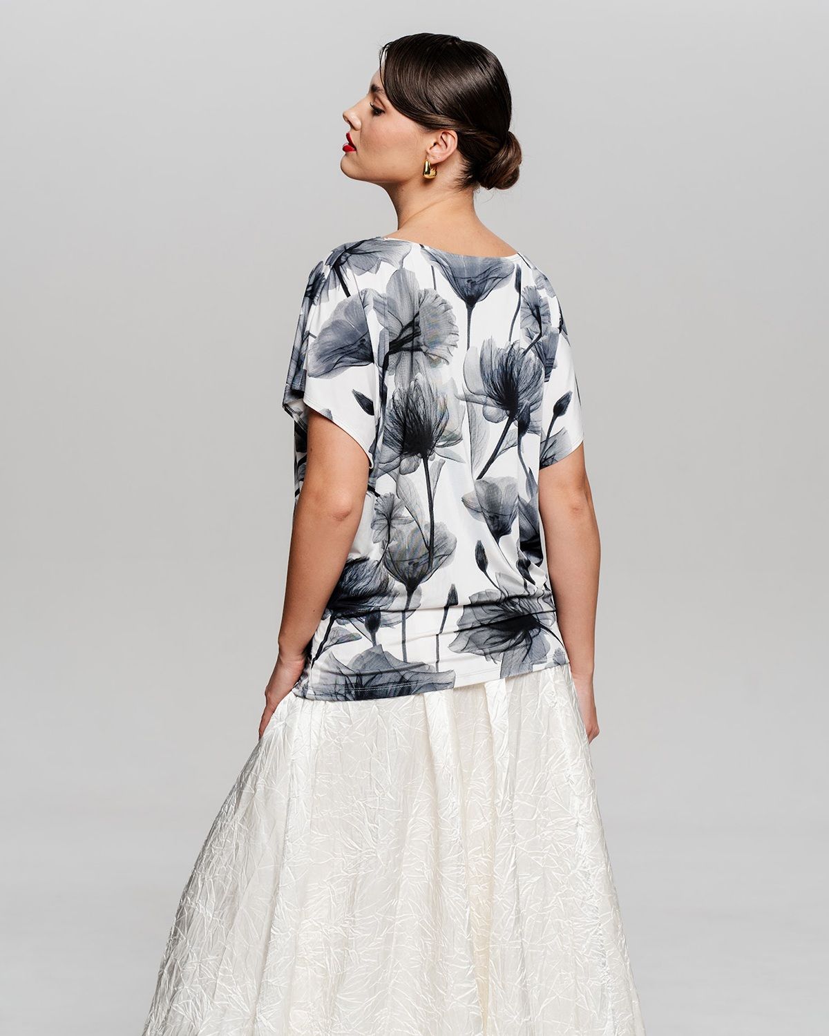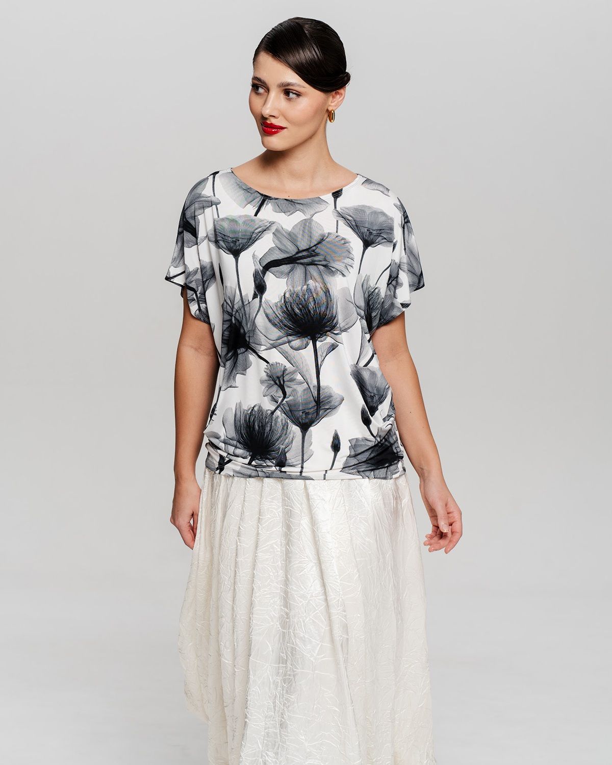 Футболка "Кимоно-баллон" из принтованной вискозной ткани "Венеция". Это тонкий плотный трикотаж с матовой поверхностью, мягкий и шелковистый на ощупь, не образует катышков. Защипы чуть ниже талии позволяют скрыть проблемные зоны фигуры.