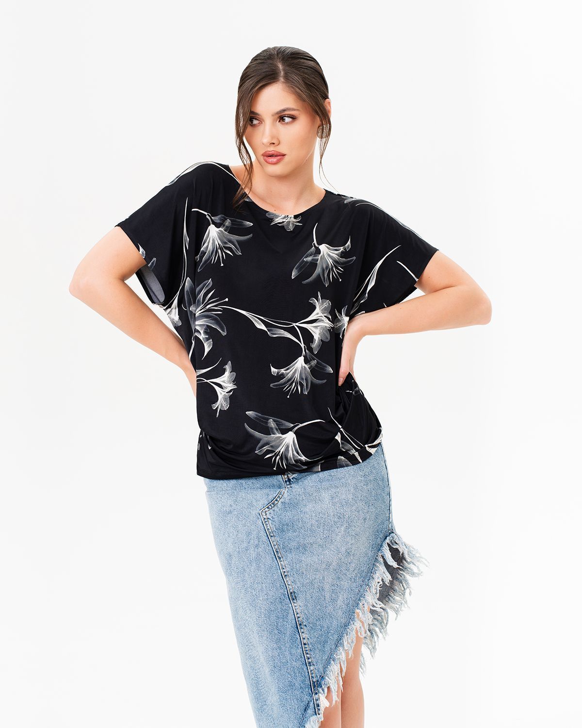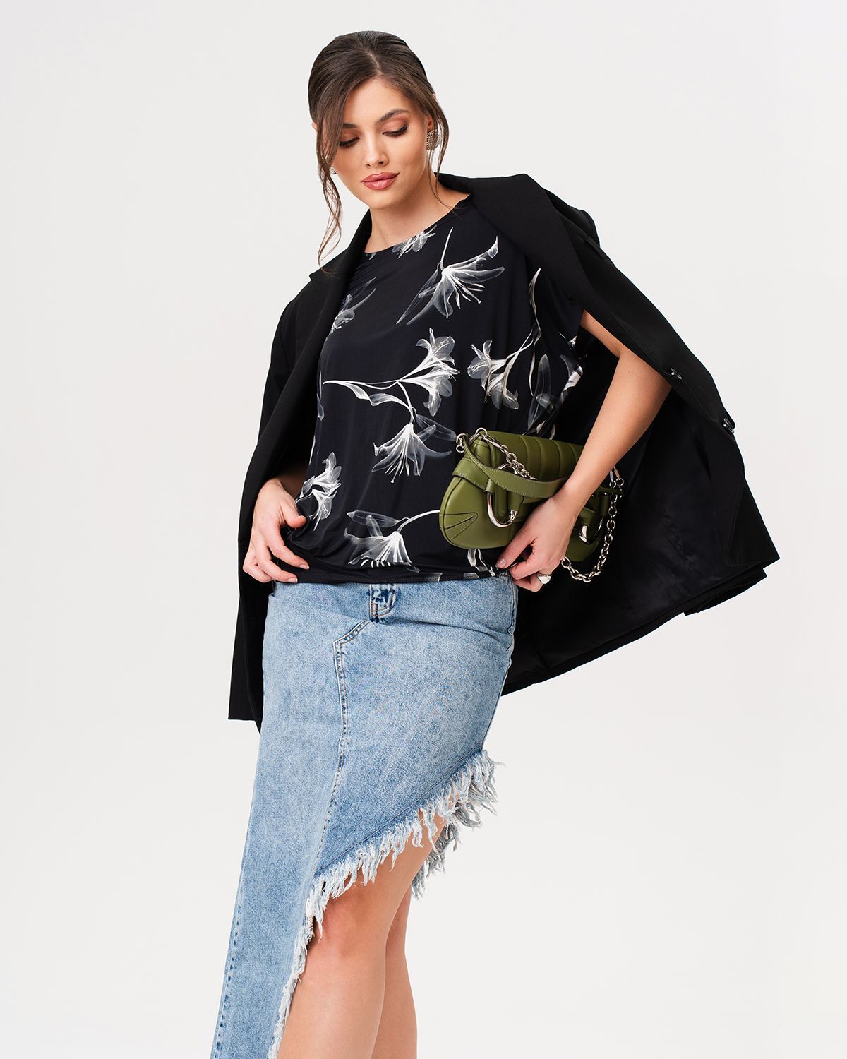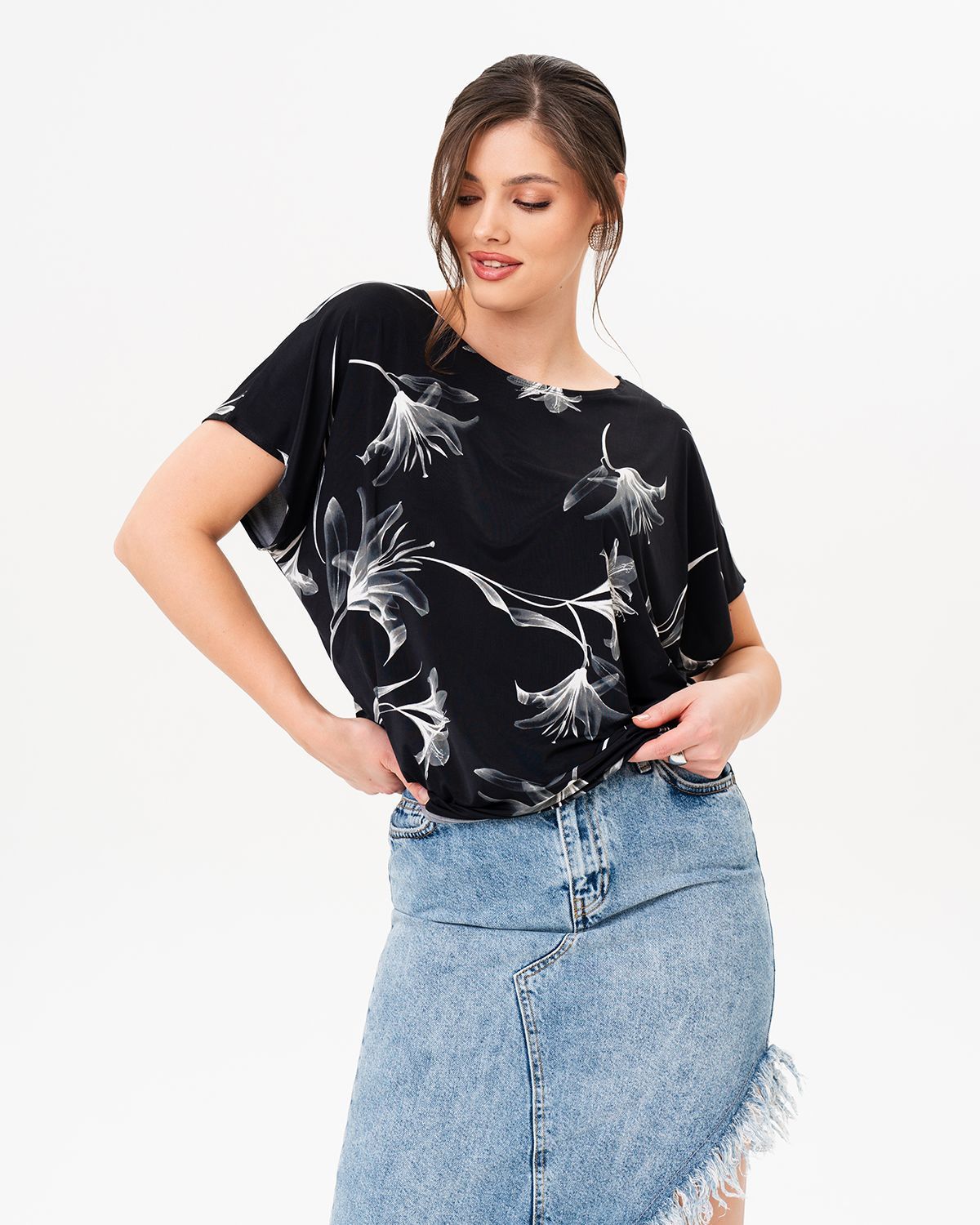 Футболка "Кимоно-баллон" из принтованной вискозной ткани "Венеция". Это тонкий плотный трикотаж с матовой поверхностью, мягкий и шелковистый на ощупь, не образует катышков. Защипы чуть ниже талии позволяют скрыть проблемные зоны фигуры.