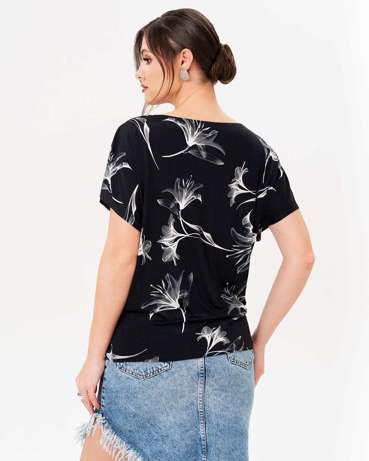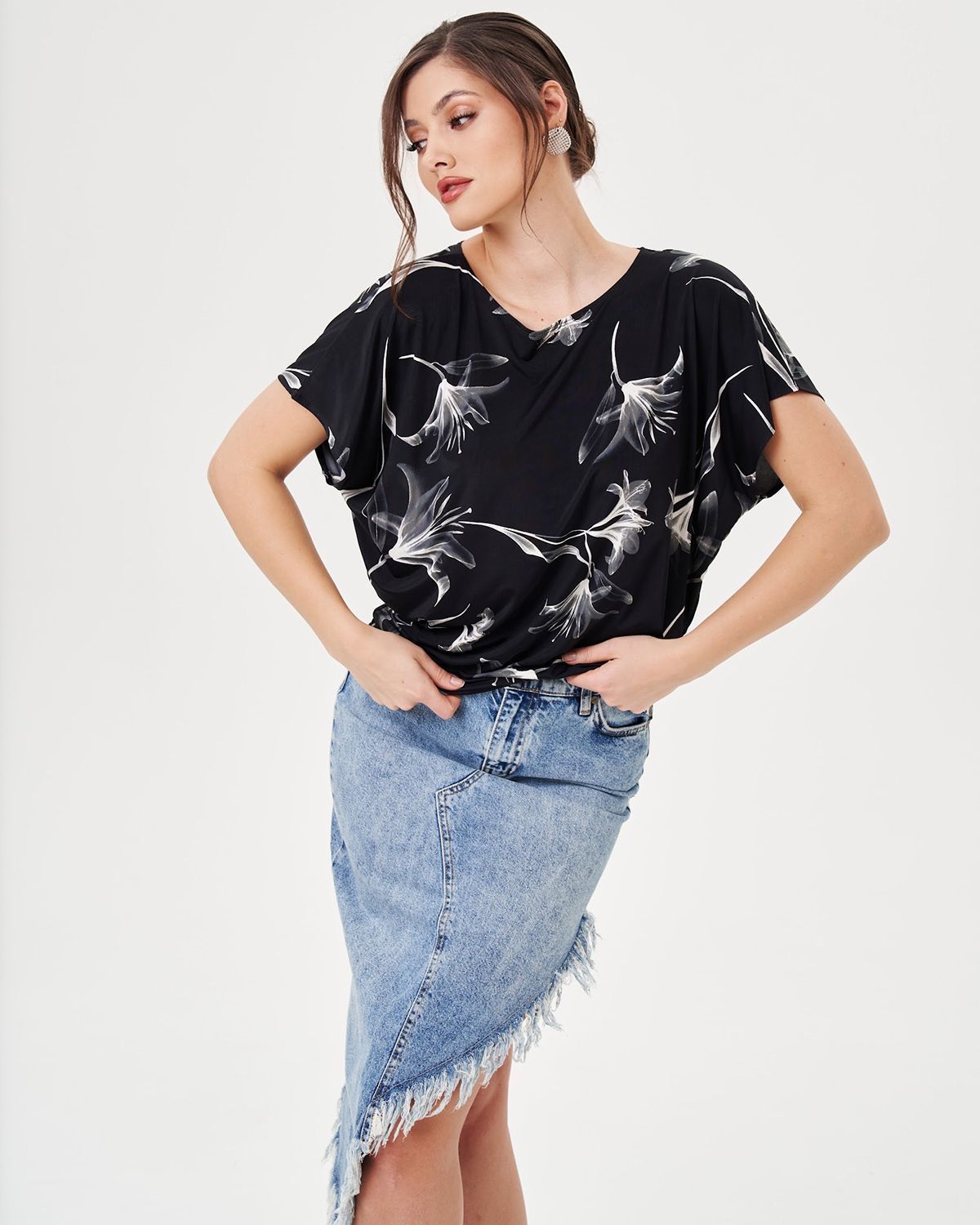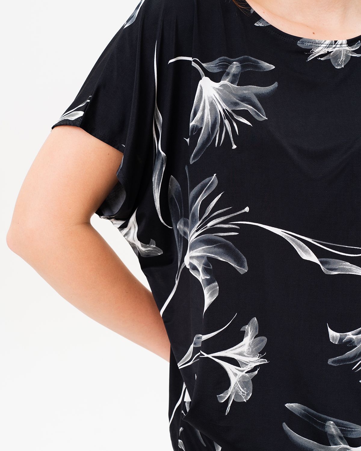 Футболка "Кимоно-баллон" из принтованной вискозной ткани "Венеция". Это тонкий плотный трикотаж с матовой поверхностью, мягкий и шелковистый на ощупь, не образует катышков. Защипы чуть ниже талии позволяют скрыть проблемные зоны фигуры.