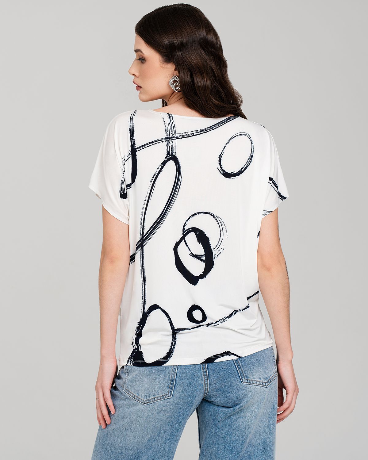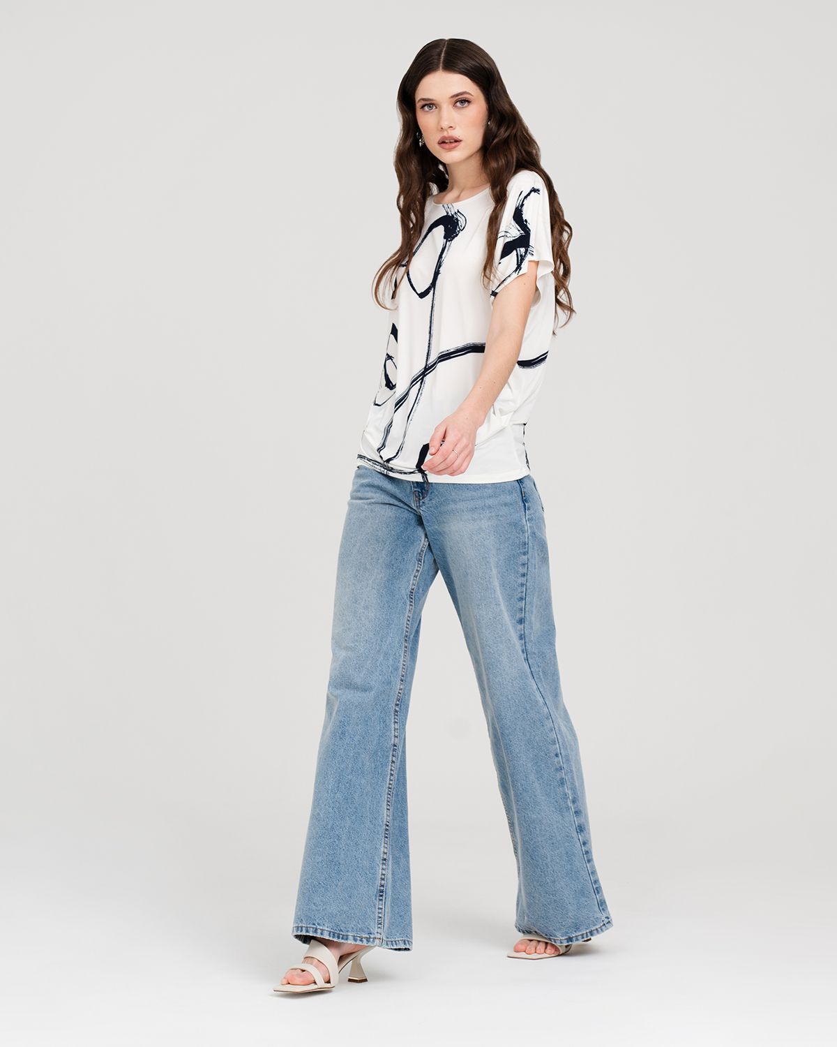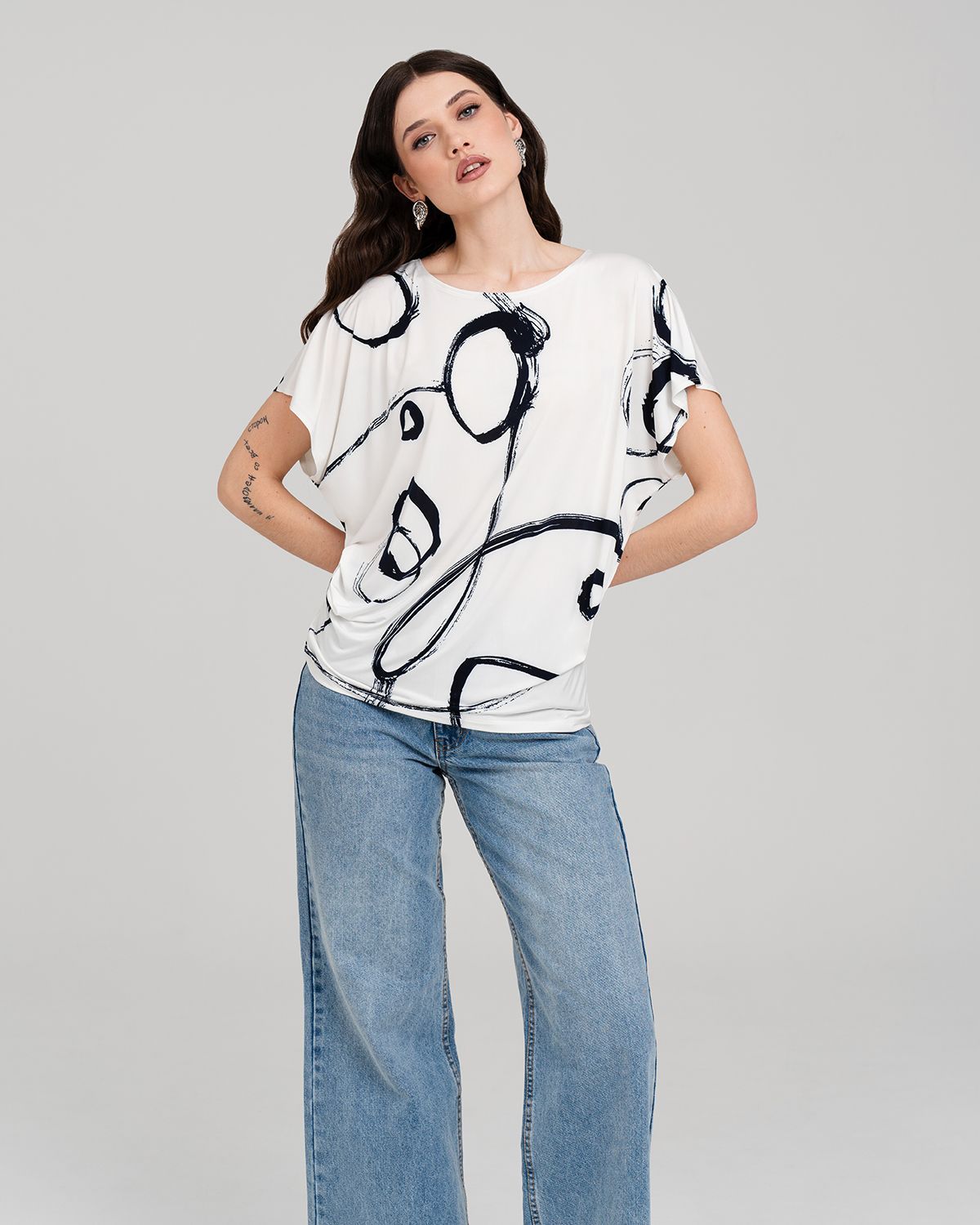 Футболка "Кимоно-баллон" из принтованной вискозной ткани "Венеция". Это тонкий плотный трикотаж с матовой поверхностью, мягкий и шелковистый на ощупь, не образует катышков. Защипы чуть ниже талии позволяют скрыть проблемные зоны фигуры.