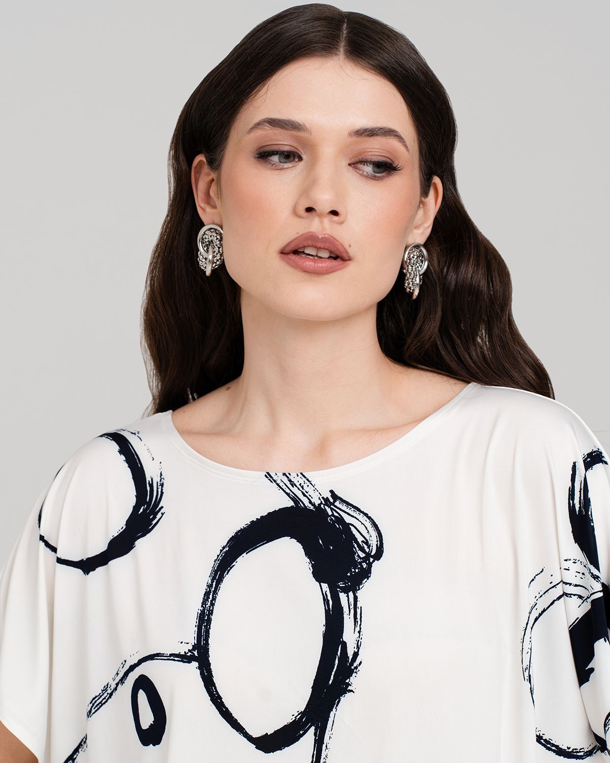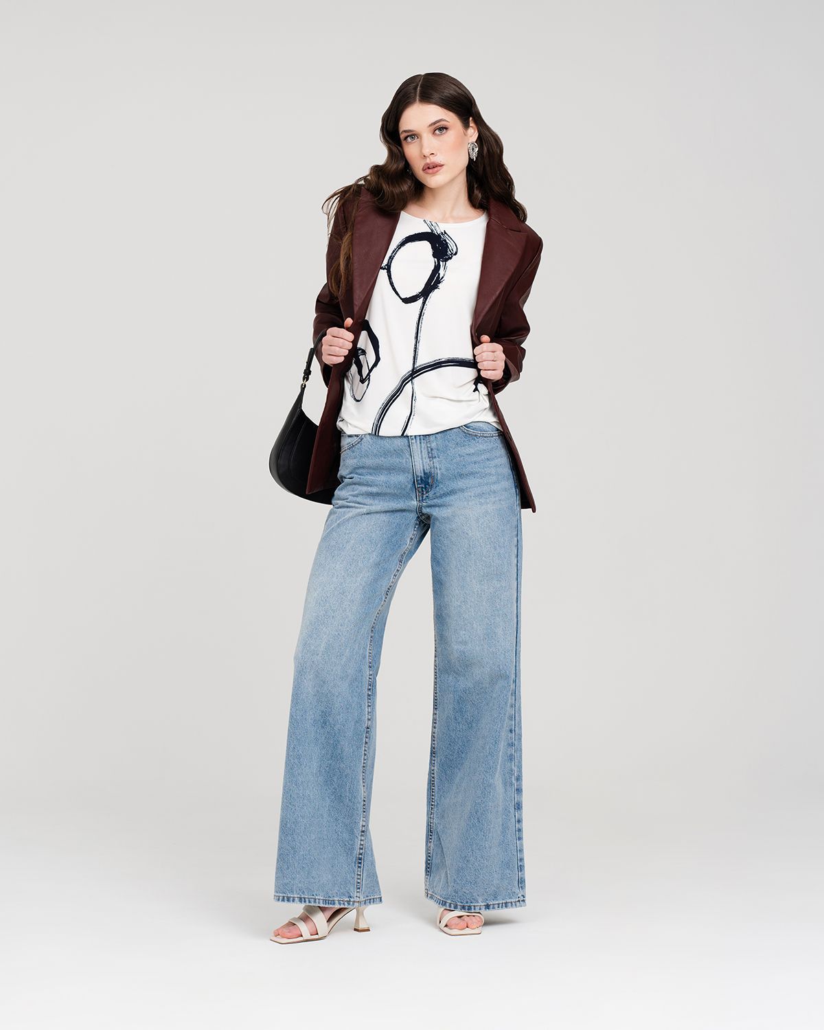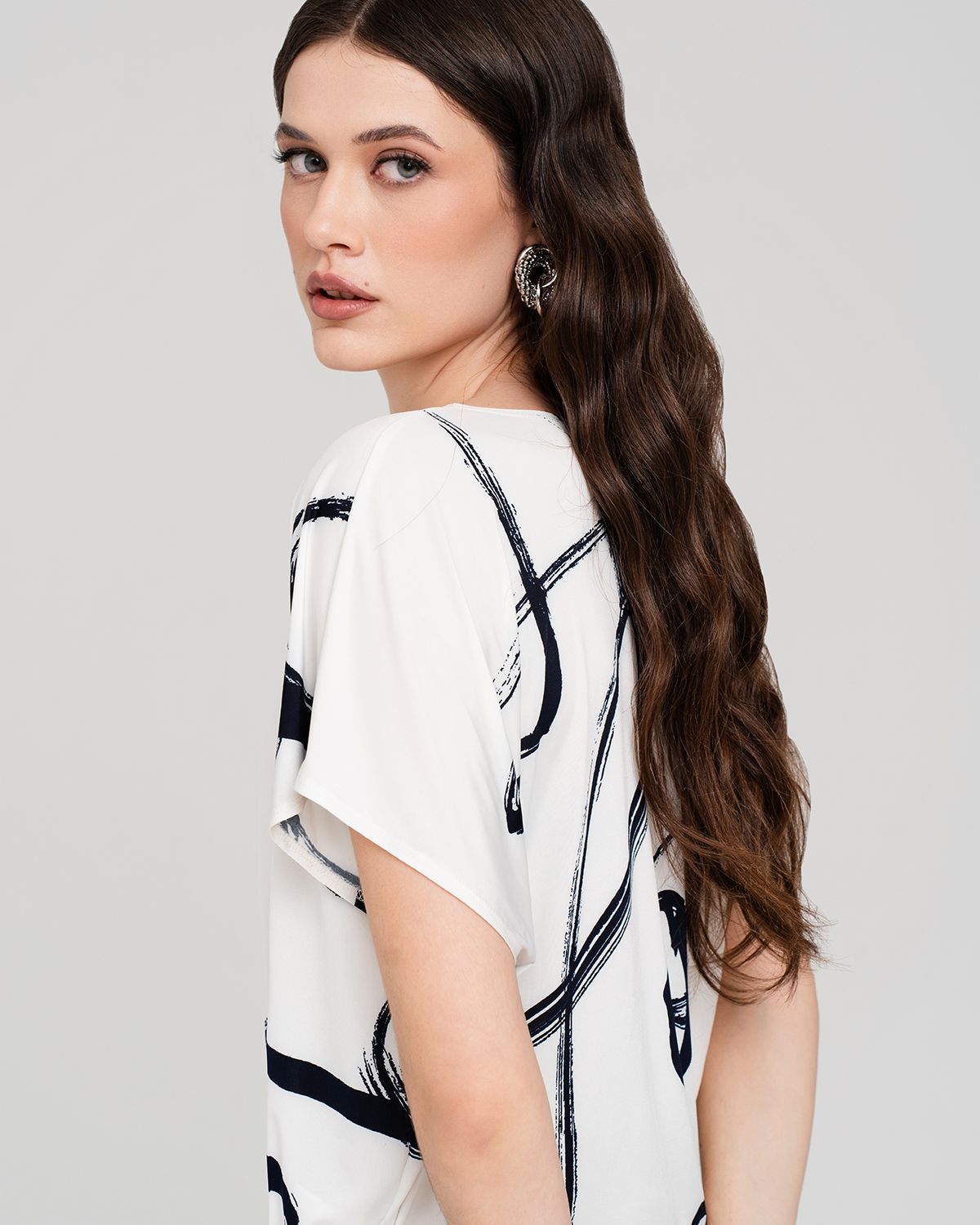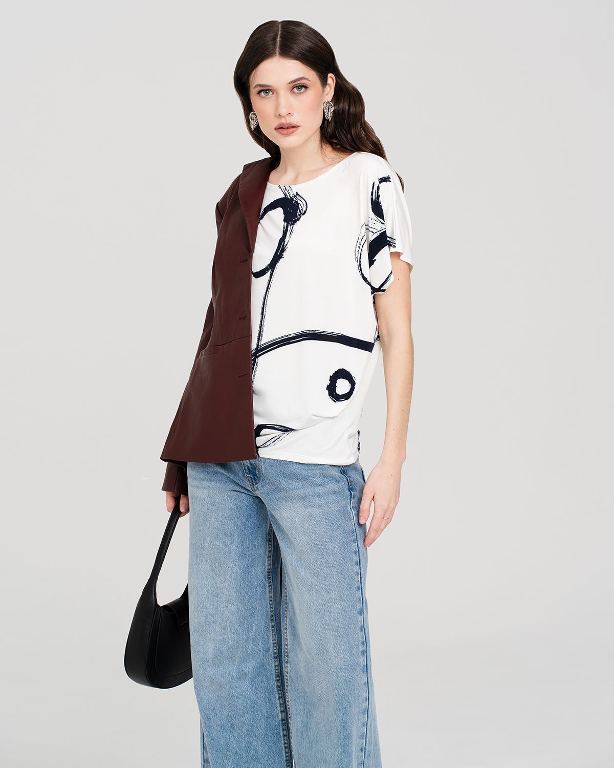 Футболка "Кимоно-баллон" из принтованной вискозной ткани "Венеция". Это тонкий плотный трикотаж с матовой поверхностью, мягкий и шелковистый на ощупь, не образует катышков. Защипы чуть ниже талии позволяют скрыть проблемные зоны фигуры.