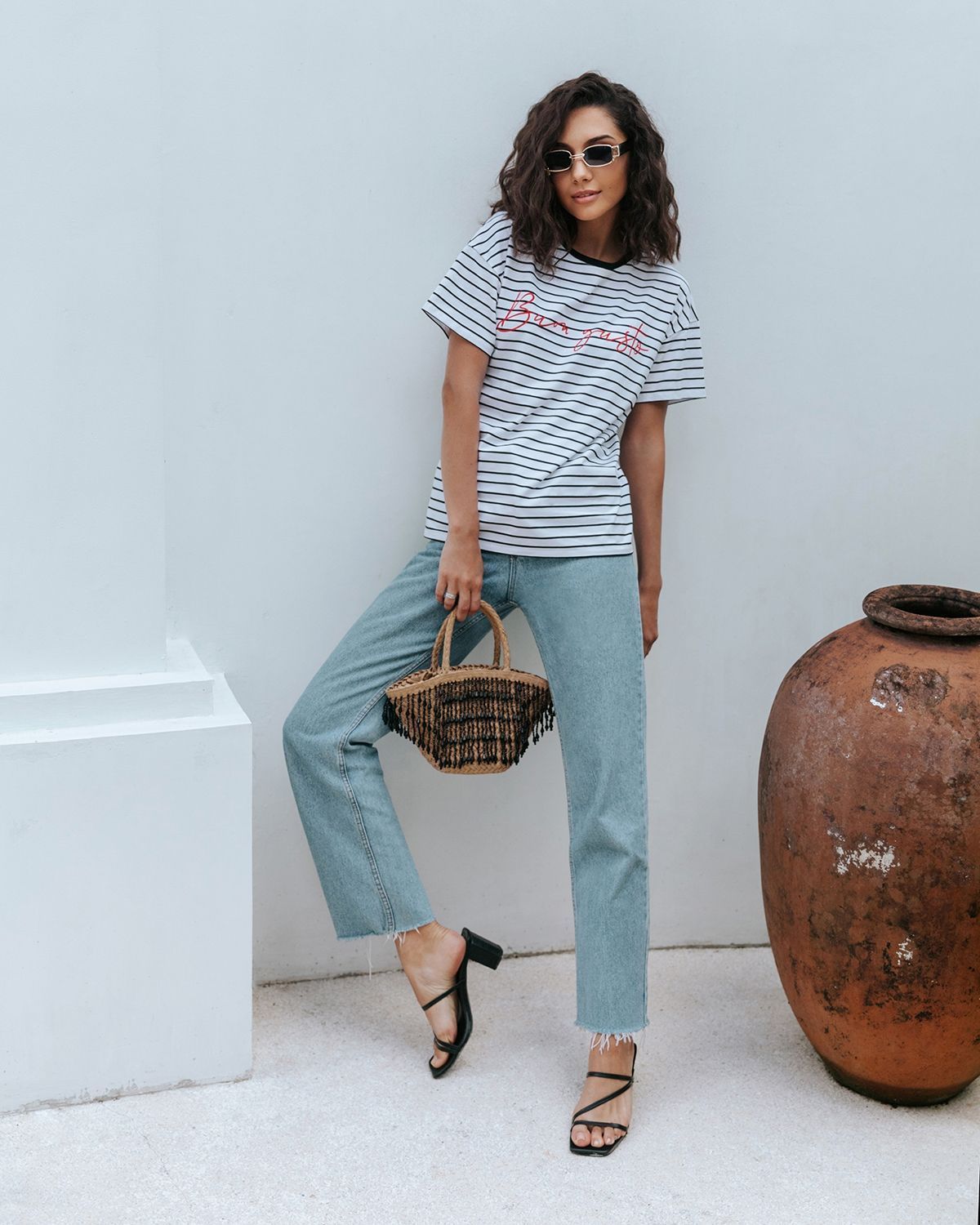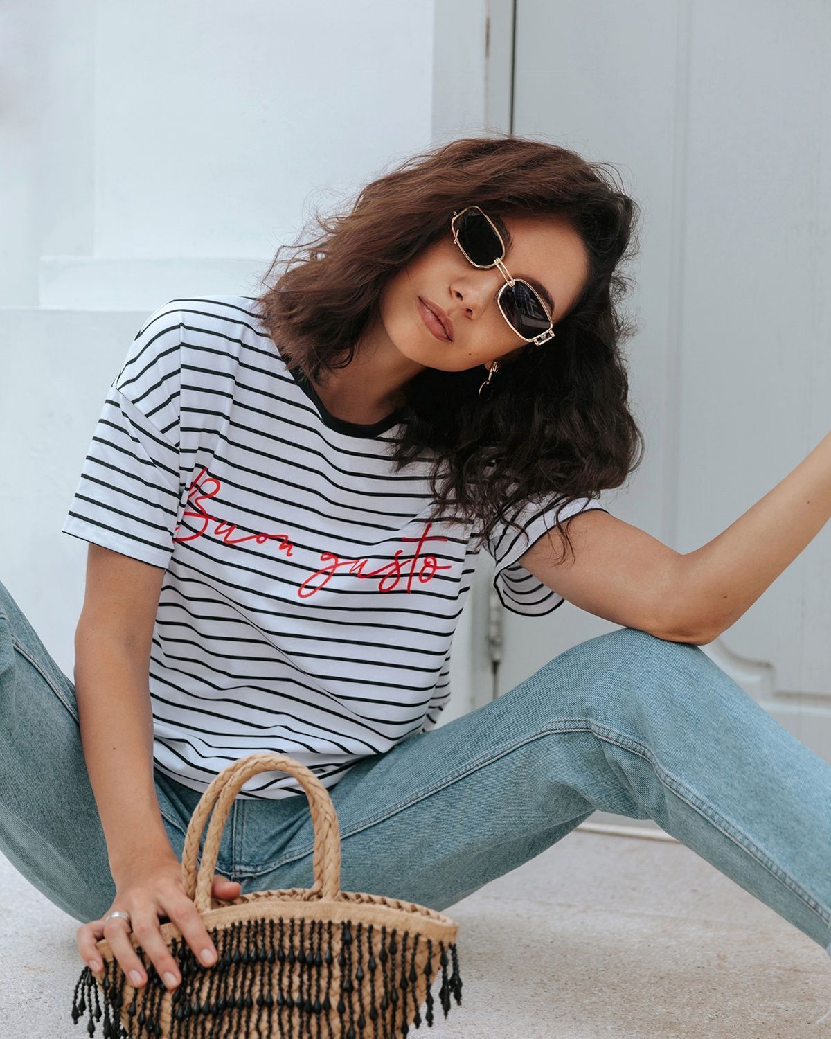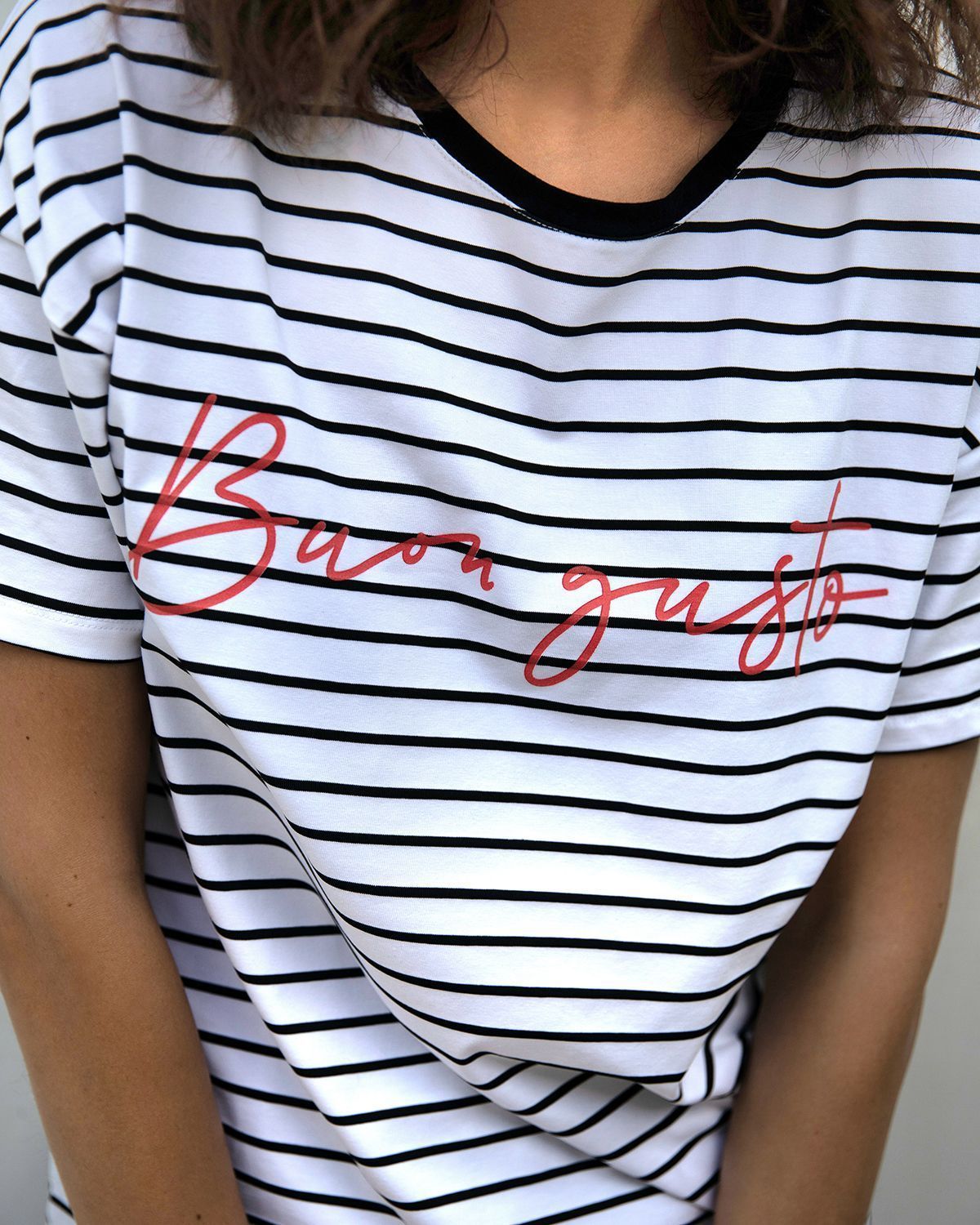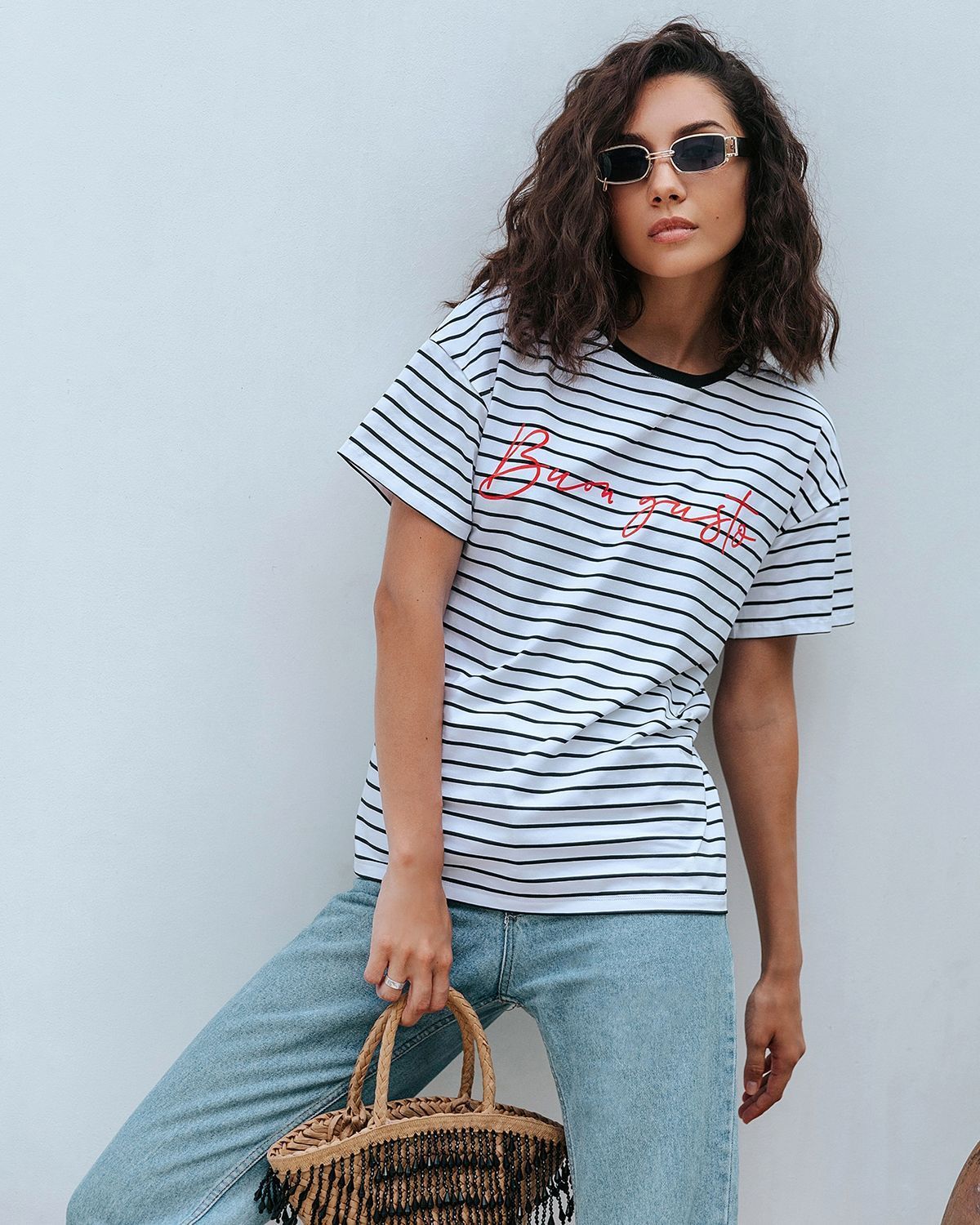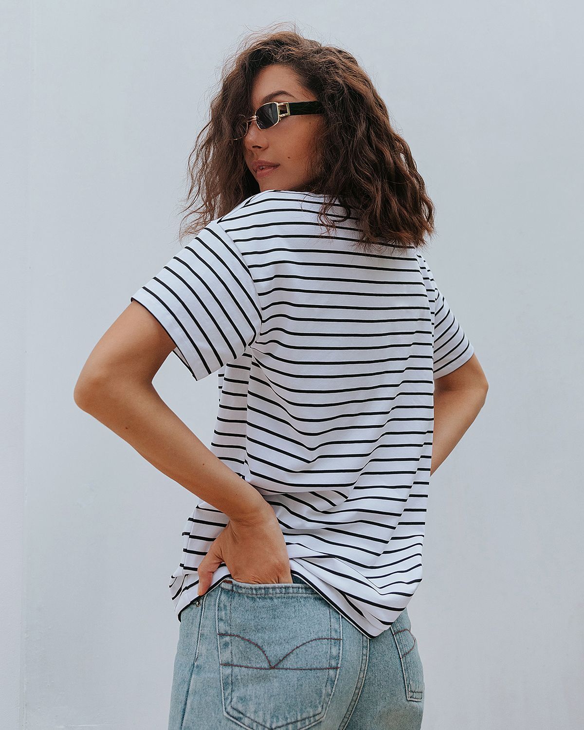 Футболка свободного кроя, которая станет прекрасным дополнением к базовому летнему гардеробу. Полоска актуальна всегда и подходит тем, кому скучно носить простые белые вещи. Футболка оверсайз кроя создает актуальный расслабленный образ. Рукава со спущенной линией плеча прекрасно дополняют его и делают так, что изделие отлично сидит на разных типах фигур. Широкие плечи или узкие — она одинаково хорошо будет смотреться на всех.