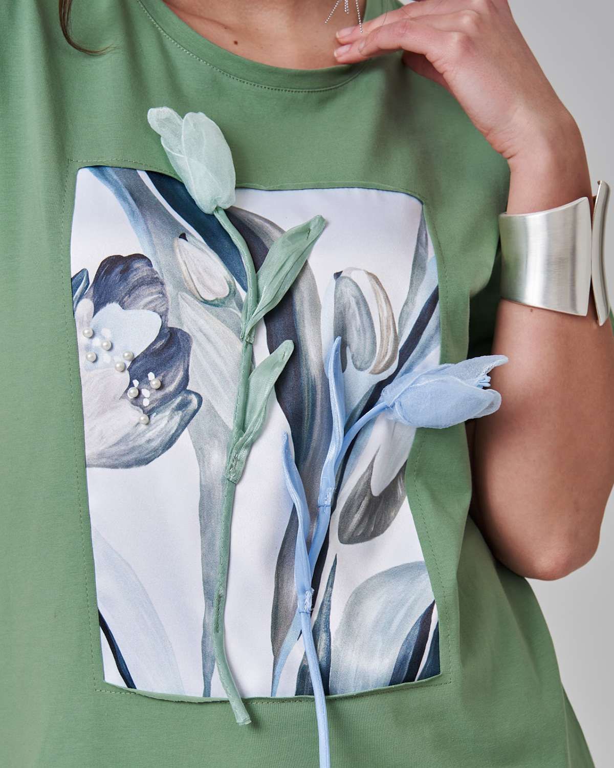 Особенность нашей новинки - нежнейшие цветки тюльпана из органзы, изящно дополняющий авторский рисунок от наших художников. Ещё одна изюминка данной модели - жемчужные бусины, лаконично располагающиеся на бутонах отрисованных цветов. Шелк элегантно переливается и прекрасно сочетается с матовым хлопком.