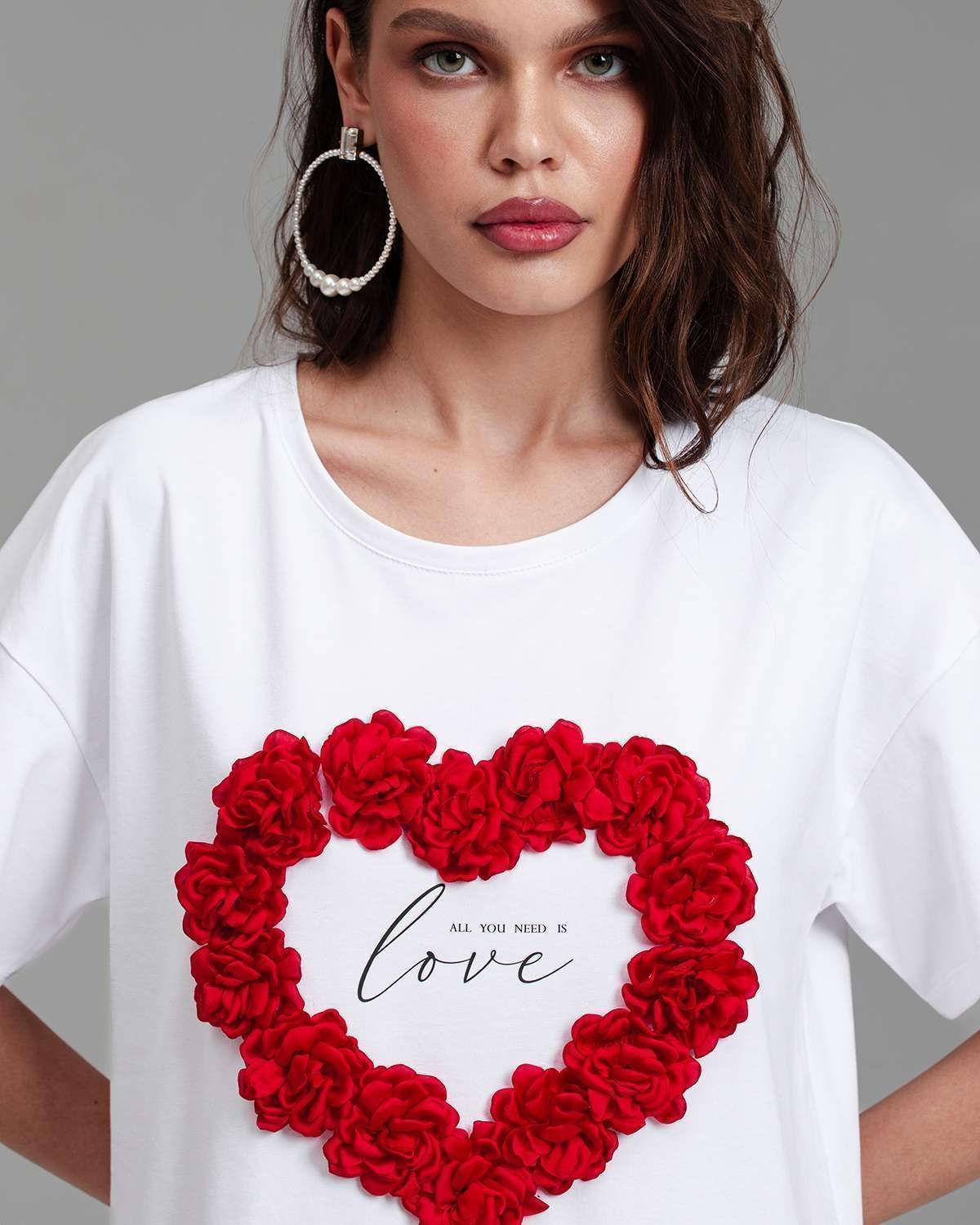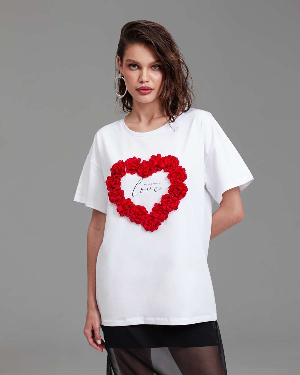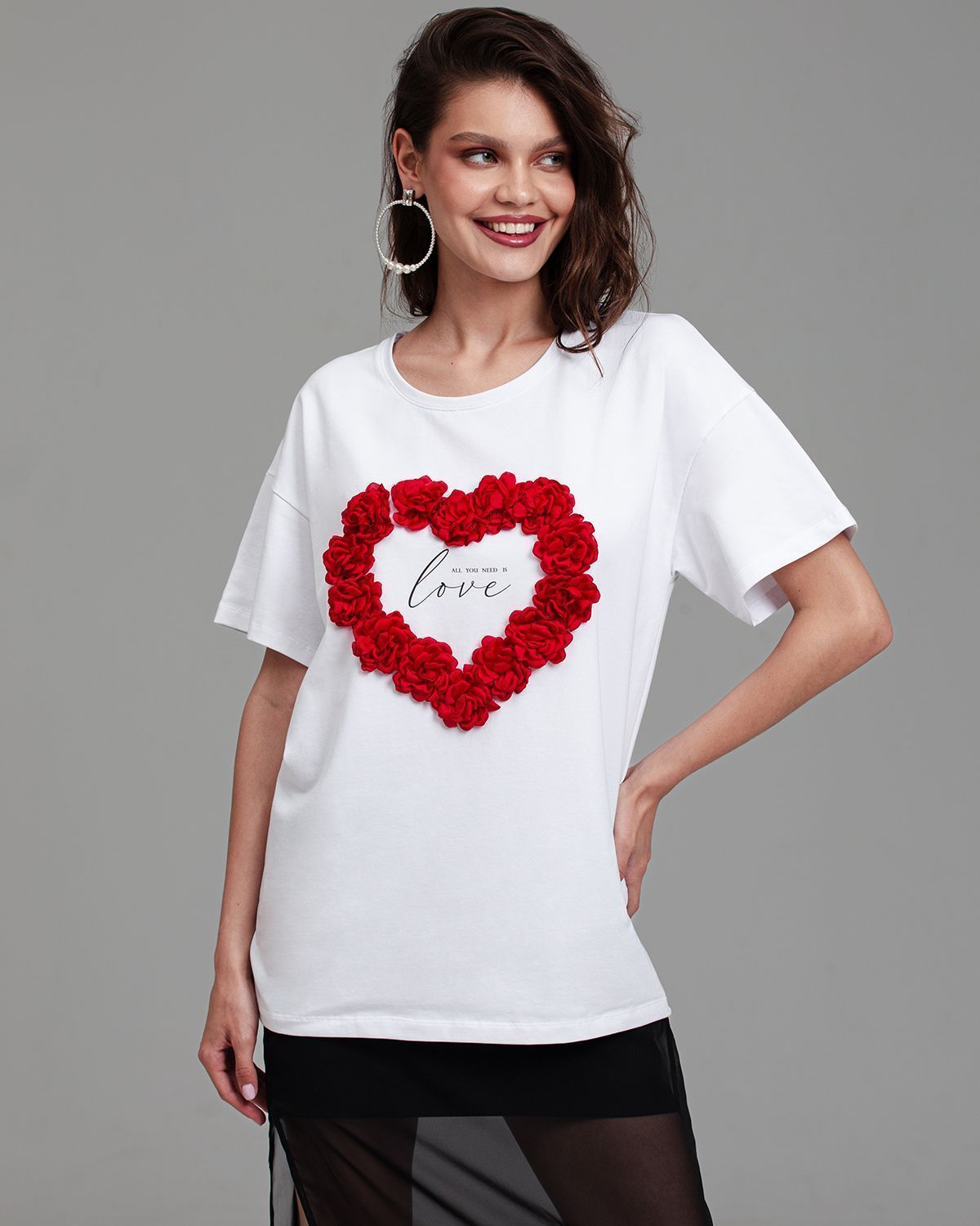 Футболка женская актуального кроя — свободная посадка и широкий рукав, которые подчёркивают современность изделия. Футболка украшена объёмными цветами, расположенными в форме сердца.Её можно носить в заправленном виде и навыпуск.