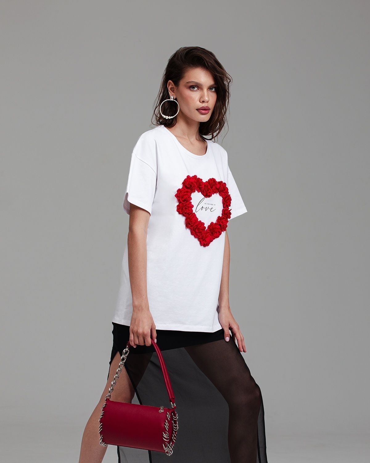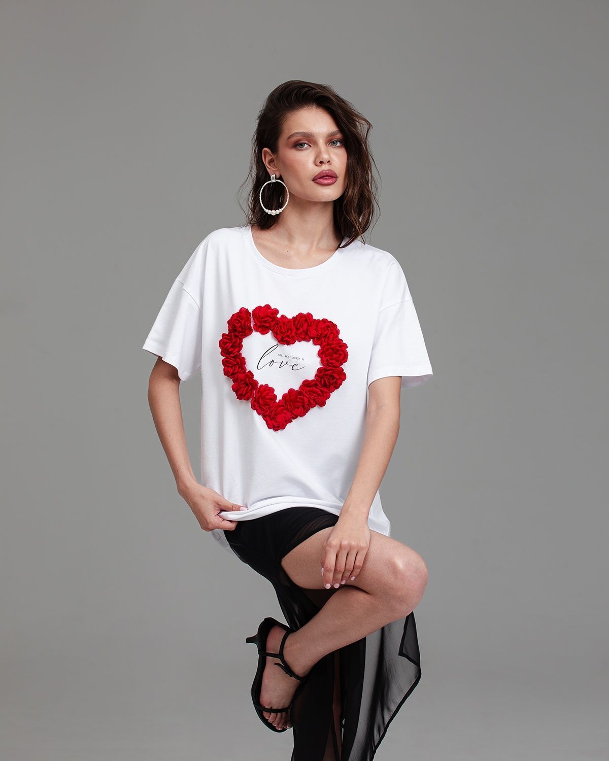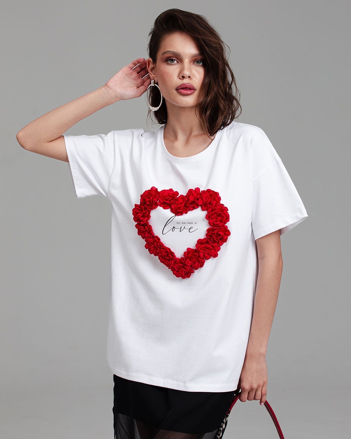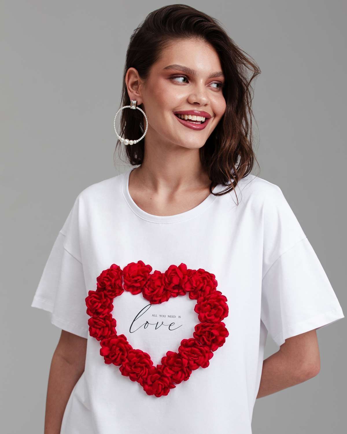 Футболка женская актуального кроя — свободная посадка и широкий рукав, которые подчёркивают современность изделия. Футболка украшена объёмными цветами, расположенными в форме сердца.Её можно носить в заправленном виде и навыпуск.