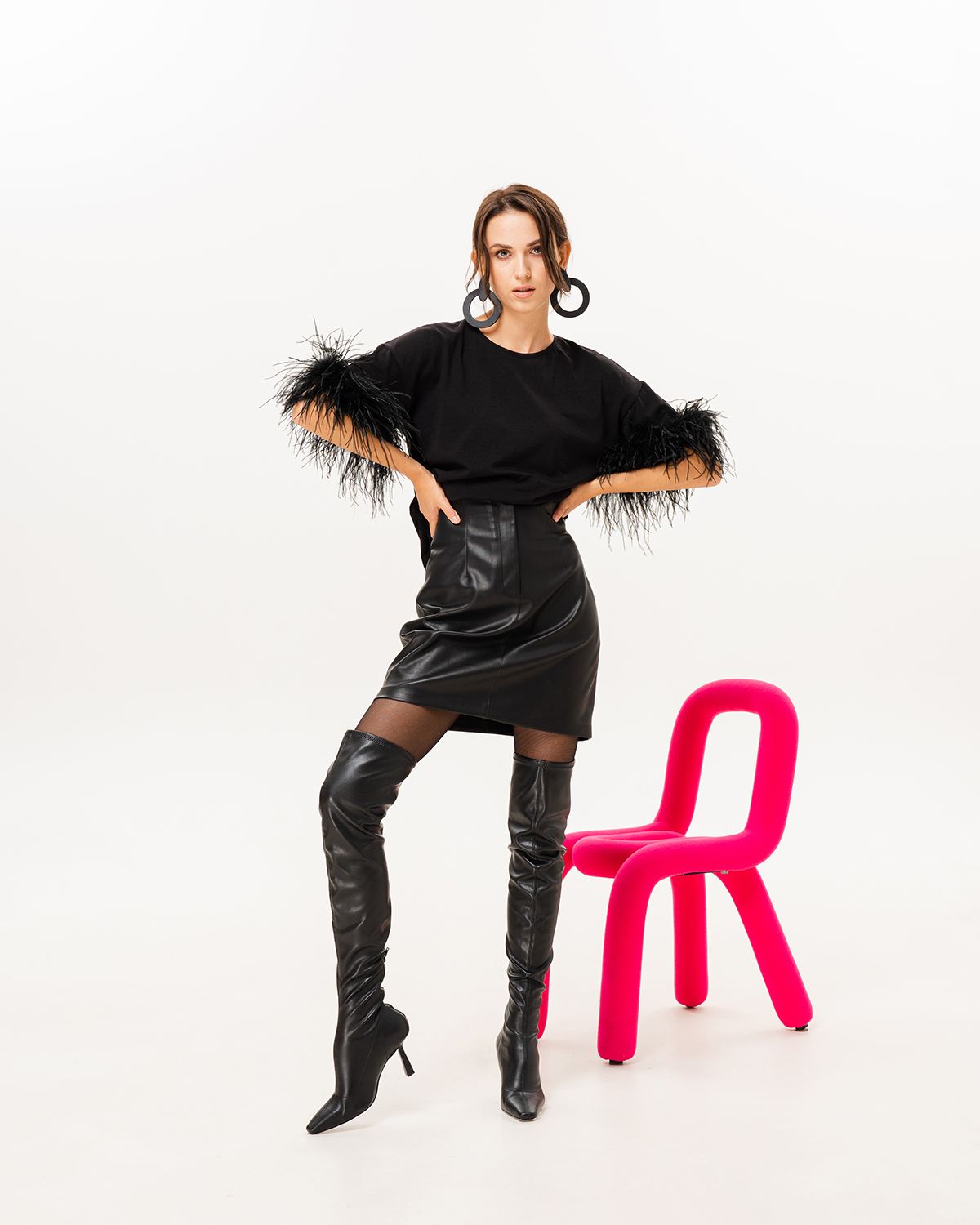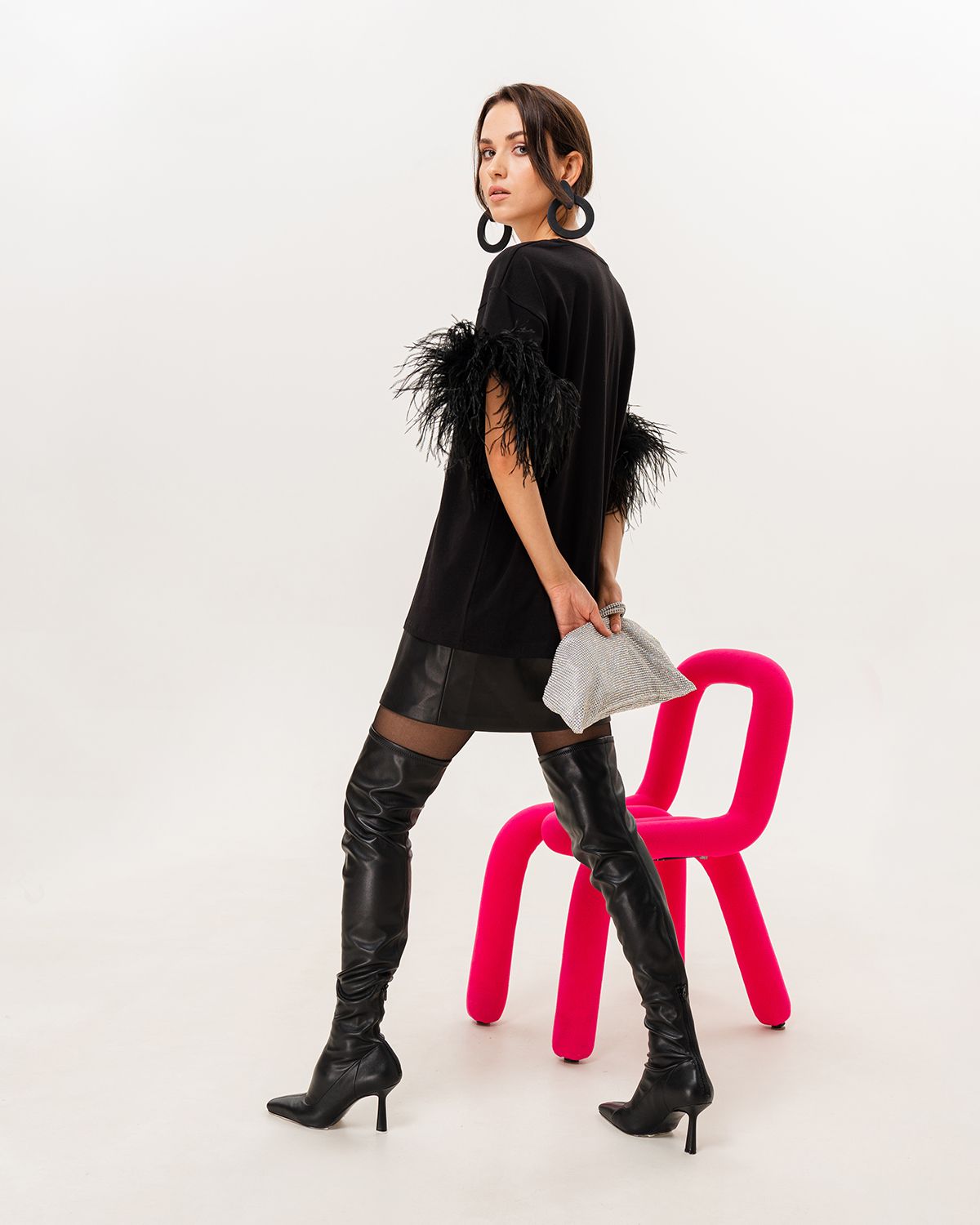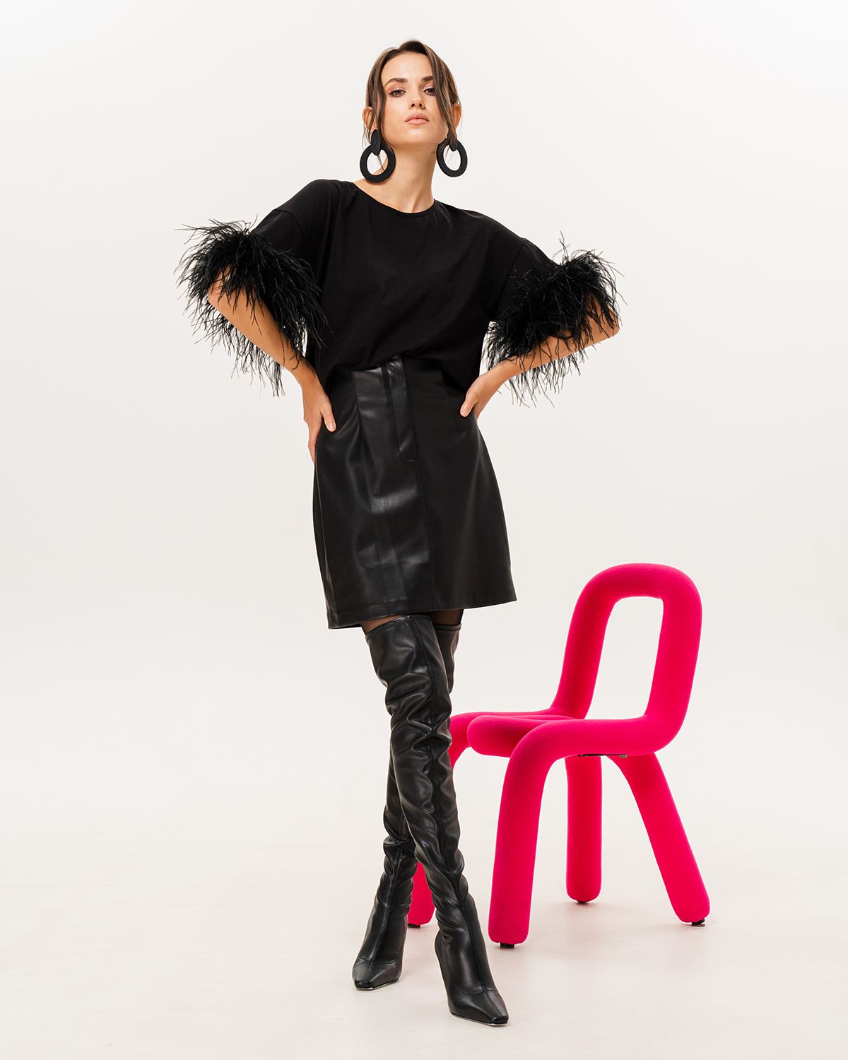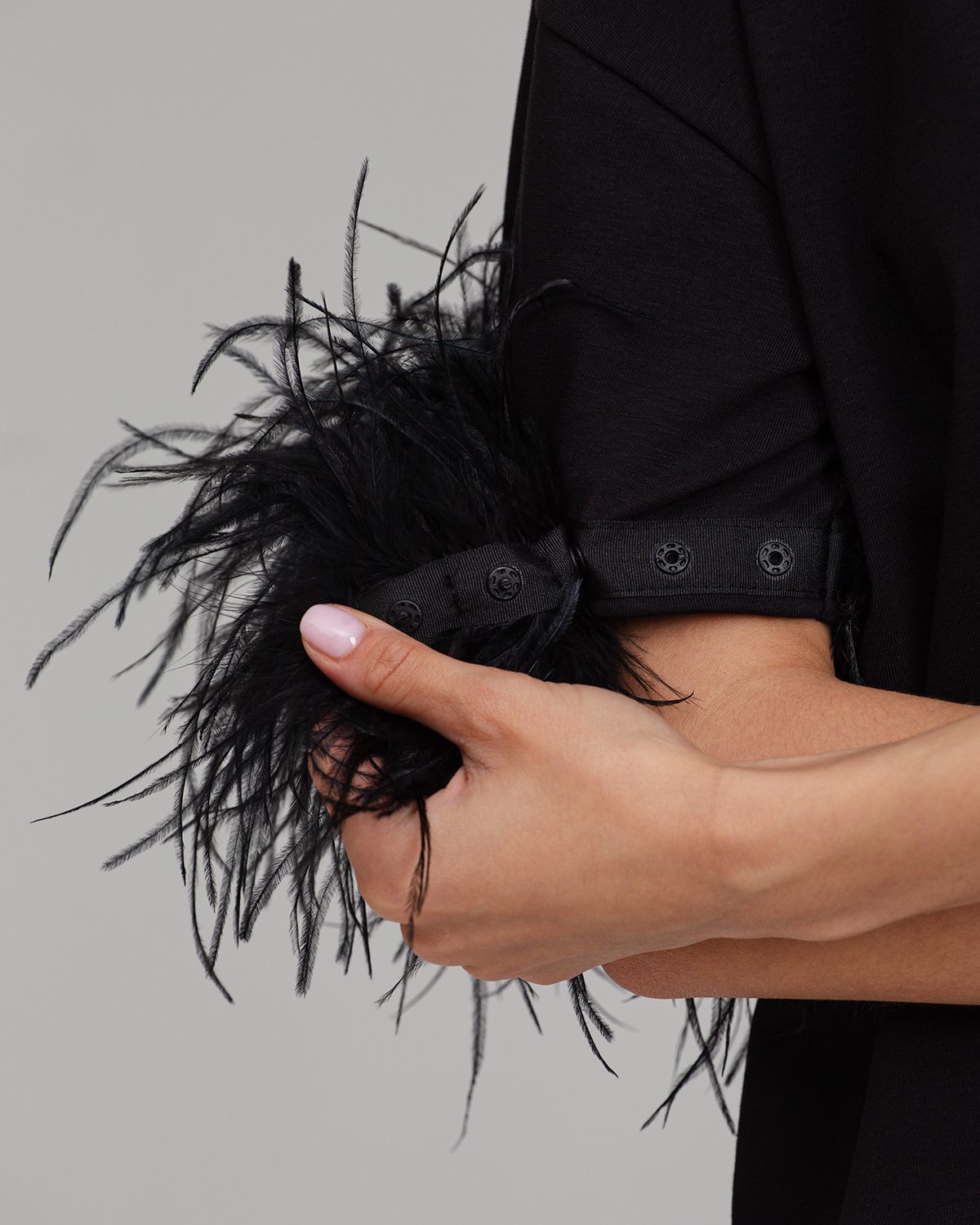 Футболка премиум качества сделана из хлопковой кулирки, которая хорошо держит форму, не скатывается и имеет благородный внешний вид — то, что нужно, чтобы соответствовать изящности страусиных перьев. Ткань удобна в уходе, совершенно не капризна и легко стирается. Перья на футболке съемные, на кнопках.