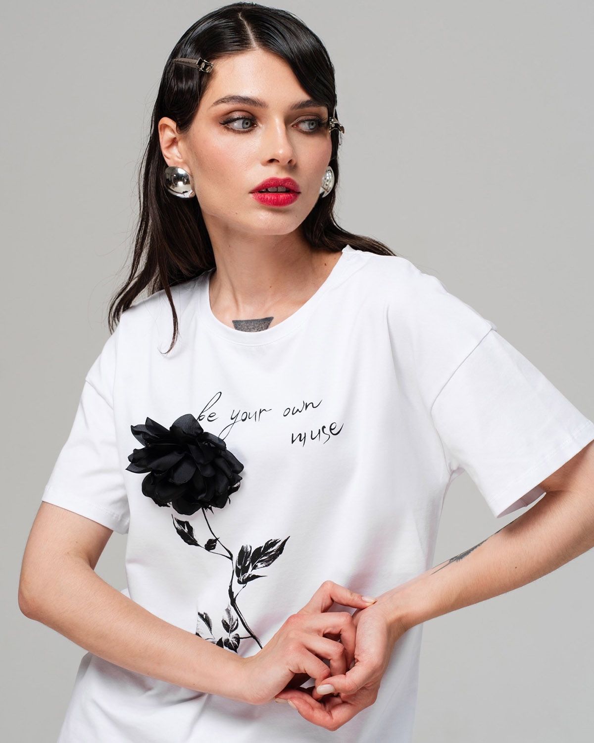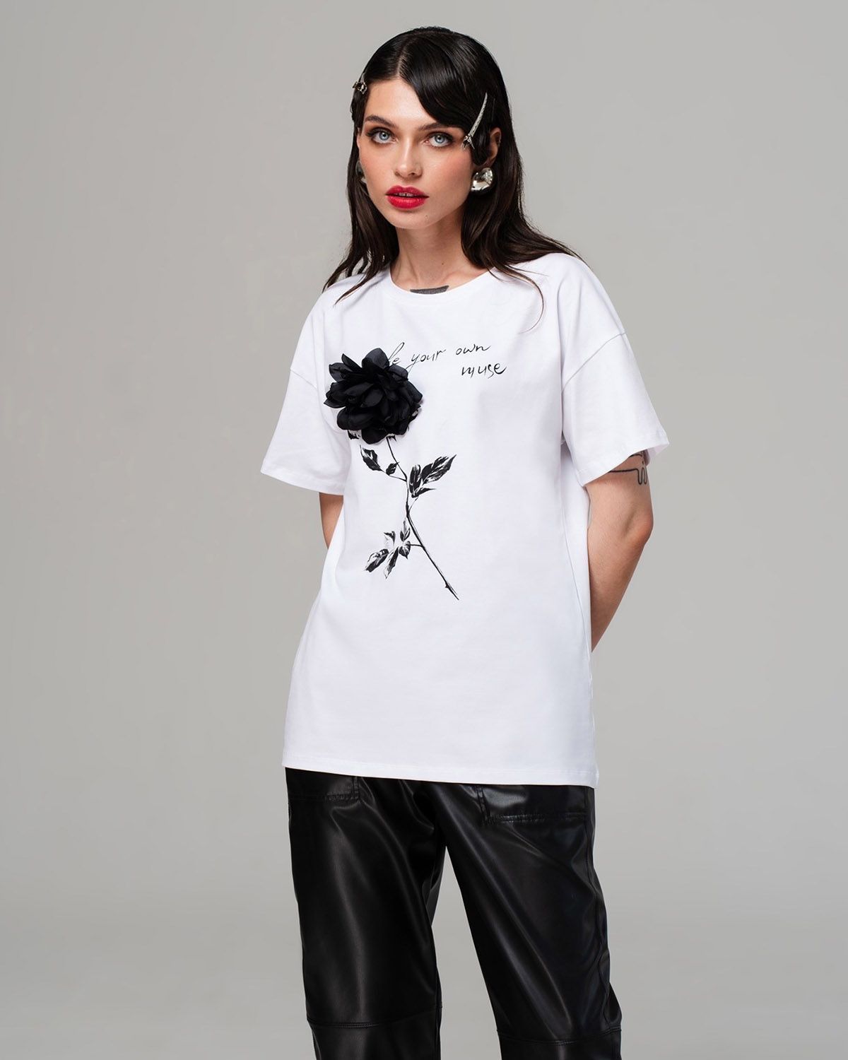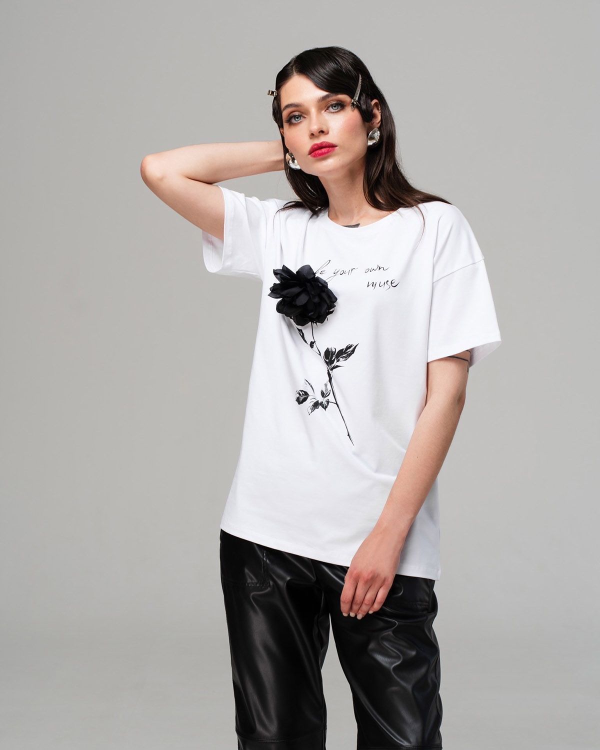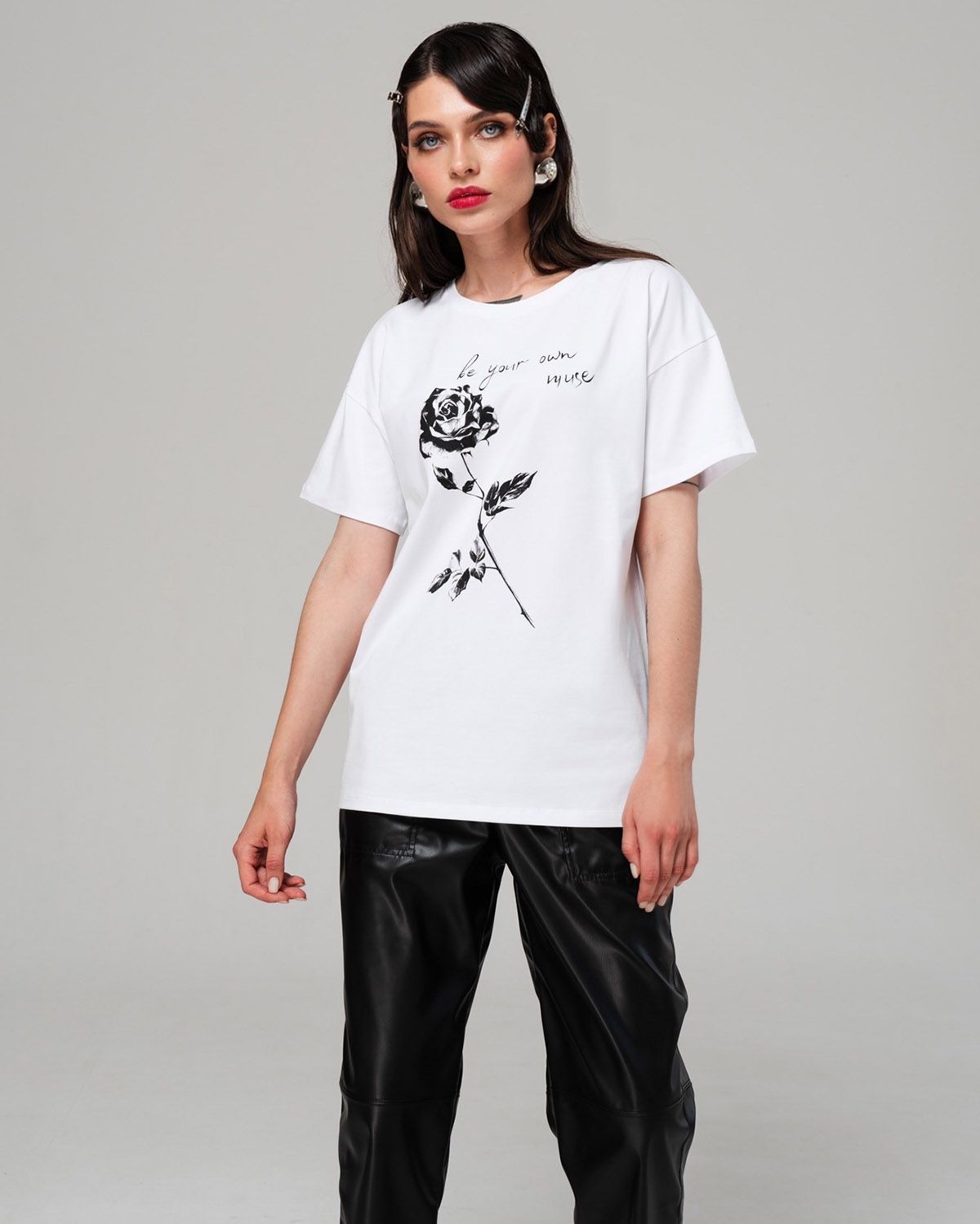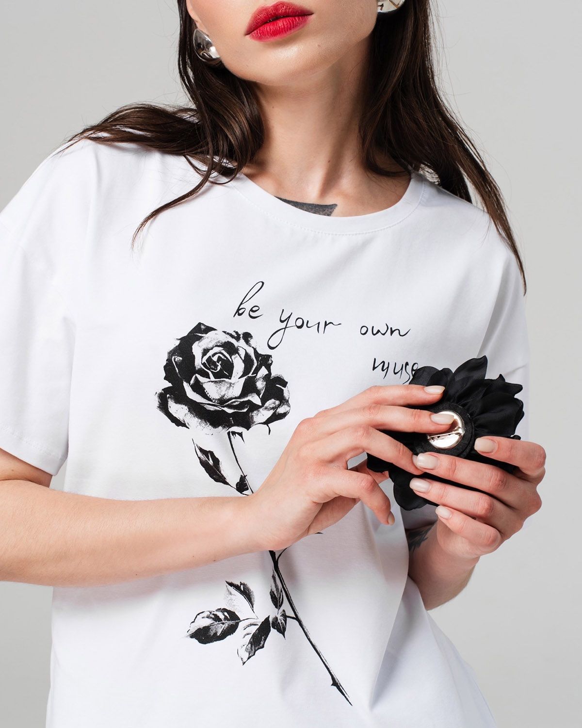 Футболка женская актуального кроя — свободная посадка и широкий рукав, которые подчёркивают современность изделия. Её можно носить в заправленном виде и навыпуск.