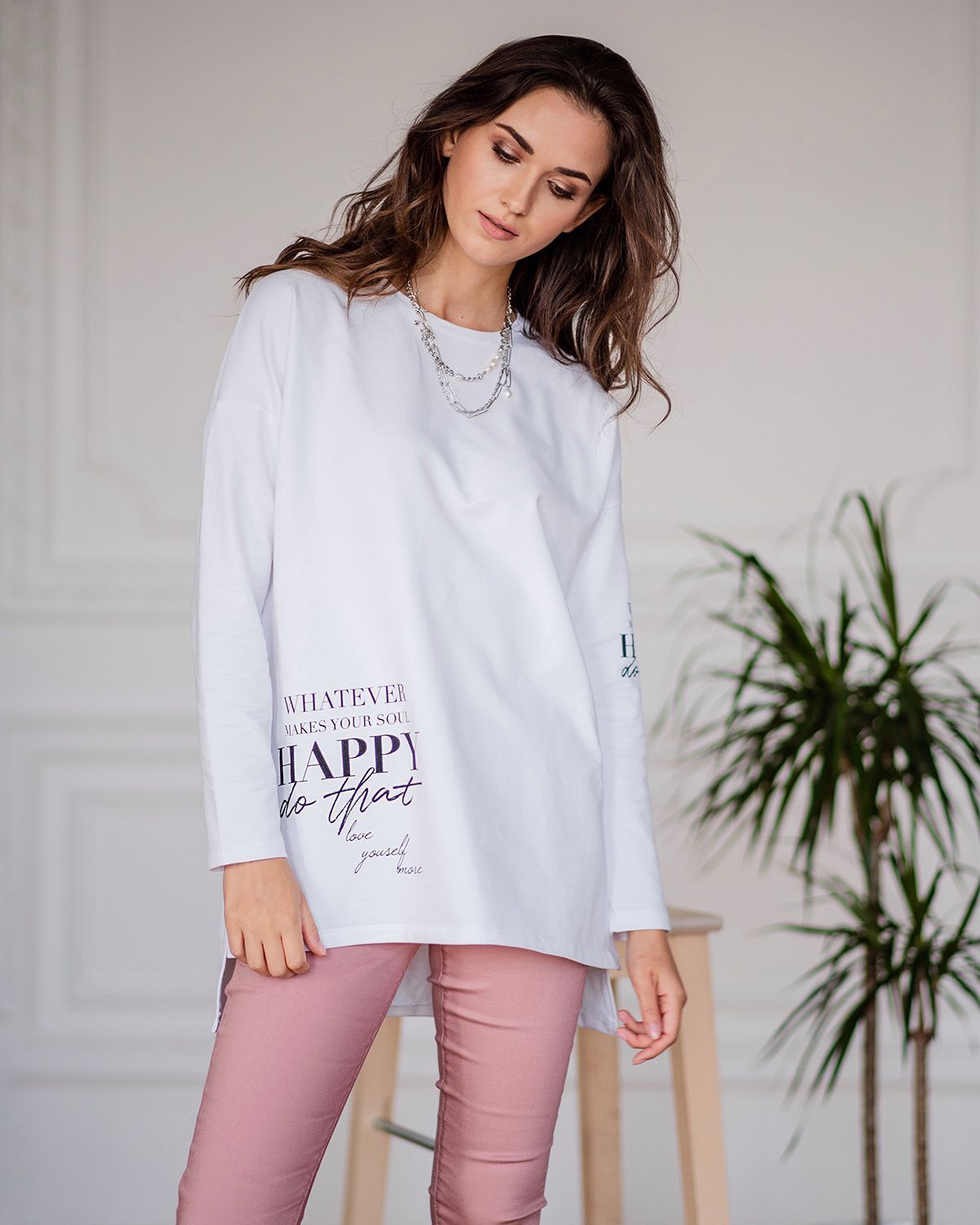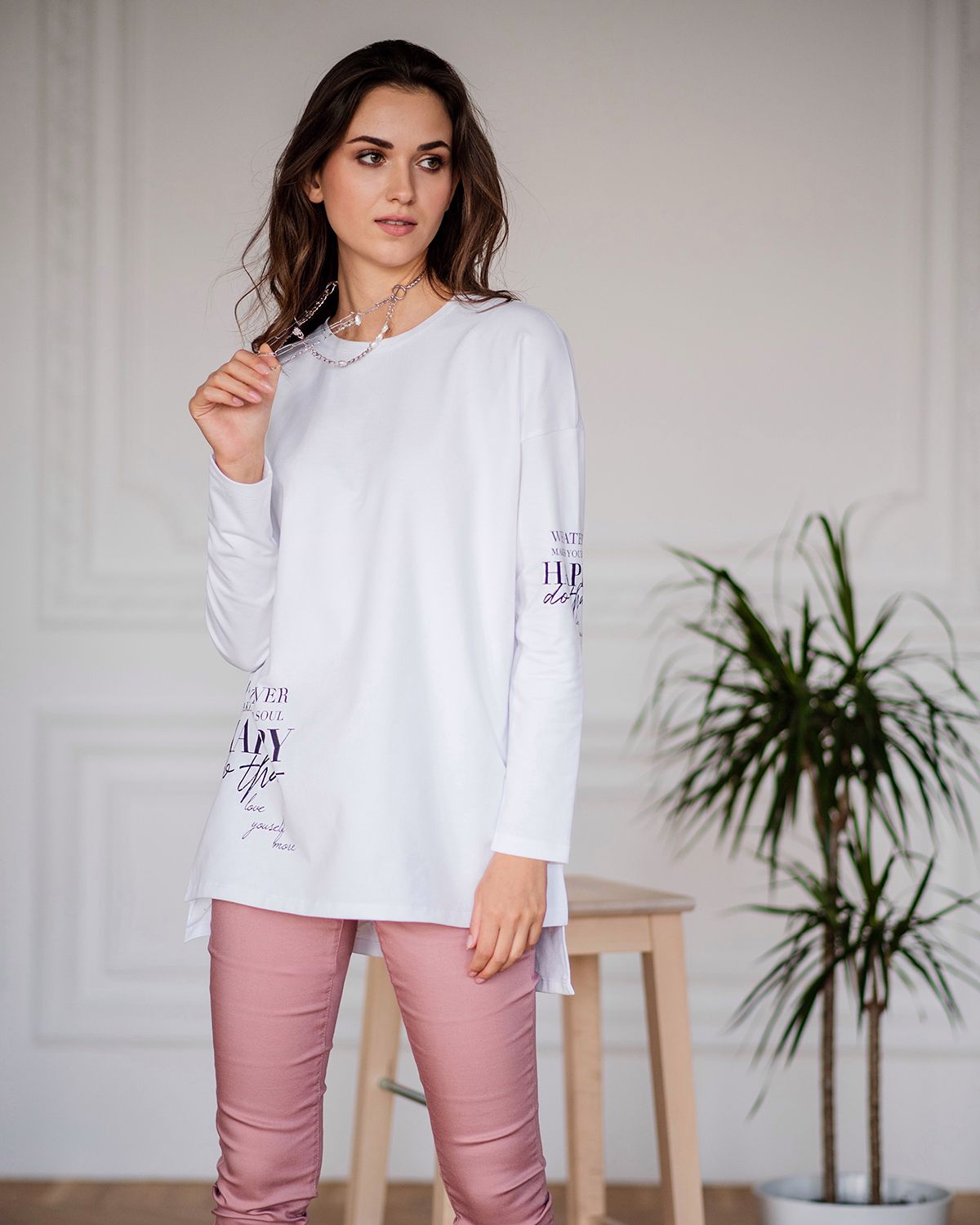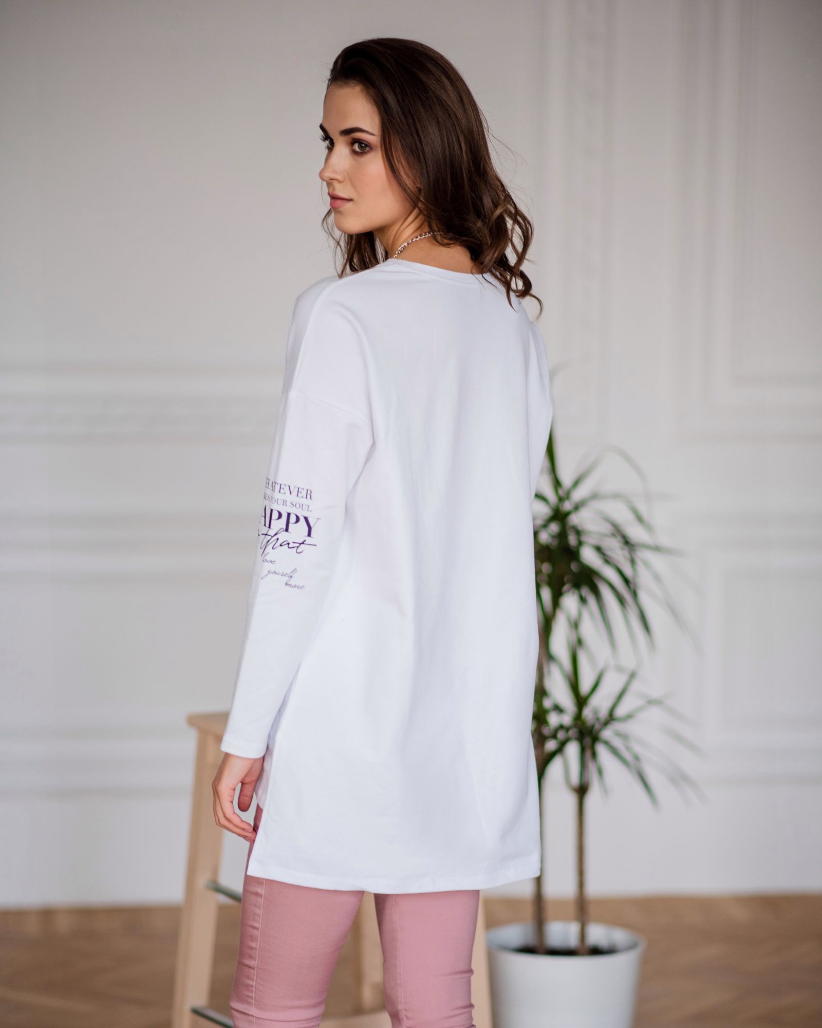 Лонгслив женский из хлопка - для тех, кто ищет нескучную базу с характером. Добавление стильных деталей в минималистичное изделие насыщает его индивидуальностью. Свободная посадка, надписи внизу и на рукаве, универсальная спущенная линия плеча, ассиметричный низ - спинка длиннее, небольшие разрезы по бокам - это как раз те нюансы, которые делают лонгслив с рукавами изделием со вкусом.