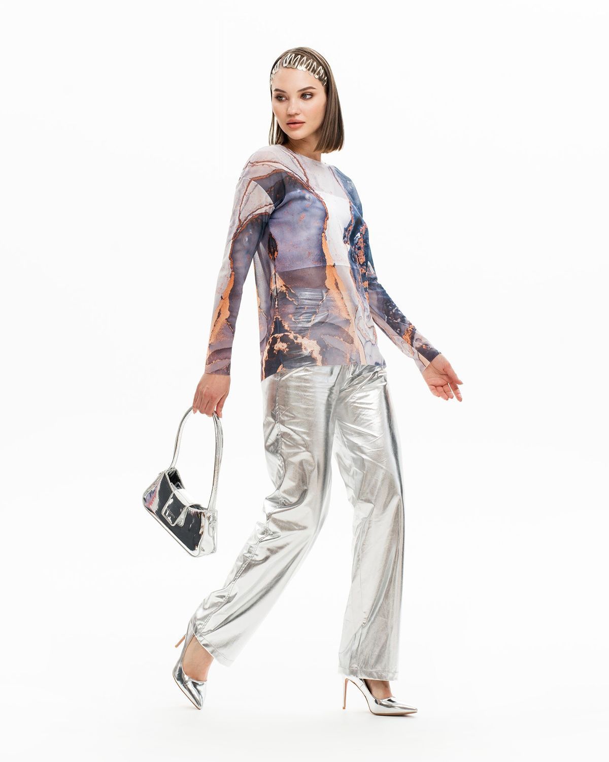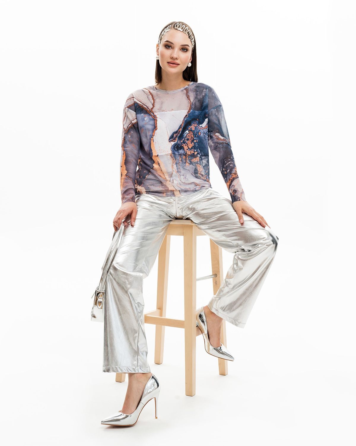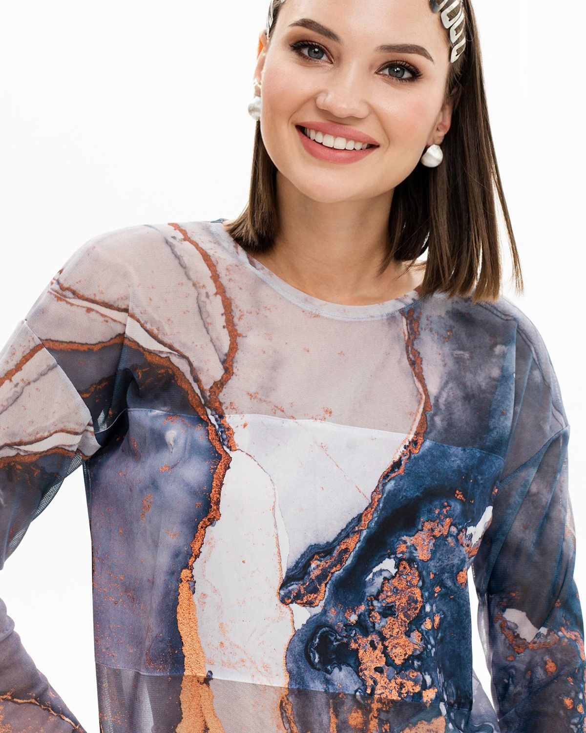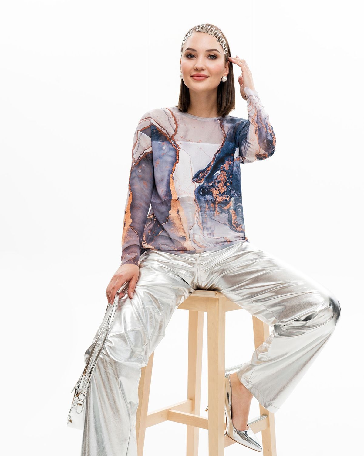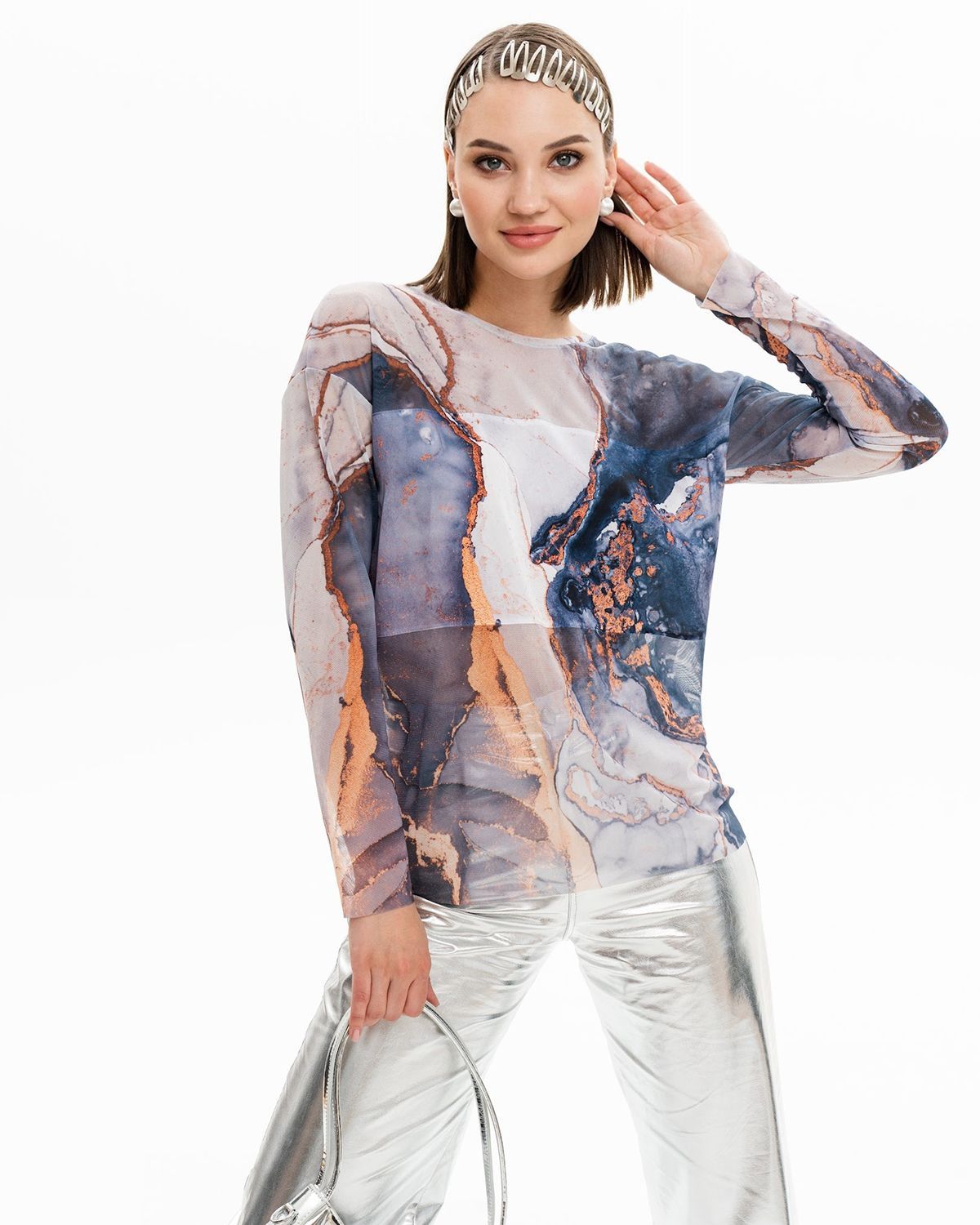 Сеточка с принтом «Мрамор» придаёт ему уникальный и изысканный вид, а тонкая кофточка нежно струится по телу, создавая кокетливый силуэт. Блузка с атласной вставкой добавляет нотку элегантности и шиковости, делая этот лонгслив особенно привлекательным для вечернего выхода.