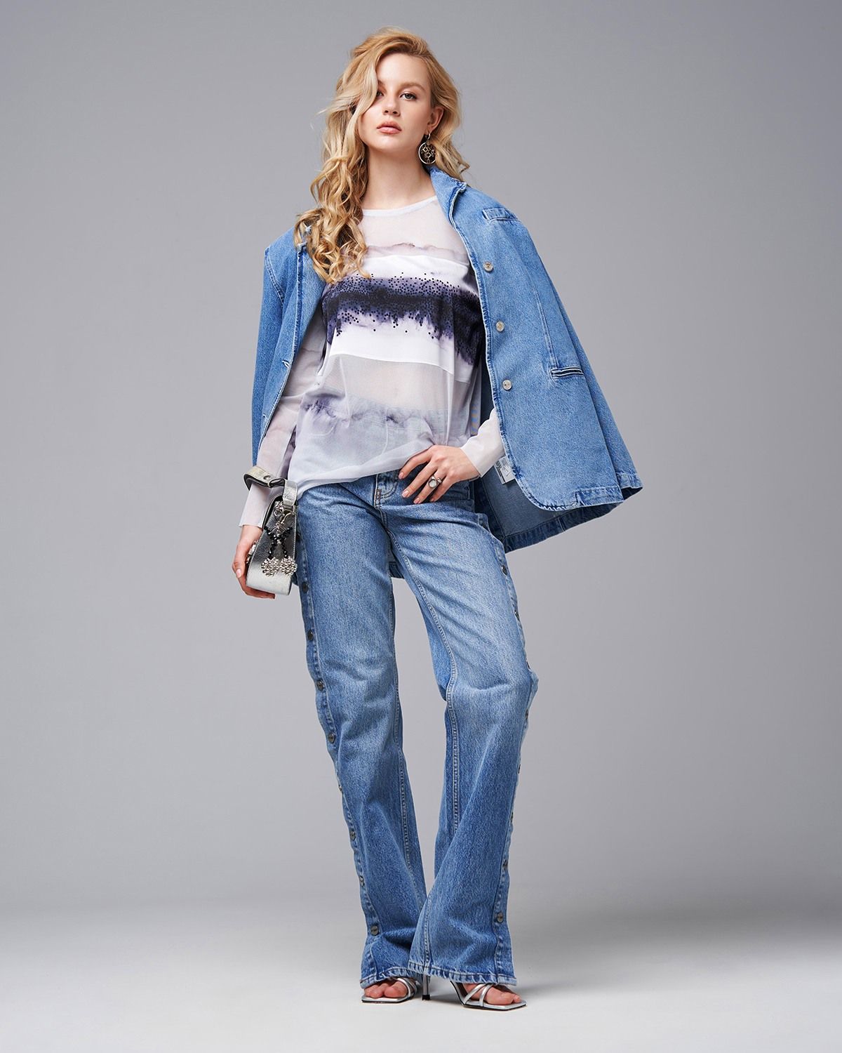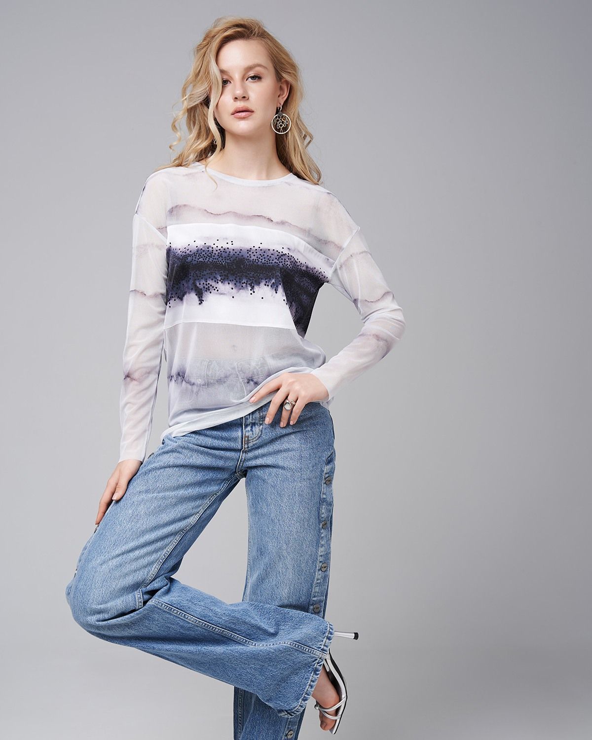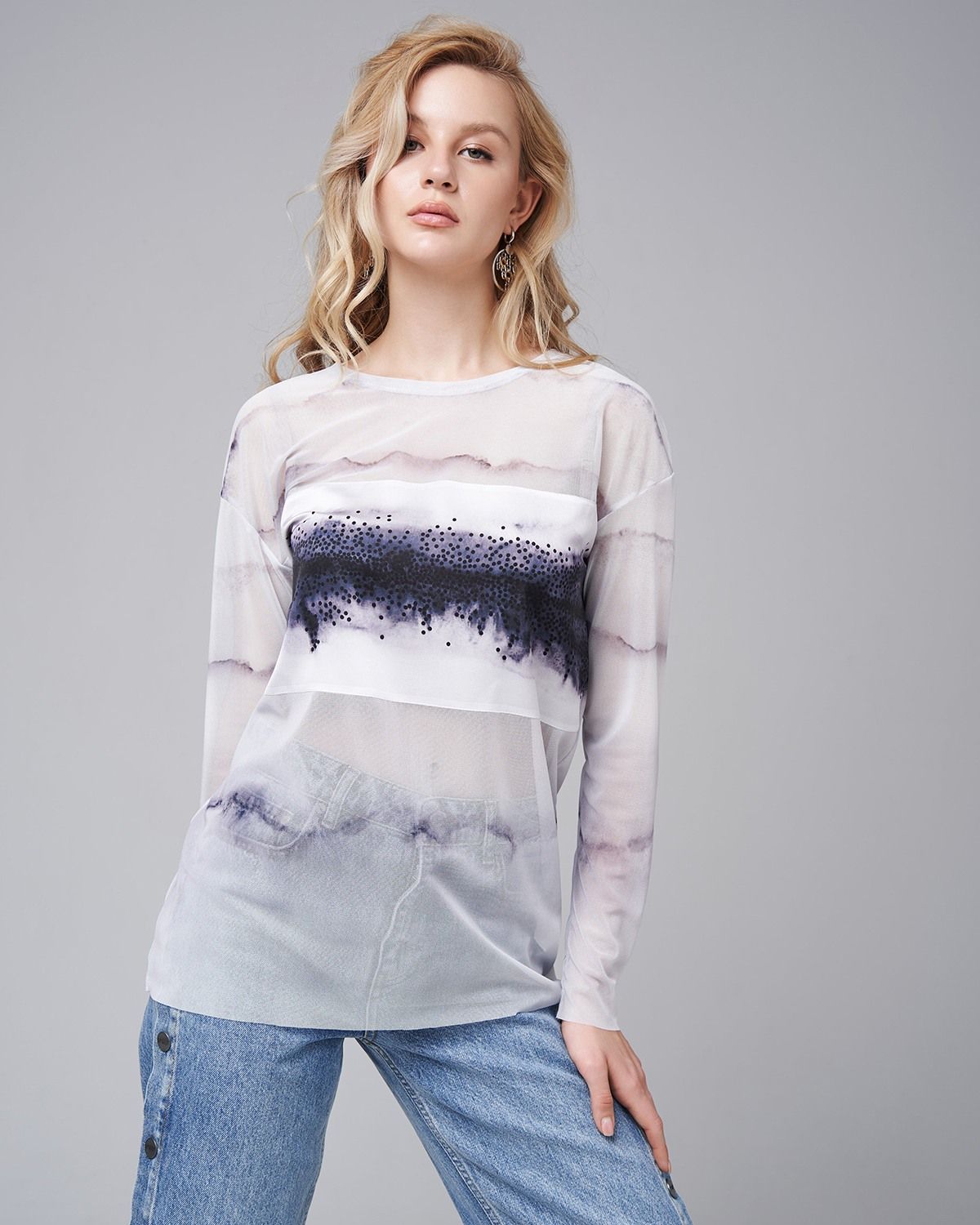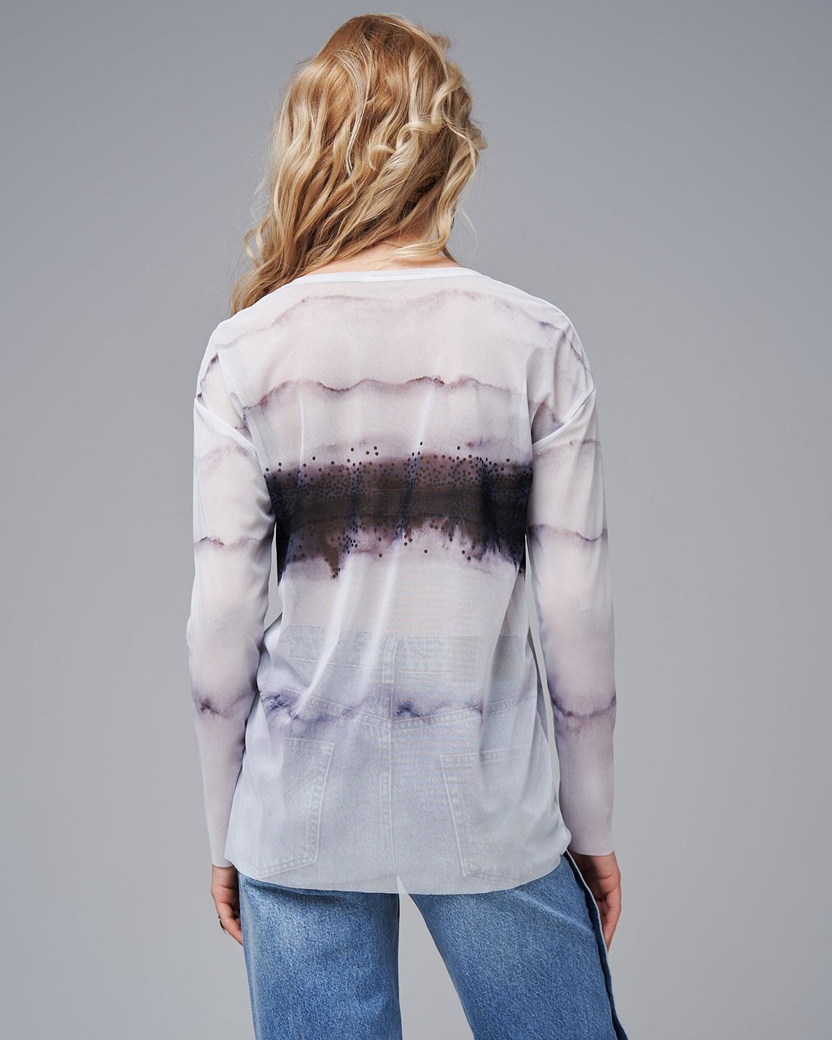 Свободный крой позволяет активно двигаться. Обратите внимание, края изделия не обрабатываются швами, чтобы сохранить эффект полупрозрачности, тонкости и нежности лонгслива. Удлинённый рукав добавляет загадочность образу. Вставка на груди, декорированная авторским принтом, становится акцентом, притягивающим взгляды и вызывающим восхищение.