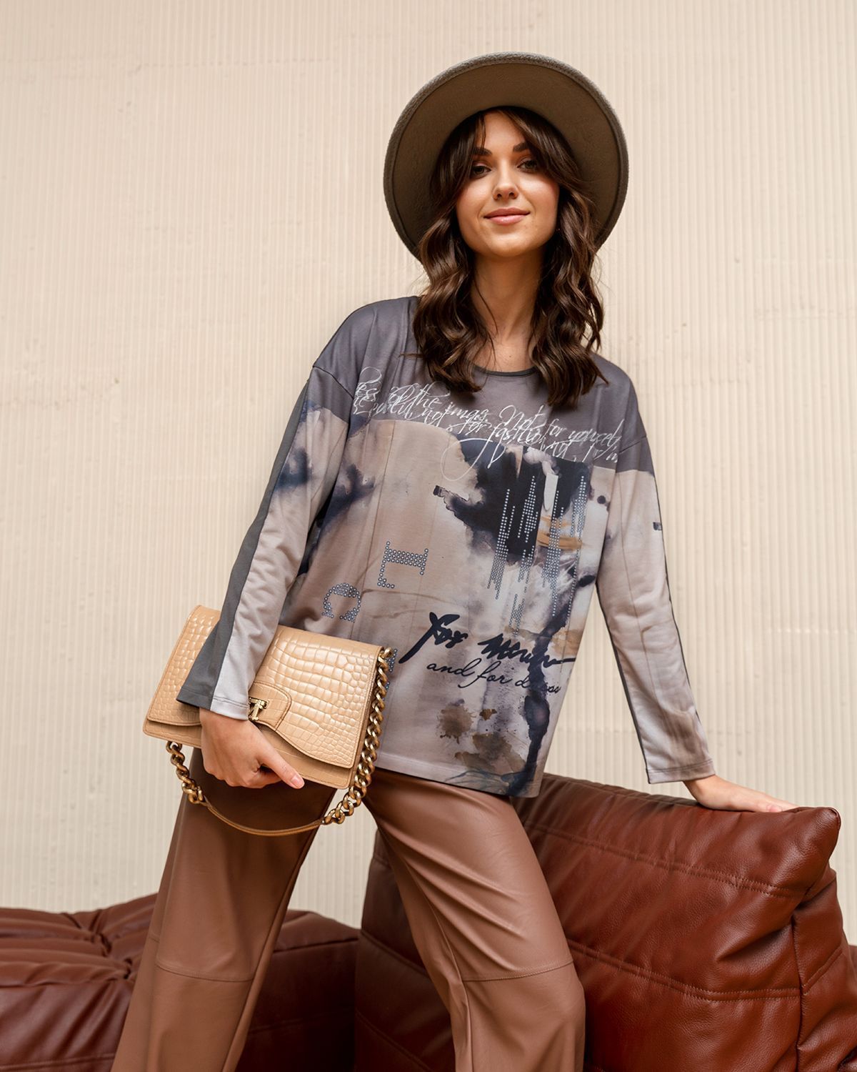 Трикотажная кофта с длинным рукавом сделана из двух видов ткани: спереди вискозное полотно с принтом, а сзади однотонная кулирная гладь.
