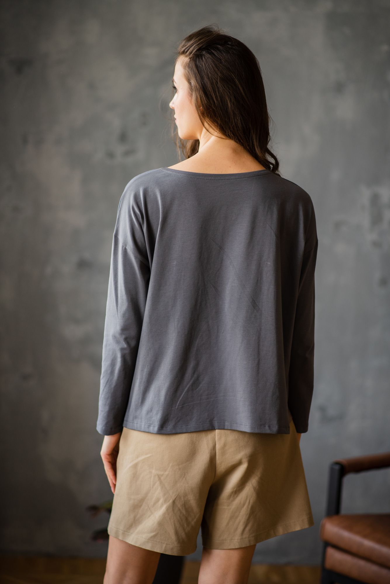 Лонгслив женский - свободная модель с интересным дизайном. Спущенная линия плеча делает изделие универсальным, оно будет отлично смотреться на любых типах фигур. Контраст свободного кроя и более облегающих рукавов добавляет образу хрупкости и лёгкости, а также создаёт стильный трендовый лук.