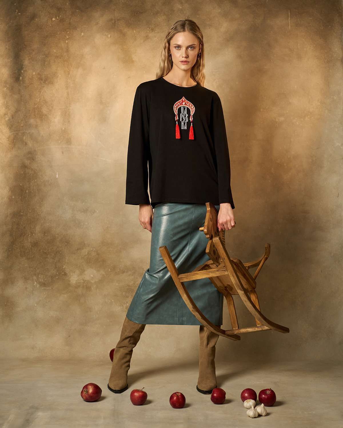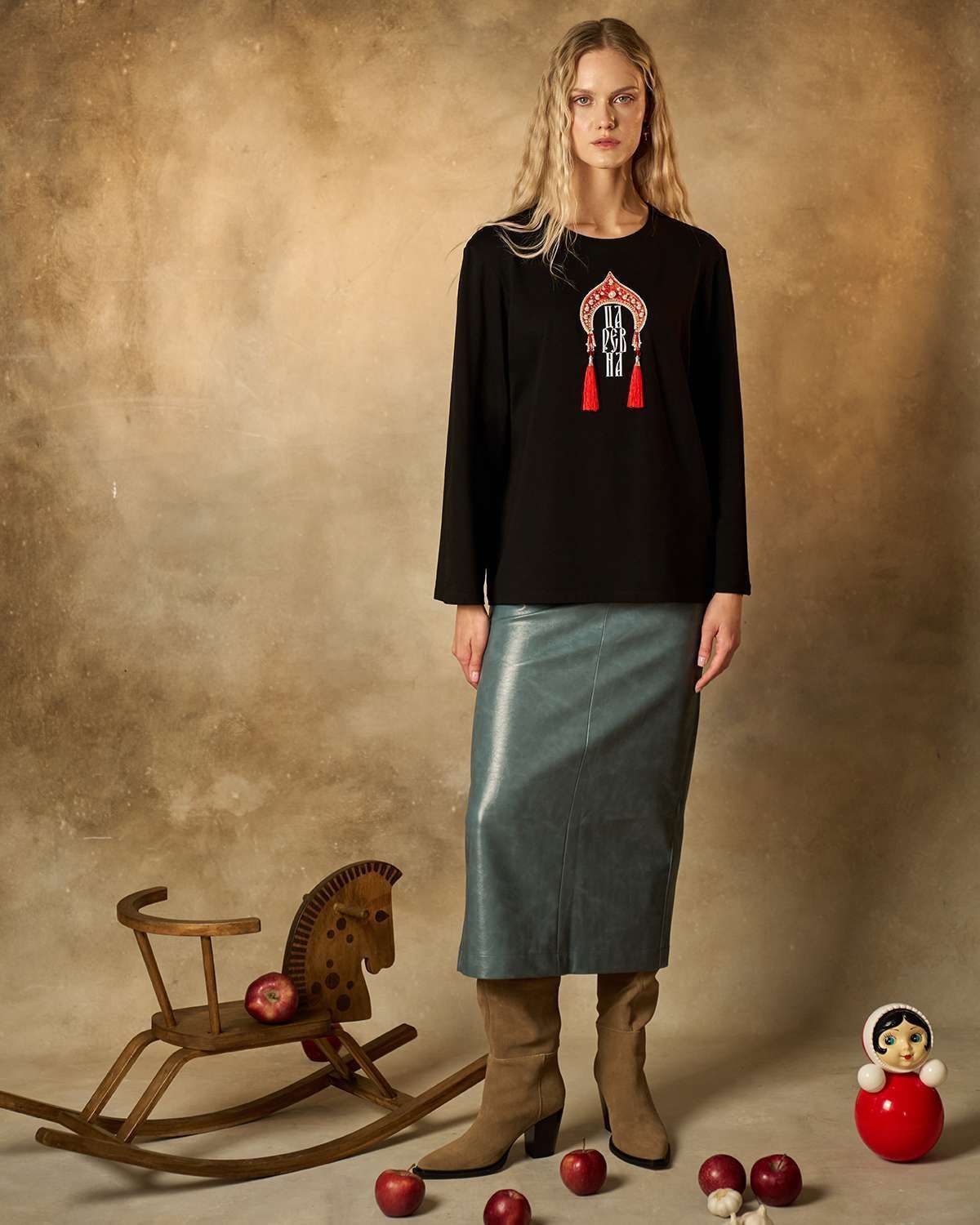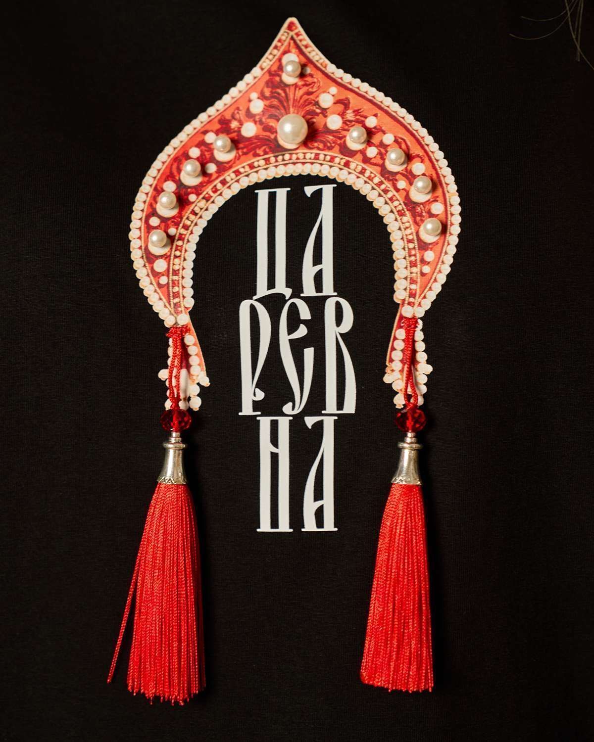 Хлопковый лонгслив классического кроя с прямыми рукавами. Передняя часть изделия украшена оригинальной печатью в форме традиционного русского головного убора — кокошника. Под изображением кокошника расположена надпись "Царевна", гармонично вписанная в общий образ. Кокошник декорирован бусинами жемчужинами и эффектными объемными кисточками с роскошной бахромой, придающими изделию особую изысканность и шарм. Лонгслив идеально подойдет поклонникам этнического стиля и станет ярким акцентом любого образа.