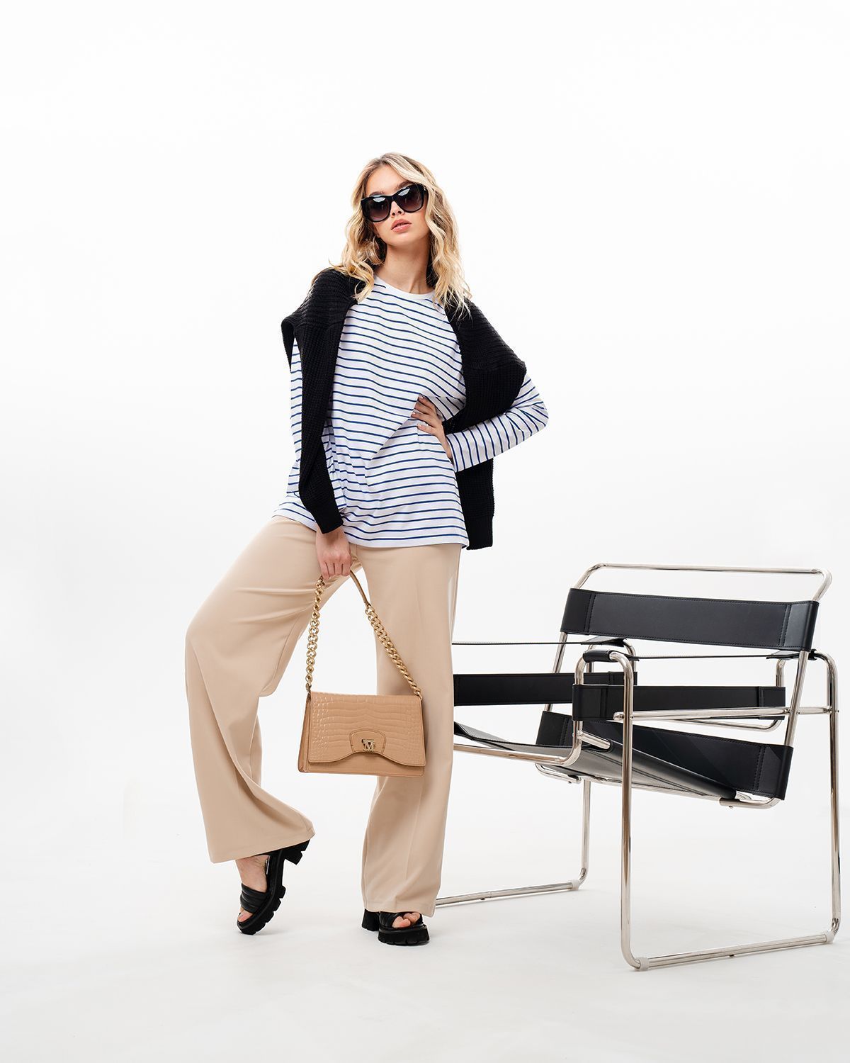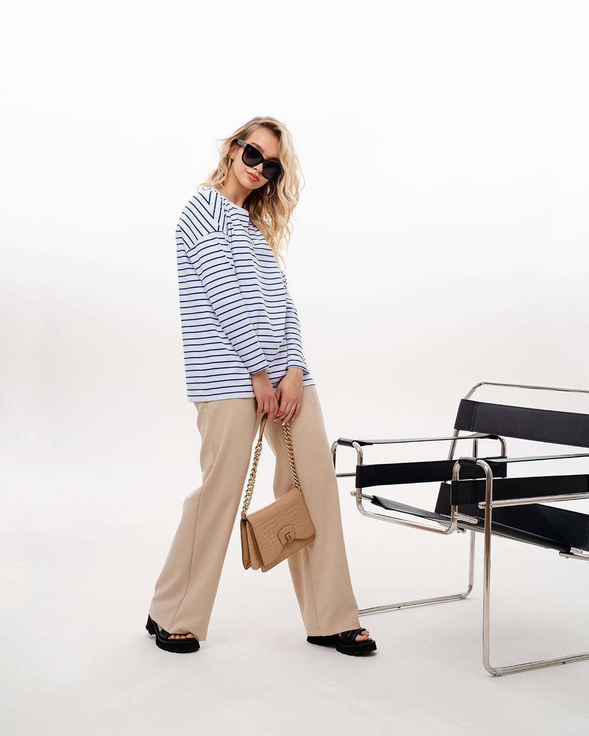 Базовый лонгслив в полоску — легкая модель для создания расслабленных спокойных образов. Сделан он из приятной для тела хлопковой кулирки. Это ткань, которая дышит, гипоаллергенна и не вызывает раздражений. Мягкая и эластичная кулирка хорошо переносит стирки и служит долго. Поэтому можете быть уверены, что изделие с вами на несколько сезонов. Поставщиком ткани для нас является Турция.