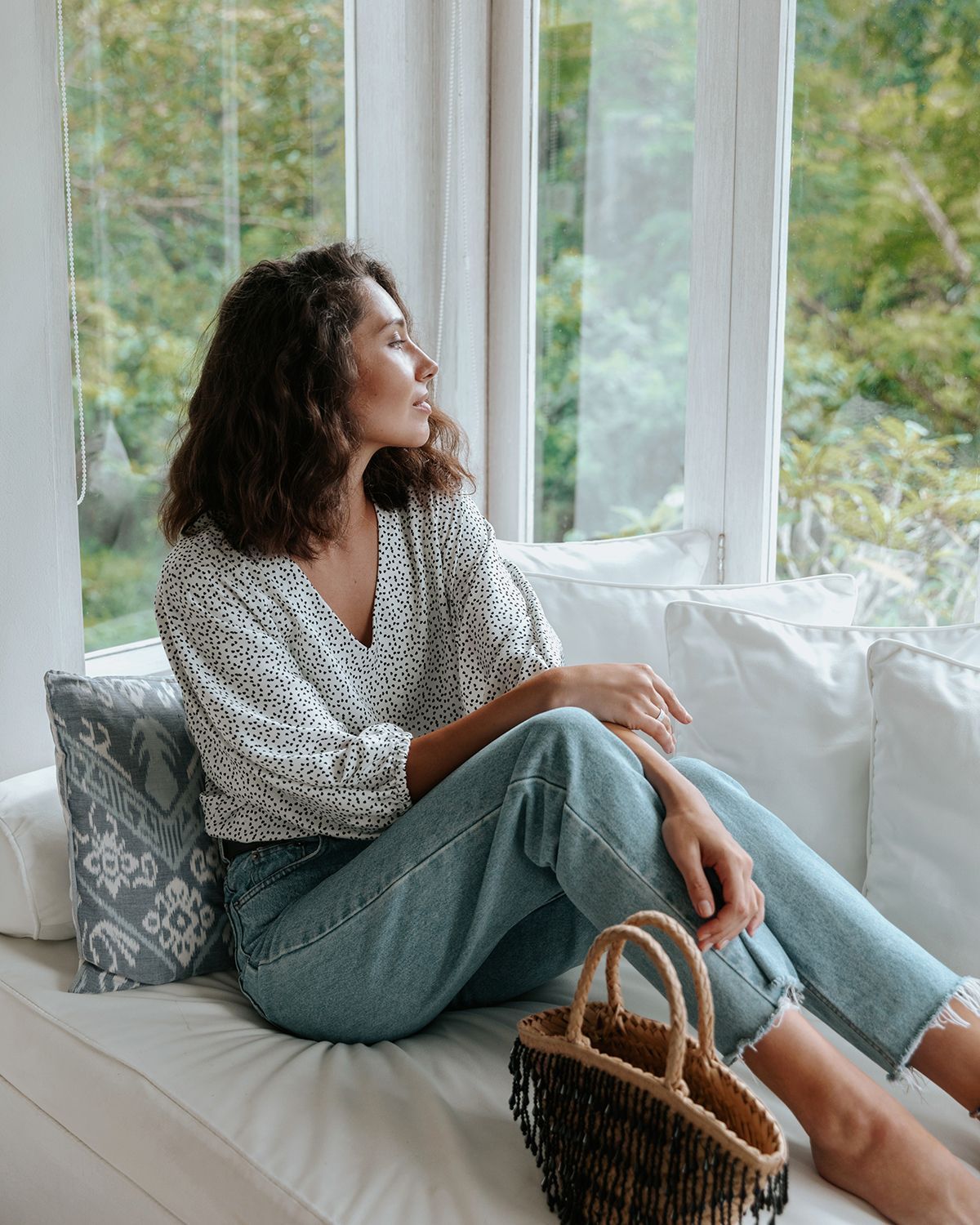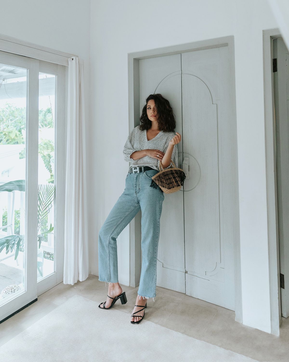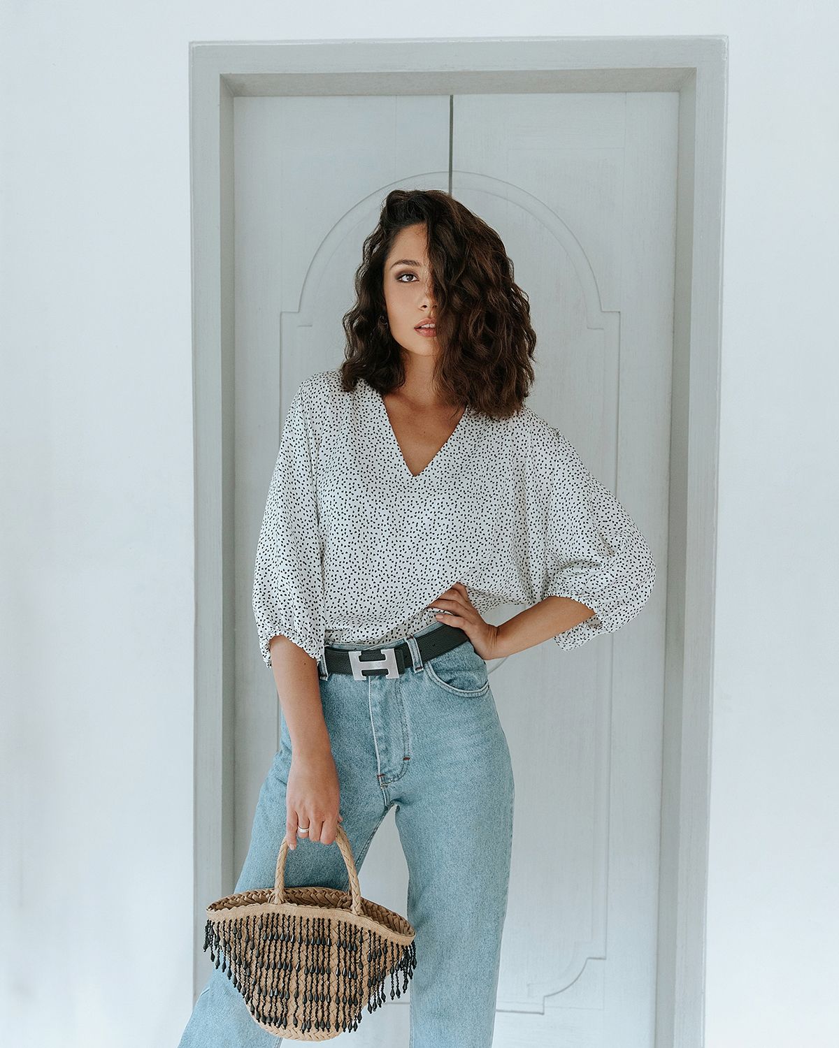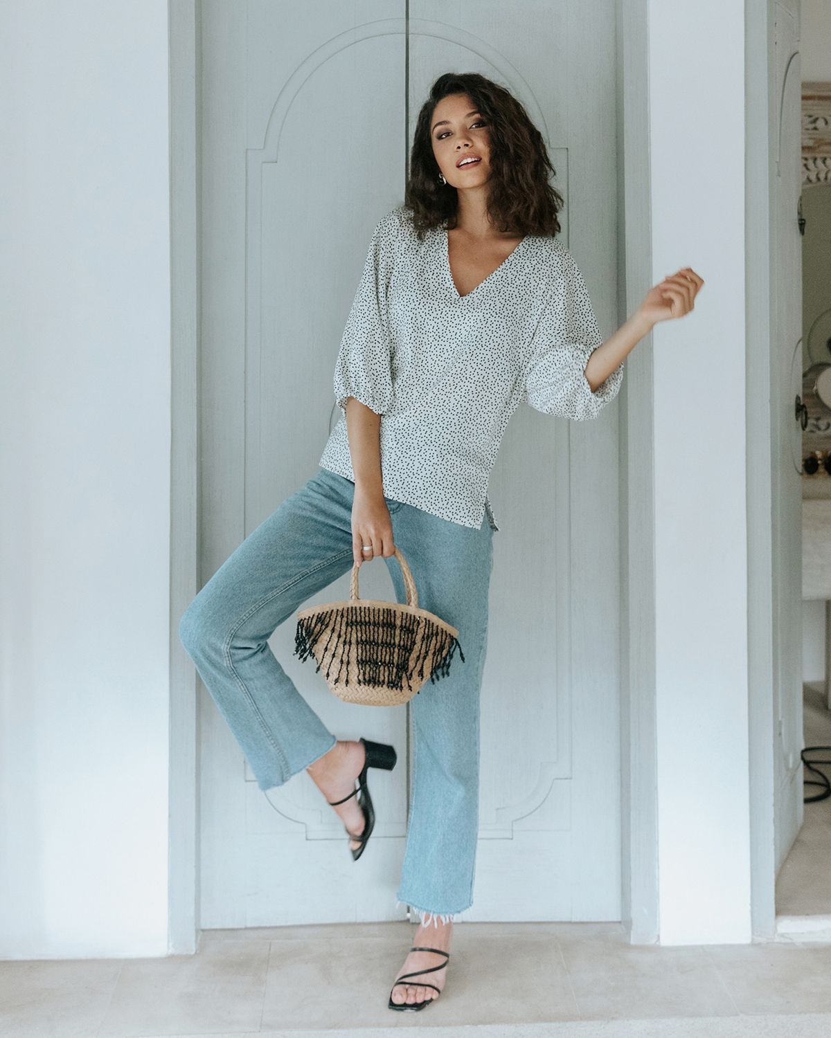 V-образный вырез визуально удлиняет шею. Ткань красиво струится.
