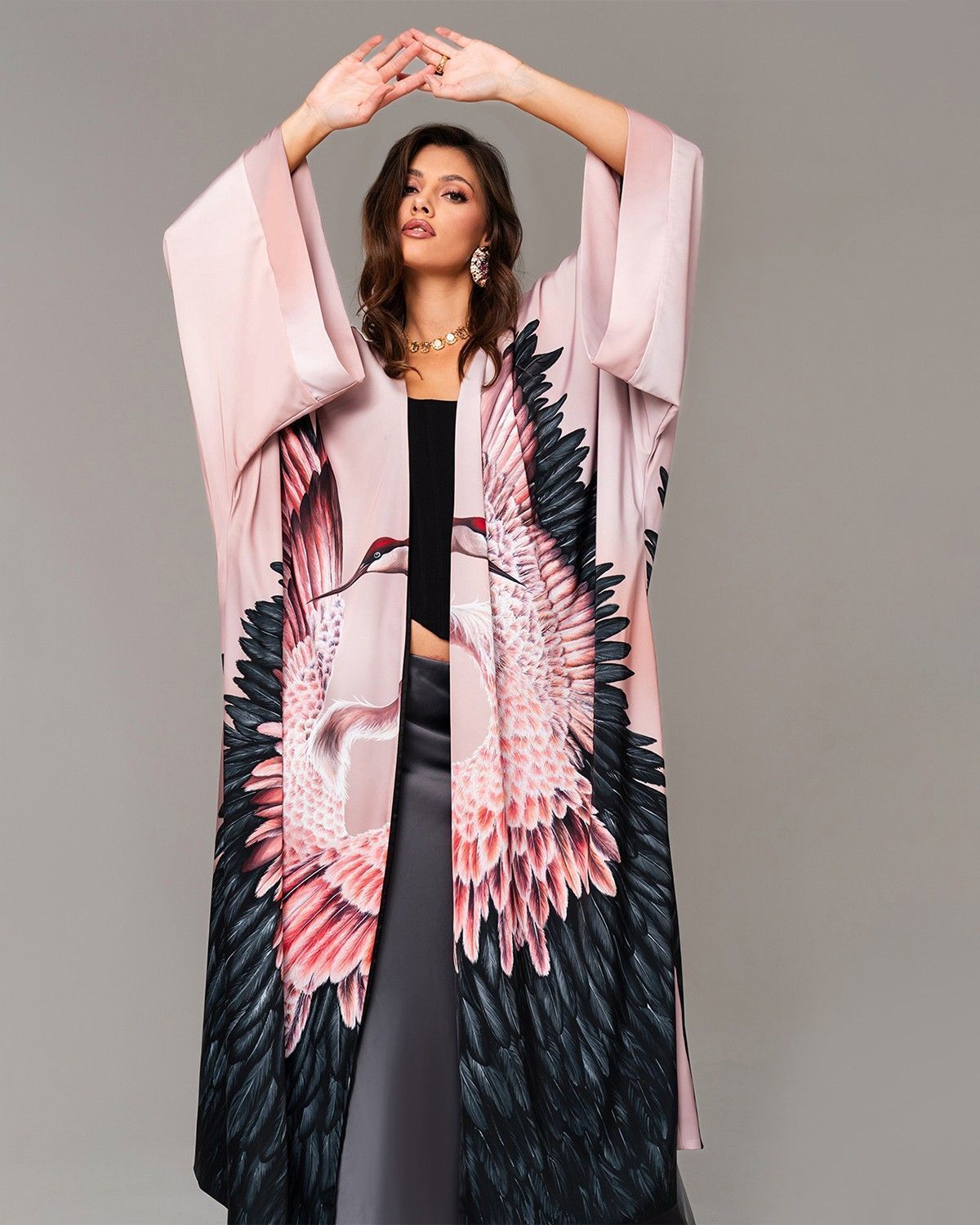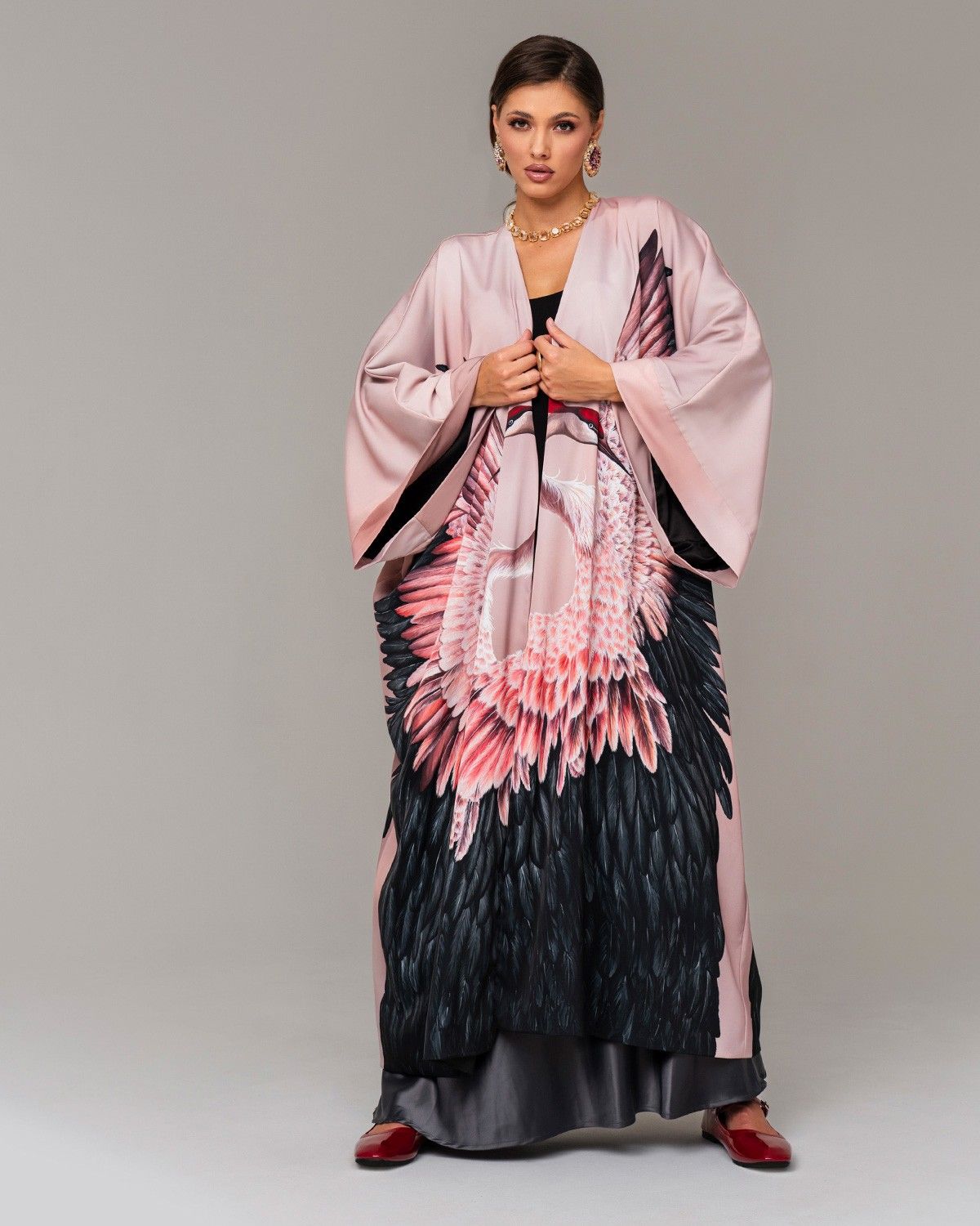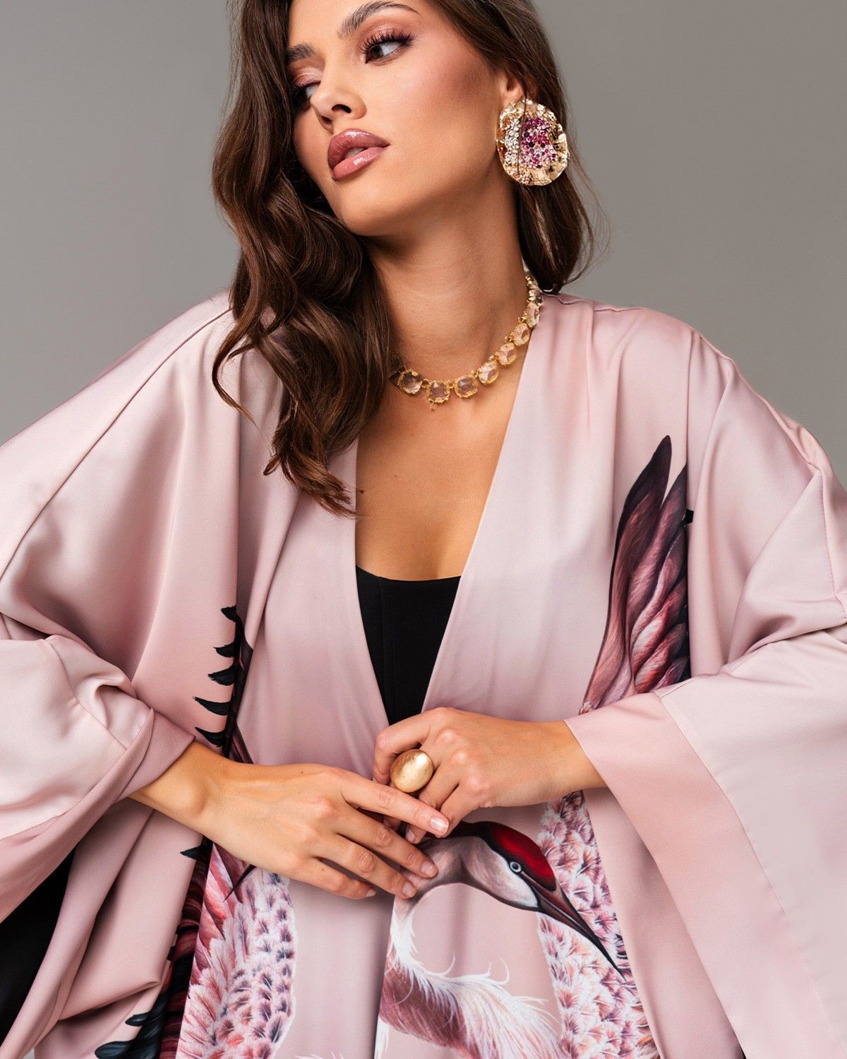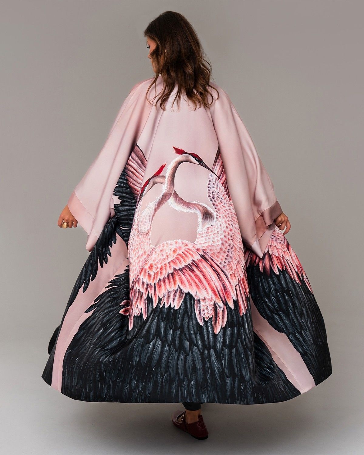 Шёлковое кимоно - это воплощение роскоши и изысканности, эффектное и стильное дополнение к Вашему образу. Выполненное из гладкого и приятного на ощупь японского шёлка, изделие приковывает взгляды своей яркостью и оригинальным дизайном. Кимоно украшено художественным рисунком “Журавли”. Качественная печать устойчива к стиркам и сохраняет яркость рисунка даже после многократного использования.