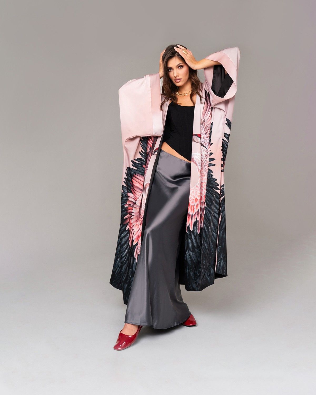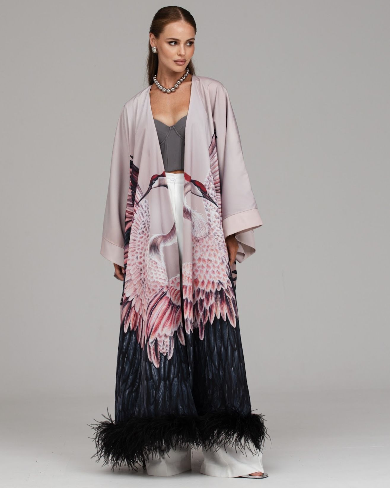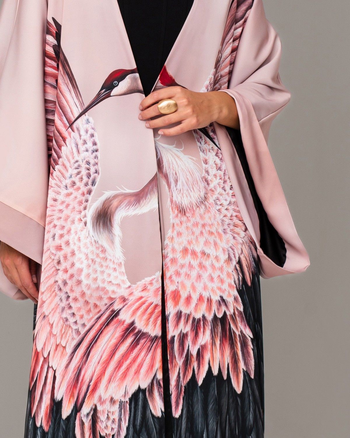 Шёлковое кимоно - это воплощение роскоши и изысканности, эффектное и стильное дополнение к Вашему образу. Выполненное из гладкого и приятного на ощупь японского шёлка, изделие приковывает взгляды своей яркостью и оригинальным дизайном. Кимоно украшено художественным рисунком “Журавли”. Качественная печать устойчива к стиркам и сохраняет яркость рисунка даже после многократного использования.