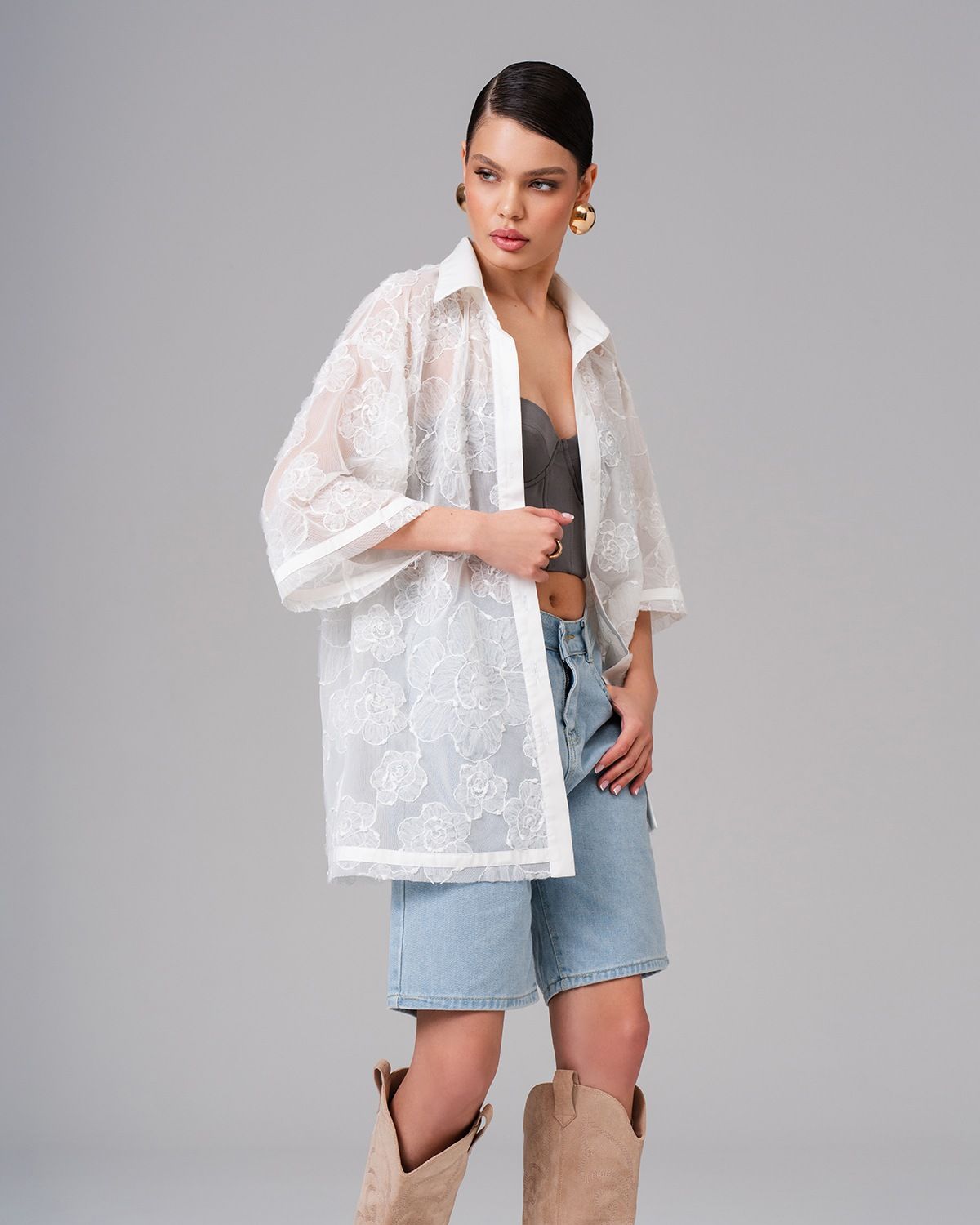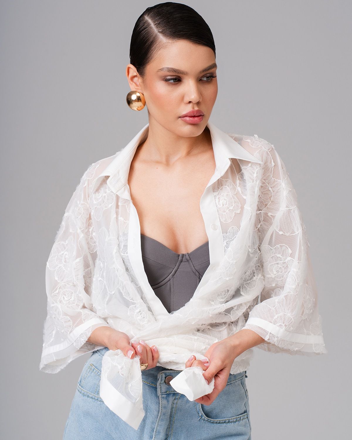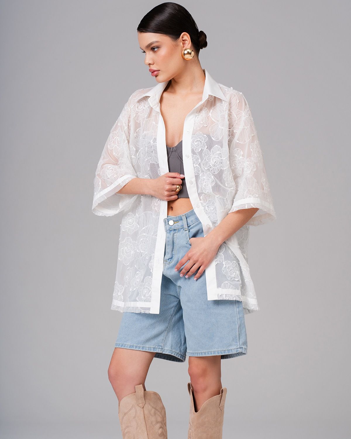 Представляем вам женственную блузку от SAHAR Art lab, которая станет настоящим украшением вашего гардероба! Эта прозрачная рубашка с короткими рукавами из легкой сетки с отложным воротником и спущенным рукавом создана для тех, кто ценит комфорт и стиль. Прозрачная ткань с нежными розочками добавит вашему образу романтичности и воздушности. Свободный крой оверсайз позволит вам чувствовать себя свободно и уверенно в любой ситуации. Рубашка на пуговицах с пуговицами в цвет изделия станет идеальным вариантом как для офиса, так и для повседневных образов. Она прекрасно сочетается как с брюками, так и с юбками, создавая стильные многослойные ансамбли.