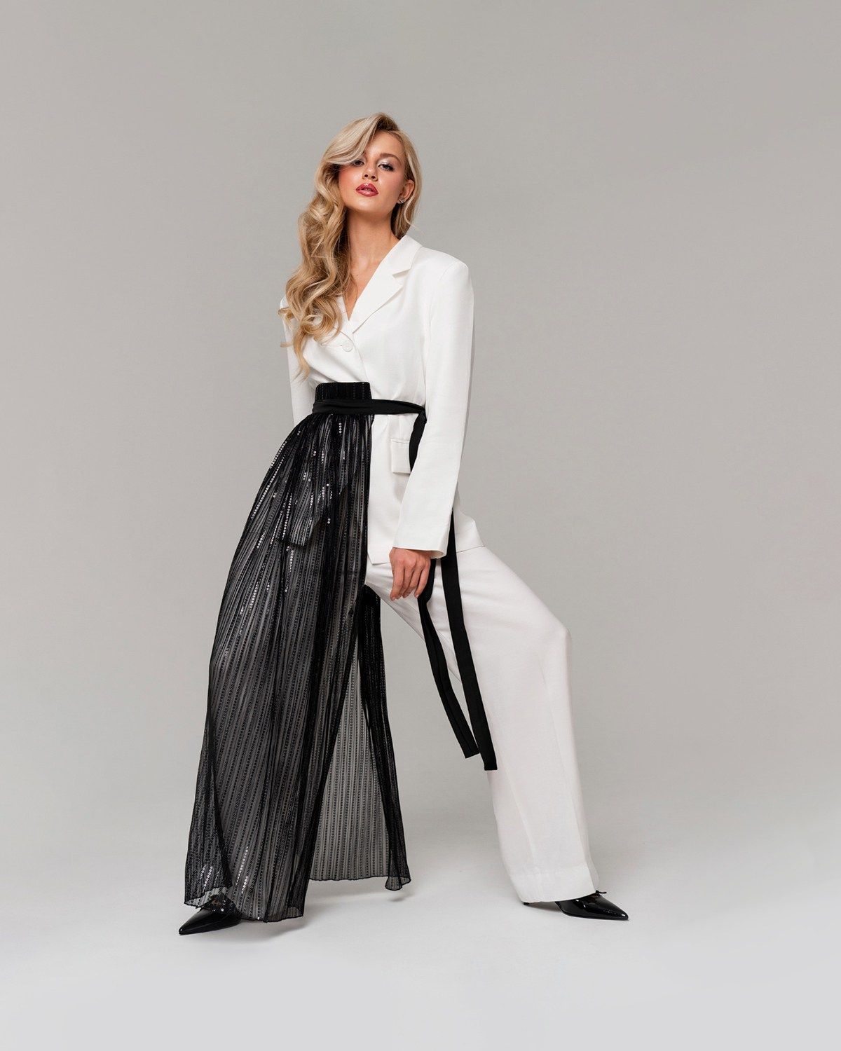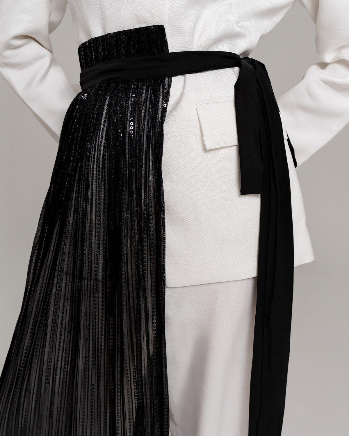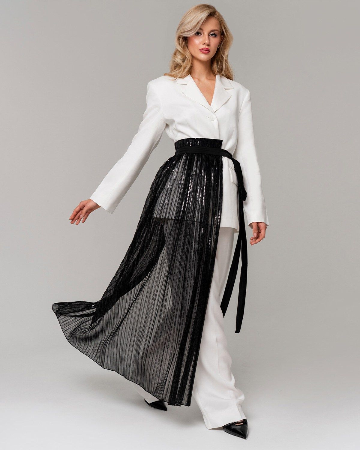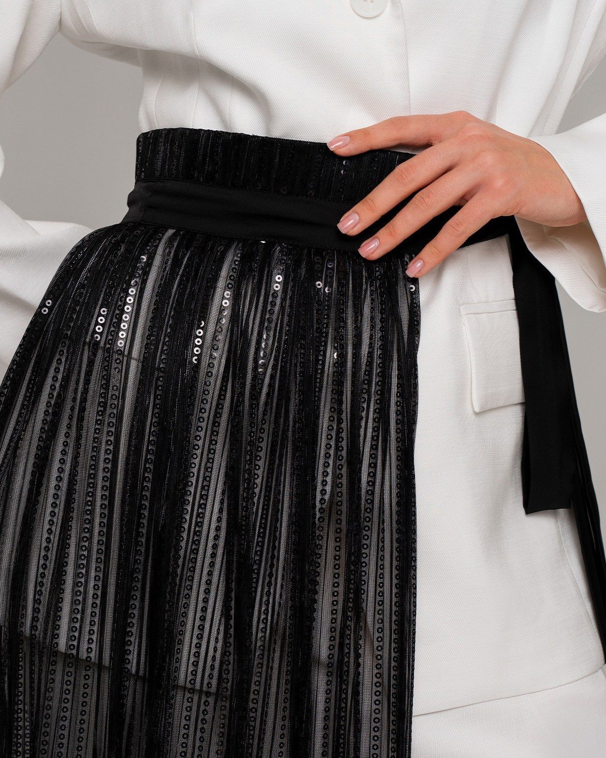 Особое внимание привлекает пояс-юбка прозрачная, добавляя нотку загадочности и дерзости в классический образ. Баска асимметричная и юбка гофре с пайетками вносят элемент драматичности и блеска, делая каждый ваш выход незабываемым. Это не просто аксессуар, а истинное воплощение высокого стиля и модного искусства в вашем гардеробе.