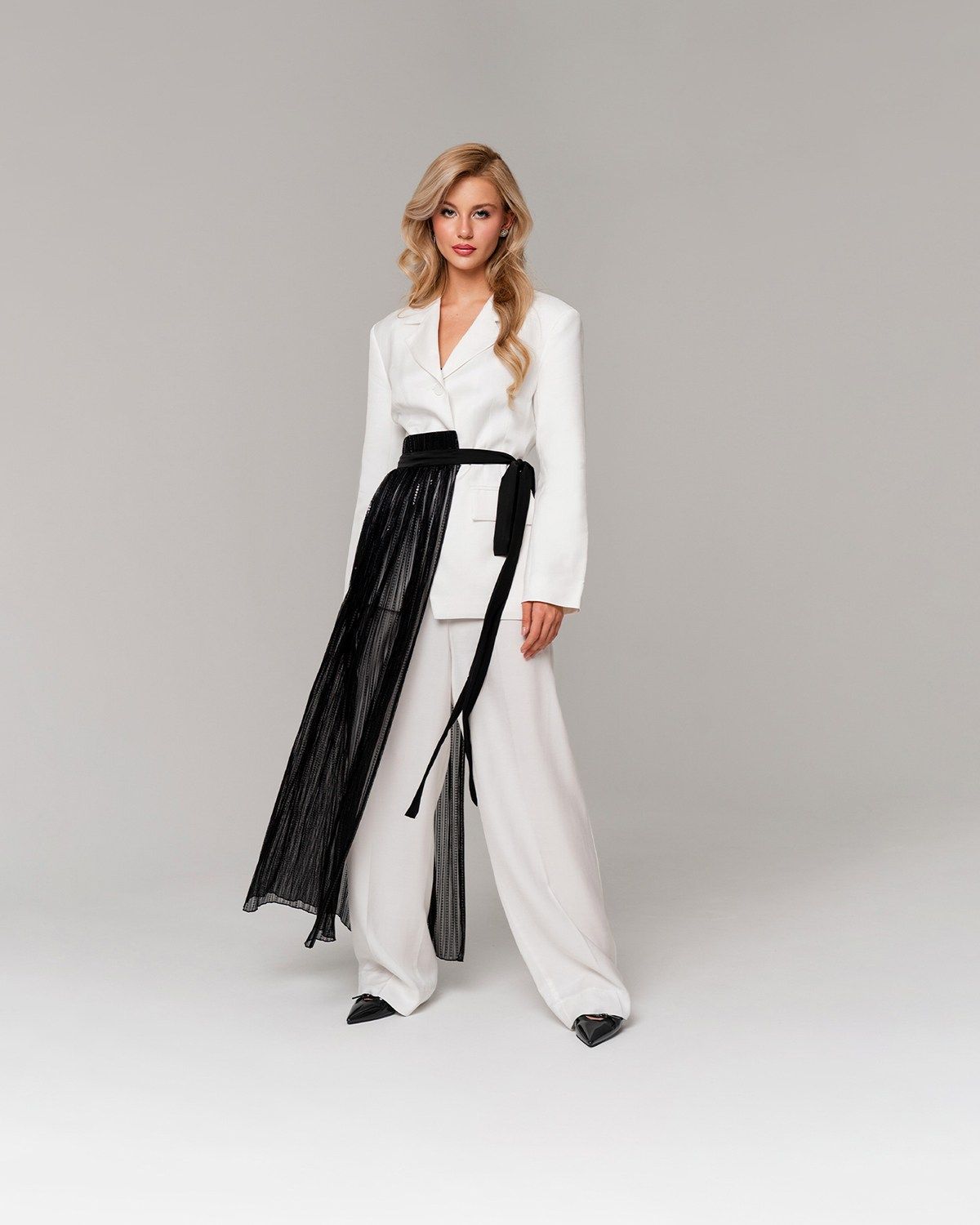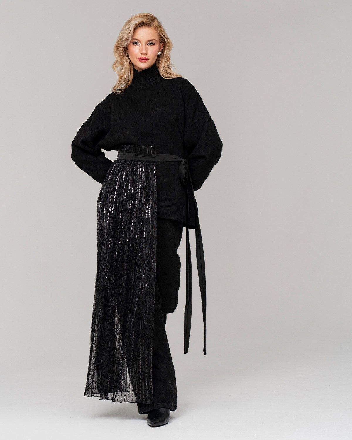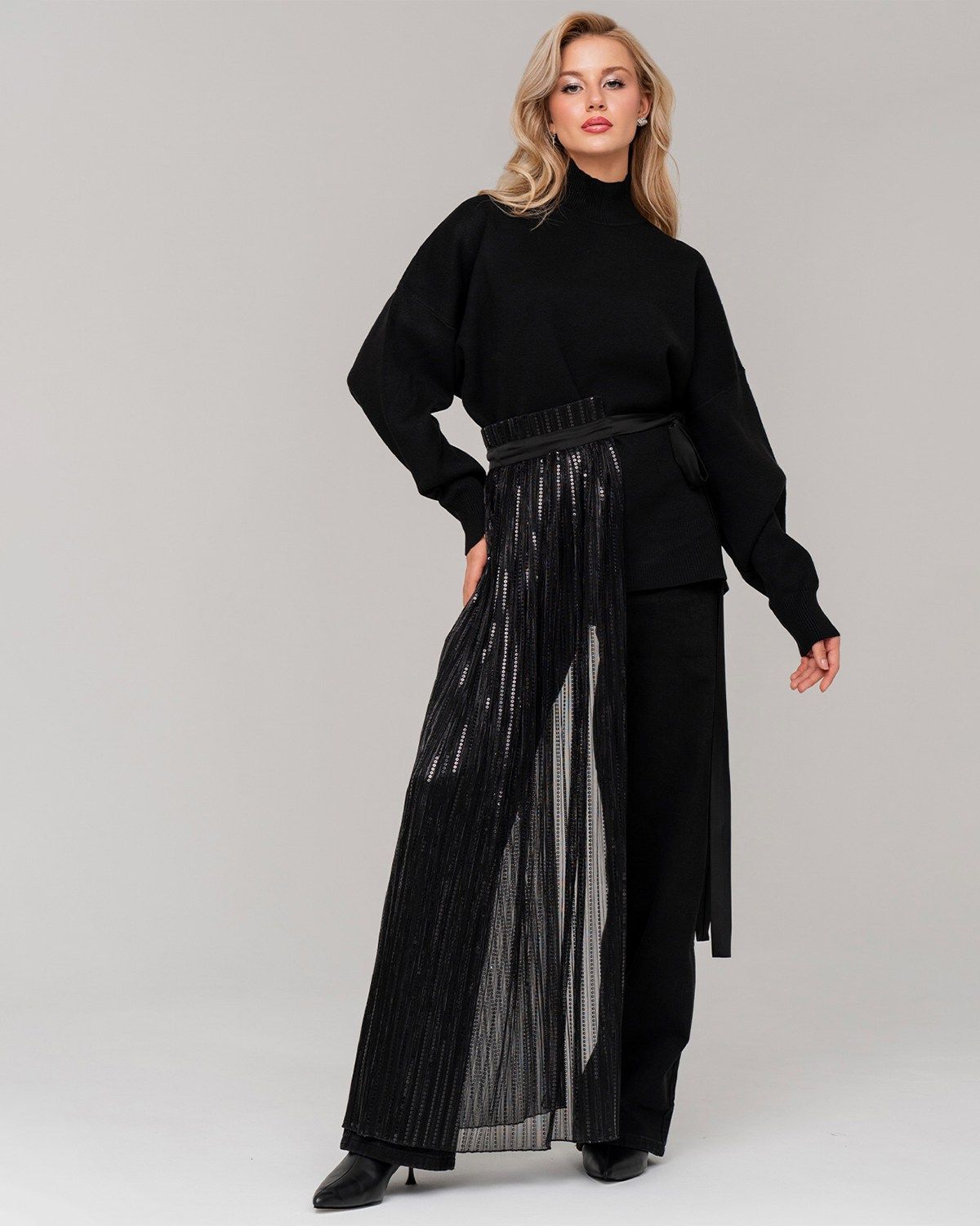 Особое внимание привлекает пояс-юбка прозрачная, добавляя нотку загадочности и дерзости в классический образ. Баска асимметричная и юбка гофре с пайетками вносят элемент драматичности и блеска, делая каждый ваш выход незабываемым. Это не просто аксессуар, а истинное воплощение высокого стиля и модного искусства в вашем гардеробе.
