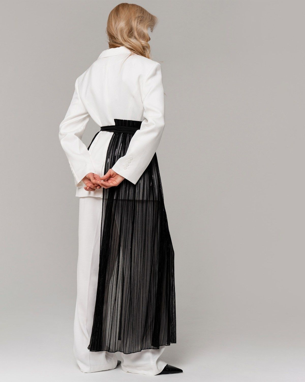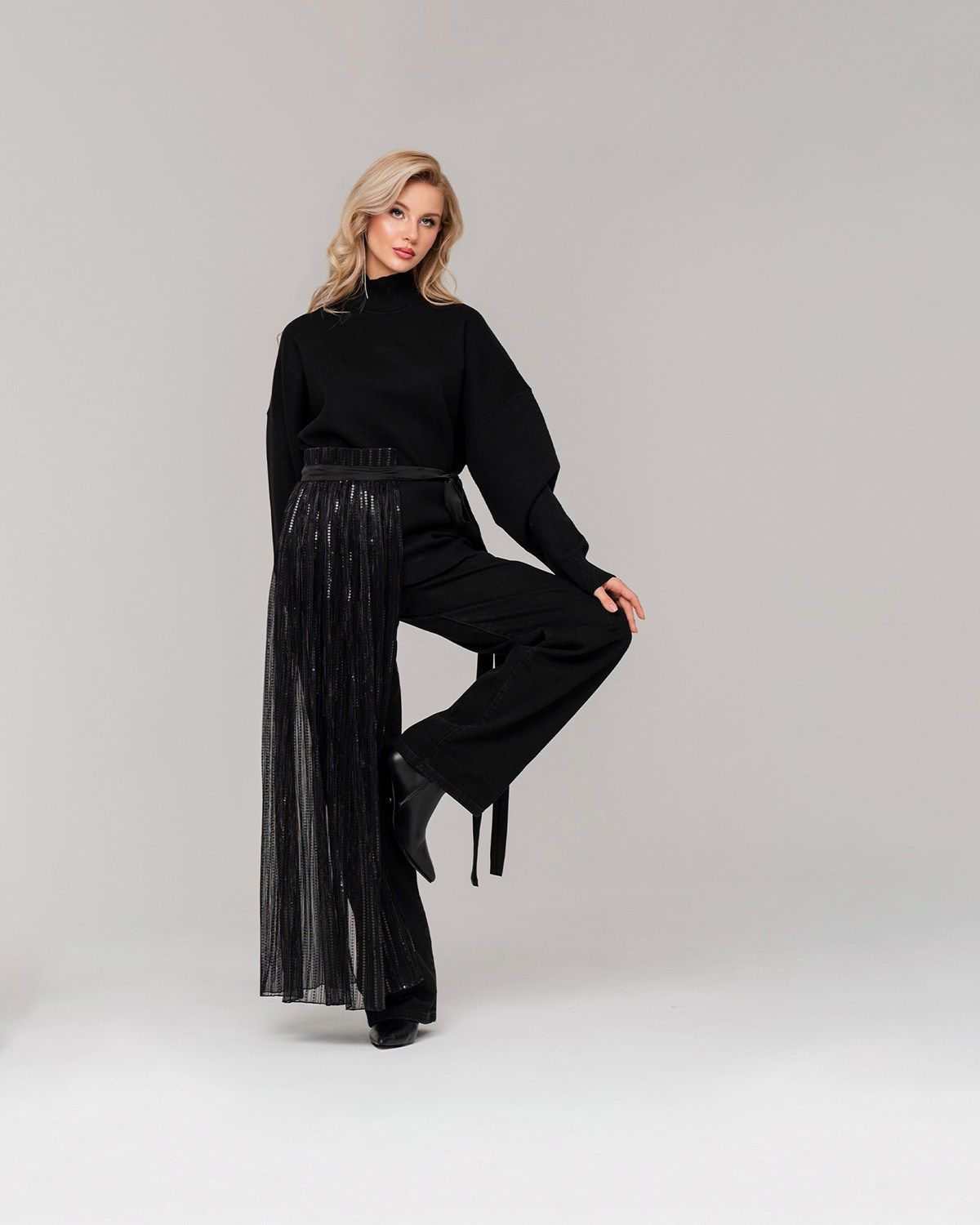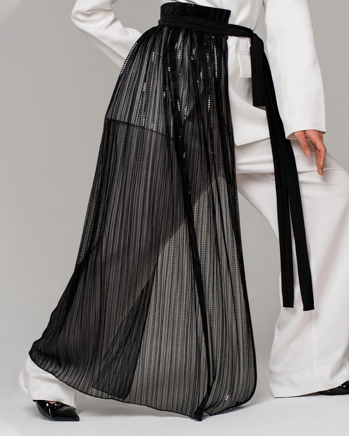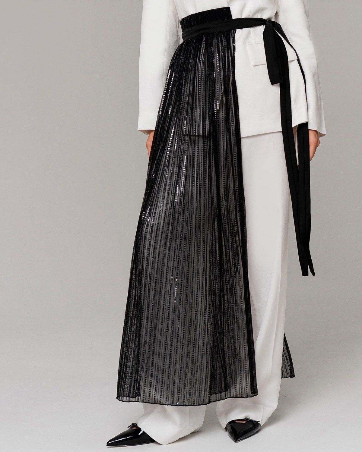 Особое внимание привлекает пояс-юбка прозрачная, добавляя нотку загадочности и дерзости в классический образ. Баска асимметричная и юбка гофре с пайетками вносят элемент драматичности и блеска, делая каждый ваш выход незабываемым. Это не просто аксессуар, а истинное воплощение высокого стиля и модного искусства в вашем гардеробе.