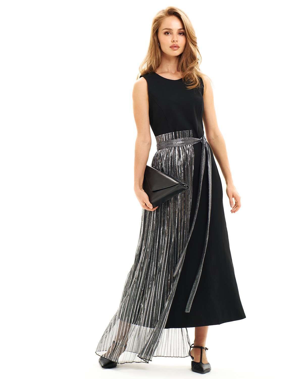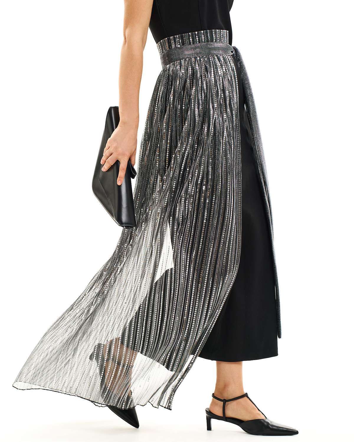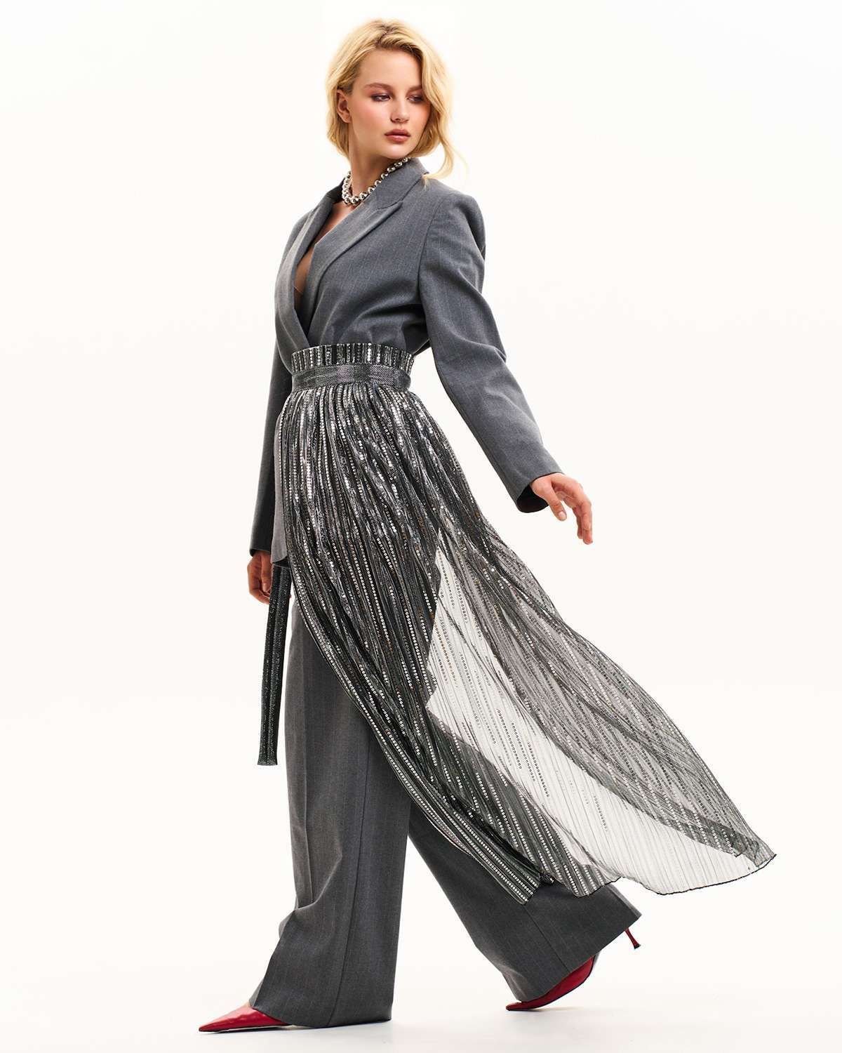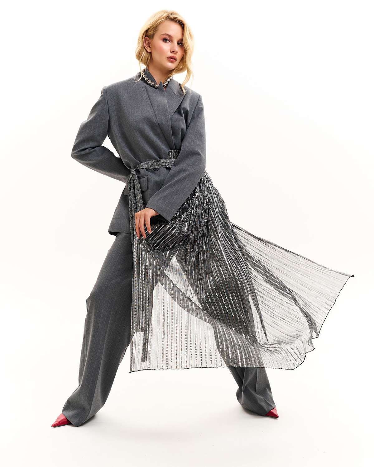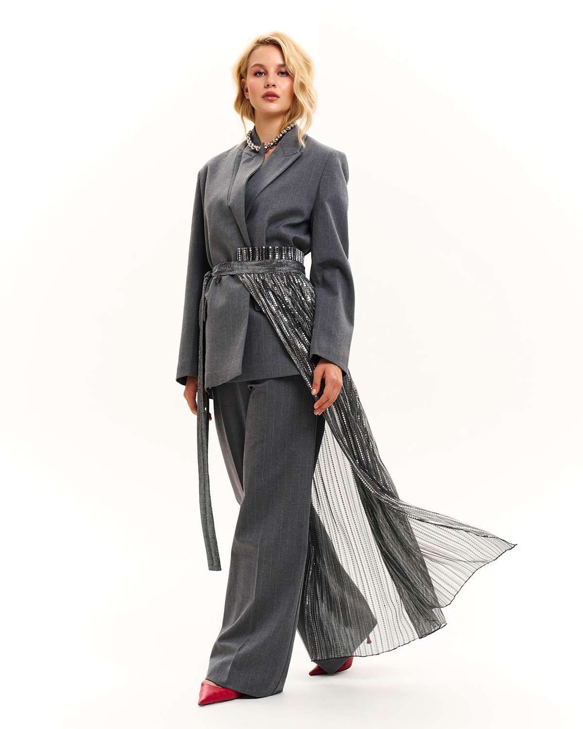 Особое внимание привлекает пояс-юбка прозрачная, добавляя нотку загадочности и дерзости в классический образ. Баска асимметричная и юбка гофре с пайетками вносят элемент драматичности и блеска, делая каждый ваш выход незабываемым. Это не просто аксессуар, а истинное воплощение высокого стиля и модного искусства в вашем гардеробе.