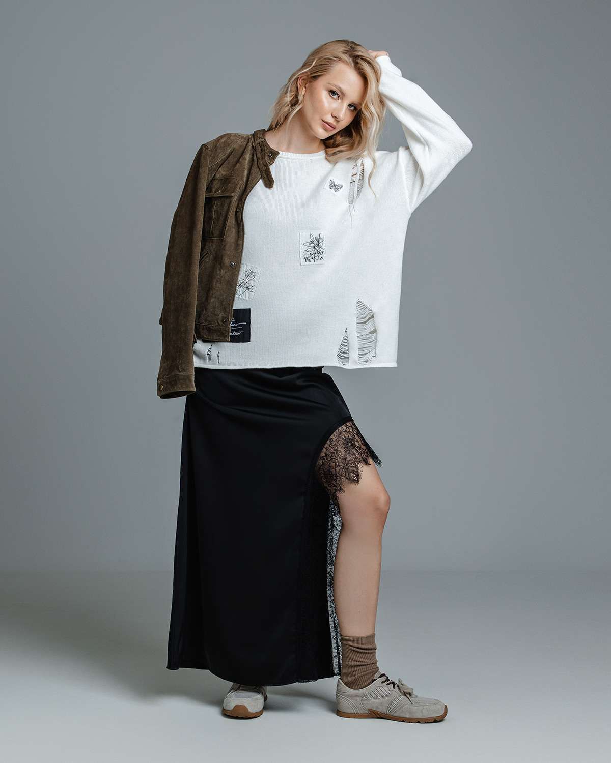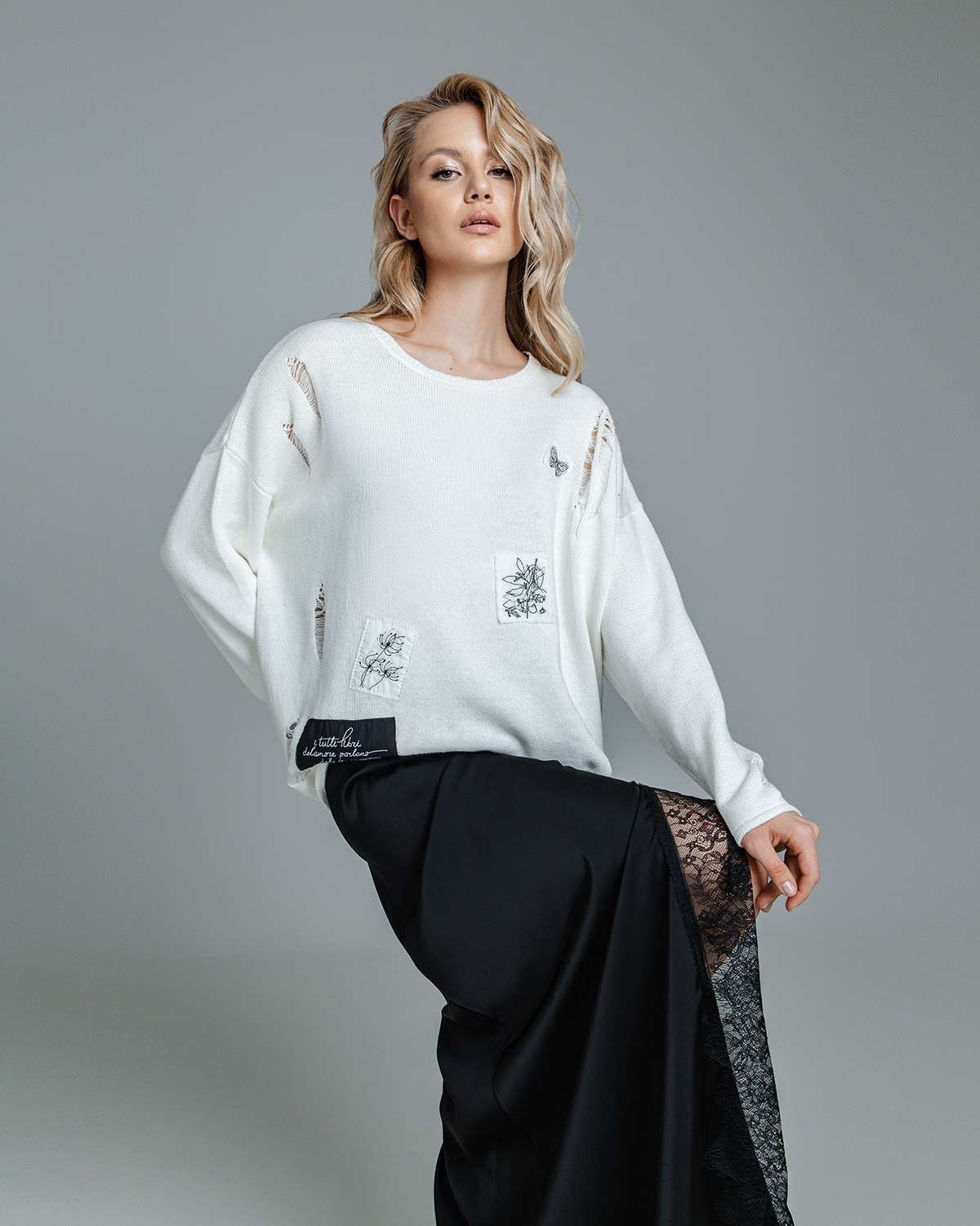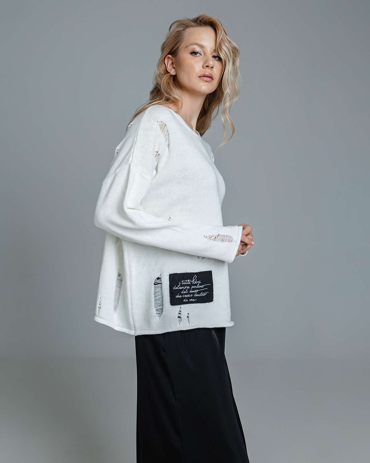 Наш дизайнерский свитер с декоративными распущенными петлями – это не просто одежда, а воплощение стиля. Женский джемпер, выполненный в технике плотной вязки, излучает тепло и комфорт, при этом обладает свободным кроем, что делает его идеальным для создания слоев и подчеркивания индивидуальности. Особенно впечатляют его абстрактные рисунки и уникальный жаккардовый узор разных фактур, которые придают изделию особый характер.