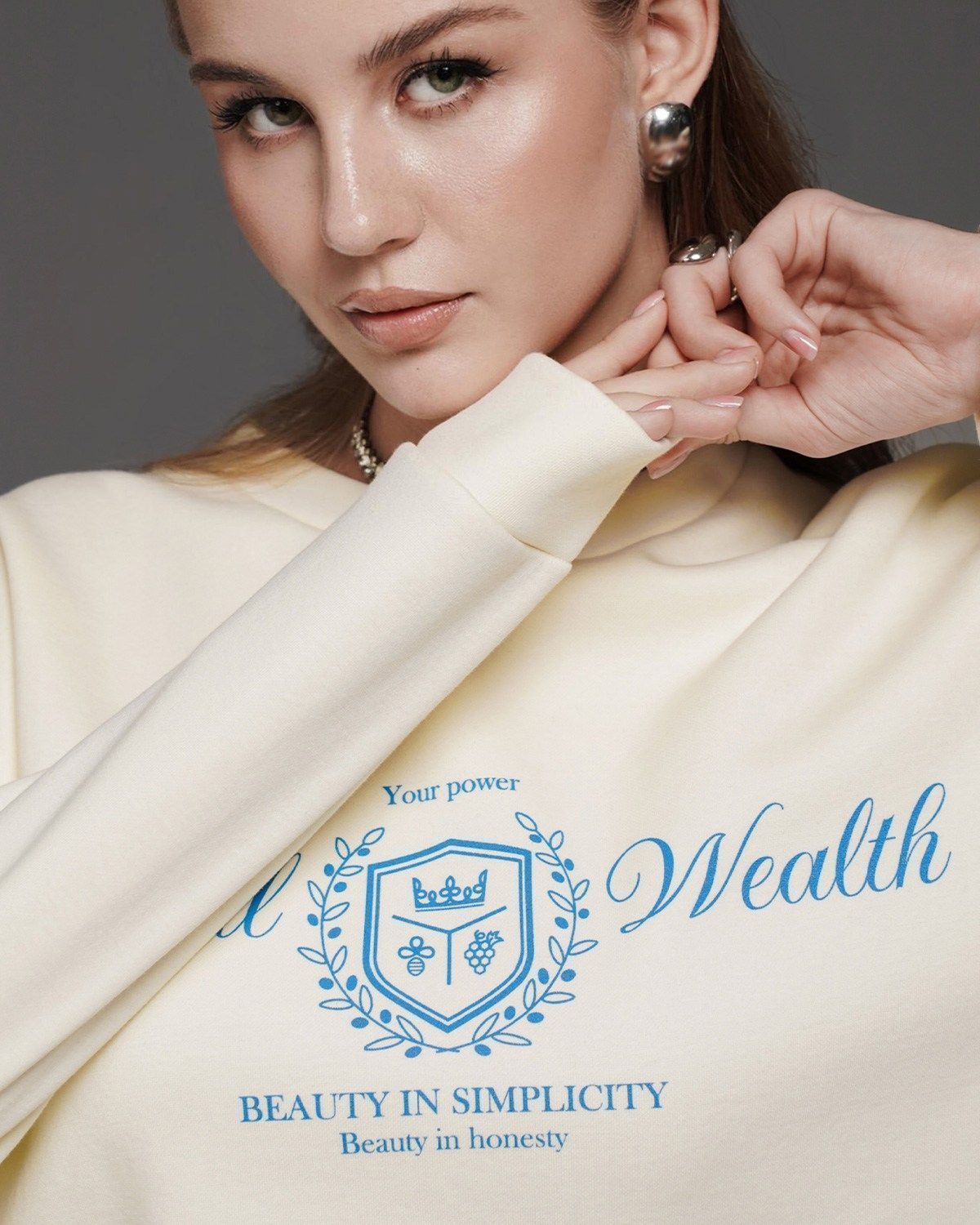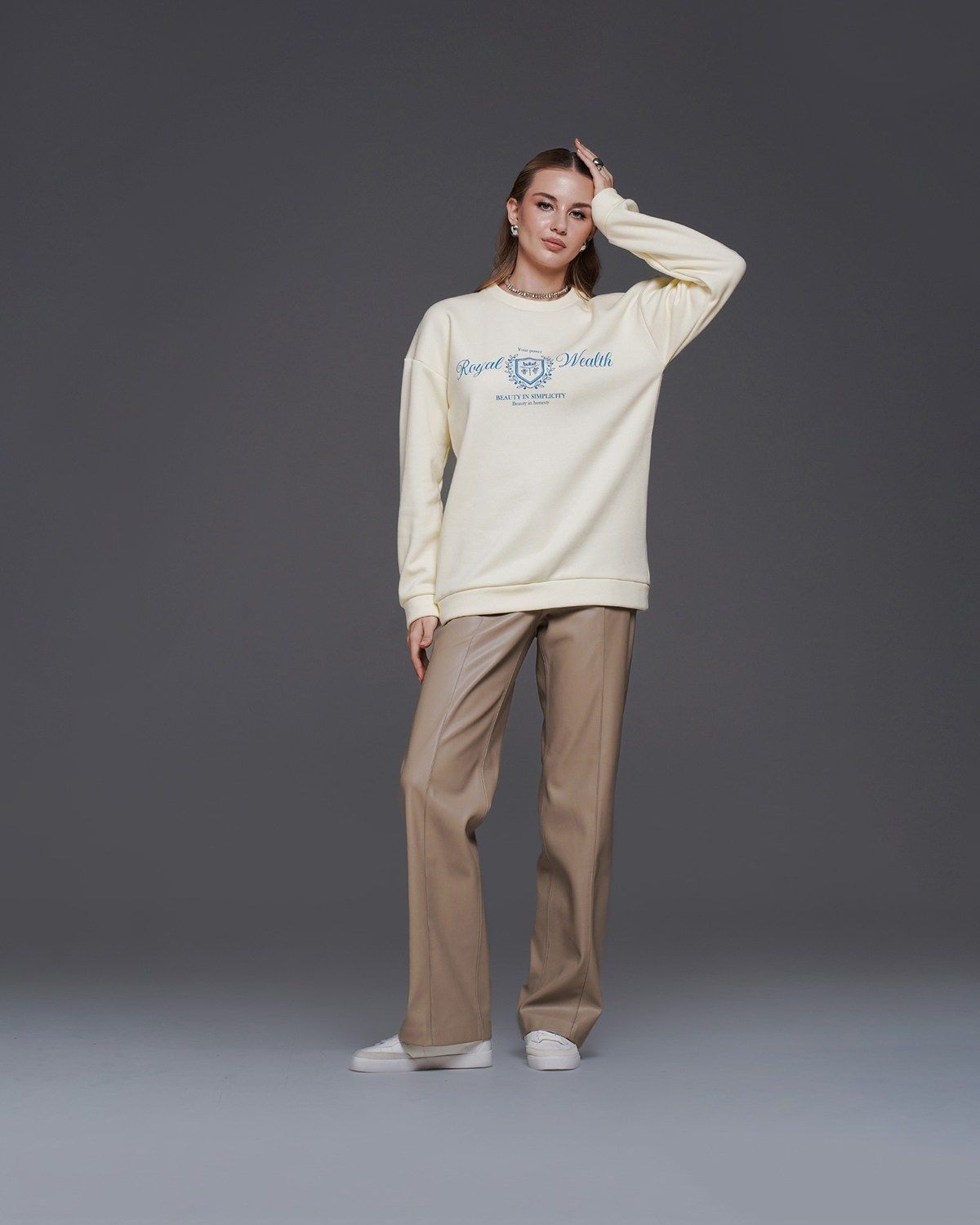 Модель без воротника, с округлым вырезом горловины и длинными рукавами представлена в широком размерном ряде. Наличие больших и маленьких размеров позволяет приобретать изделие женщинам разного возраста, роста и типа фигуры. Свитшот одинаково хорошо будет сидеть на полных и стройных дамах, высокого и невысокого роста. Подходит для беременных женщин.