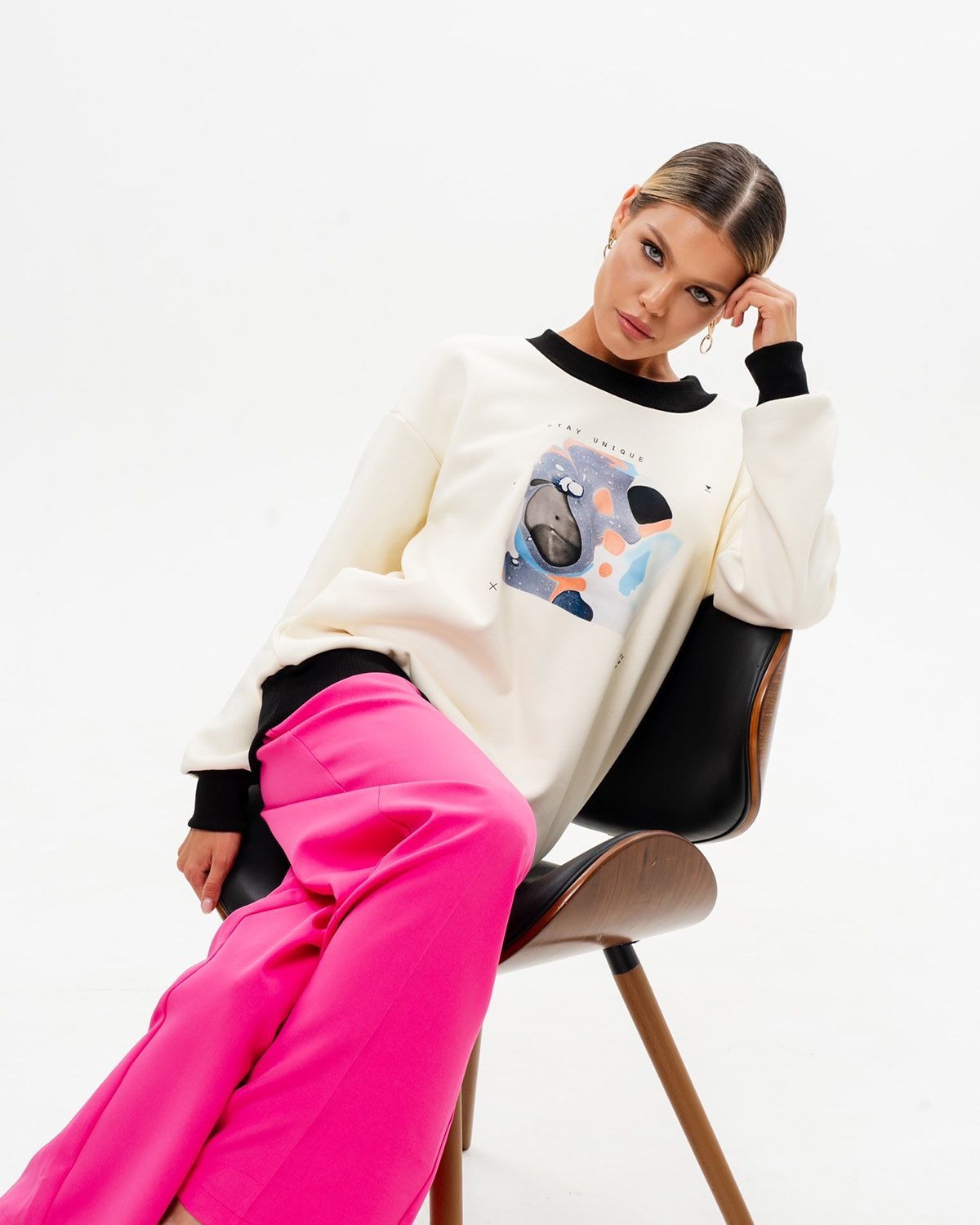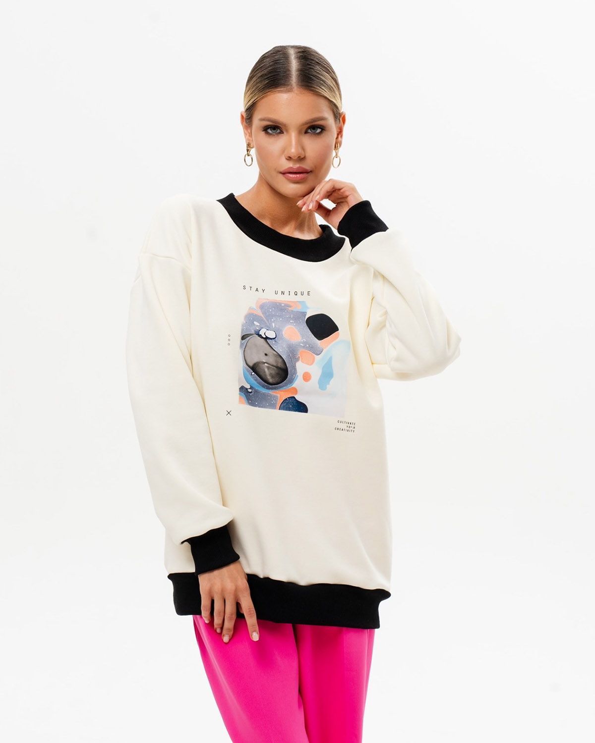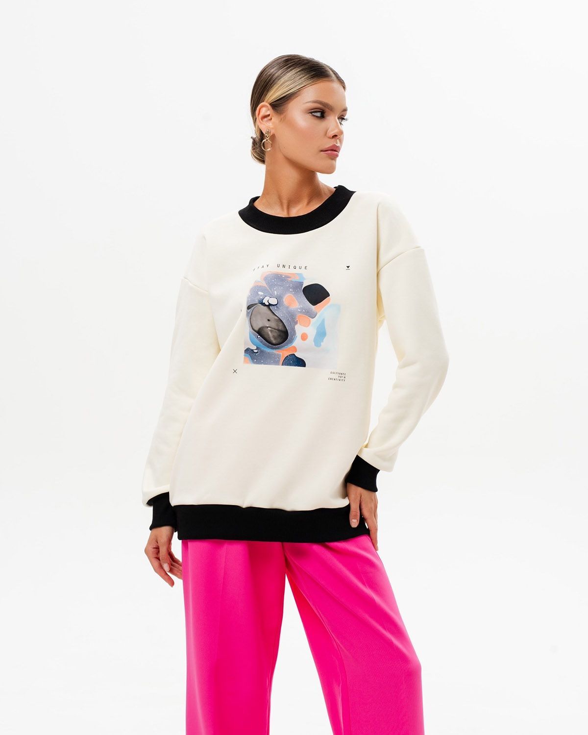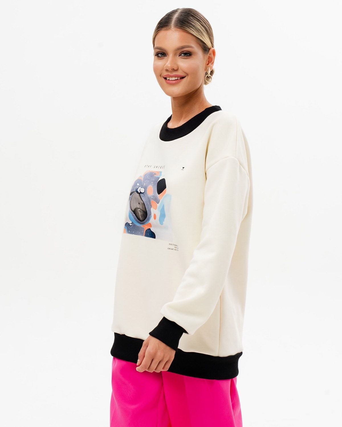 Женский свитшот оверсайз со стильным принтом бренда SAHAR Art lab - идеальная кофта для работы, школы или спортивных занятий. Теплая флисовая ткань и широкий оверсайз крой делают изделие комфортным в носке.