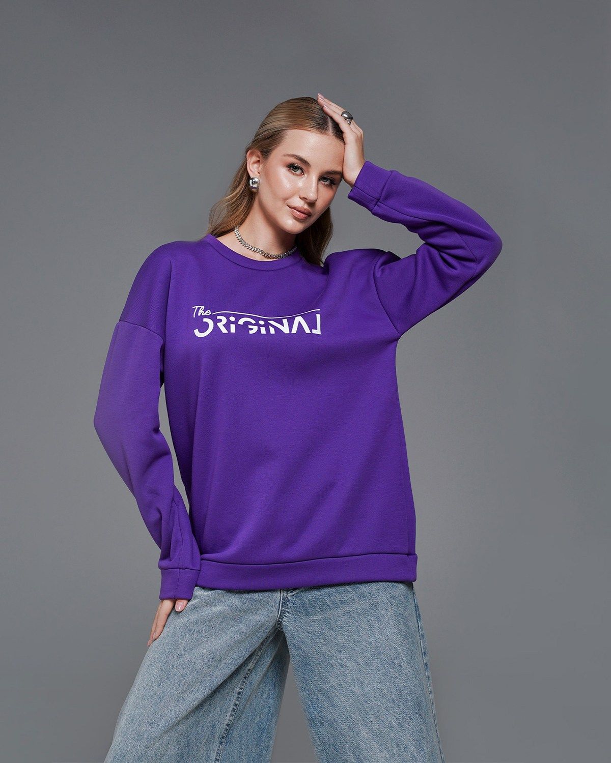 Модель без воротника, с округлым вырезом горловины и длинными рукавами представлена в широком размерном ряде. Наличие больших и маленьких размеров позволяет приобретать изделие женщинам разного возраста, роста и типа фигуры. Свитшот одинаково хорошо будет сидеть на полных и стройных дамах, высокого и невысокого роста. Подходит для беременных женщин.
