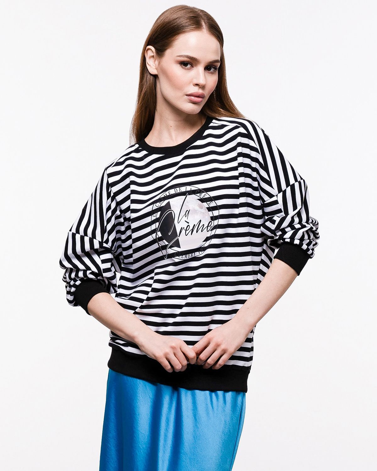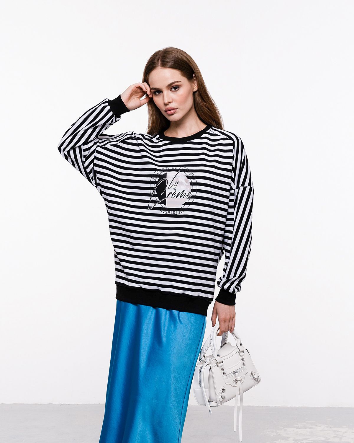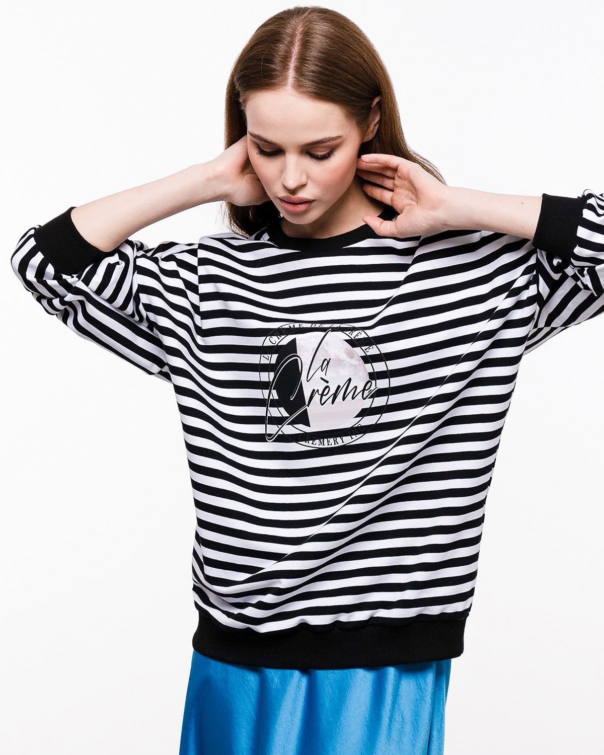 Свитшот женский сделан из футера в полоску. Материал не скатывается, хорошо дышит и сохраняет форму в течение нескольких сезонов. Стильный свитшот из двух классических цветов смотрится как очень приятный вариант не только для прогулок, но даже для офисной работы.