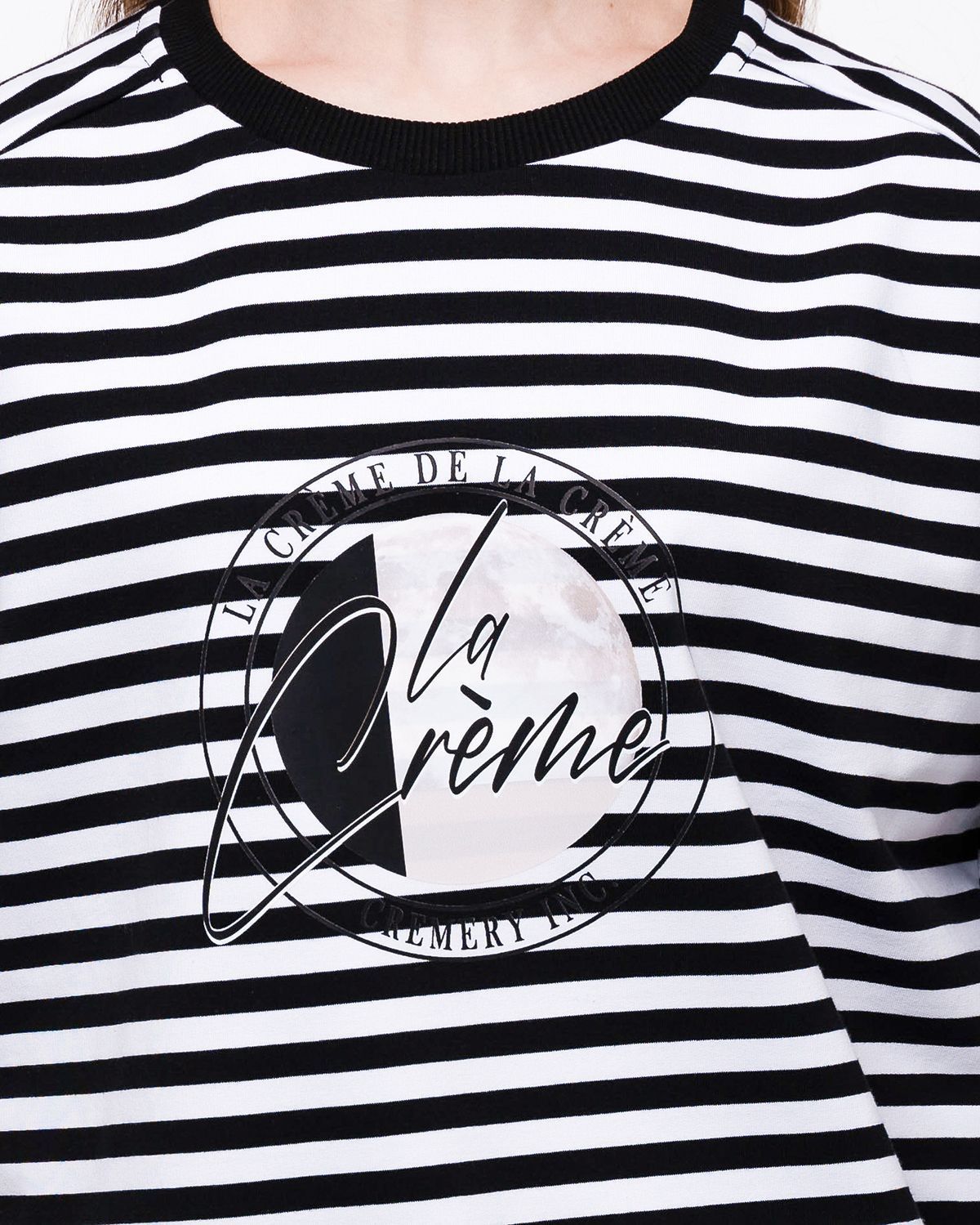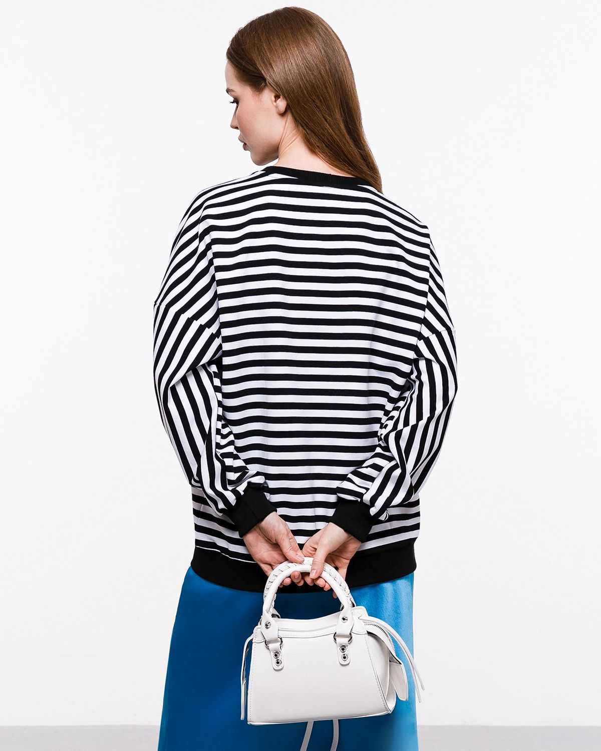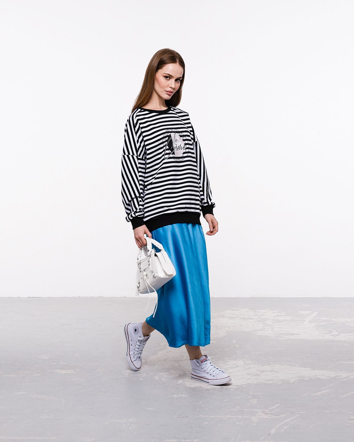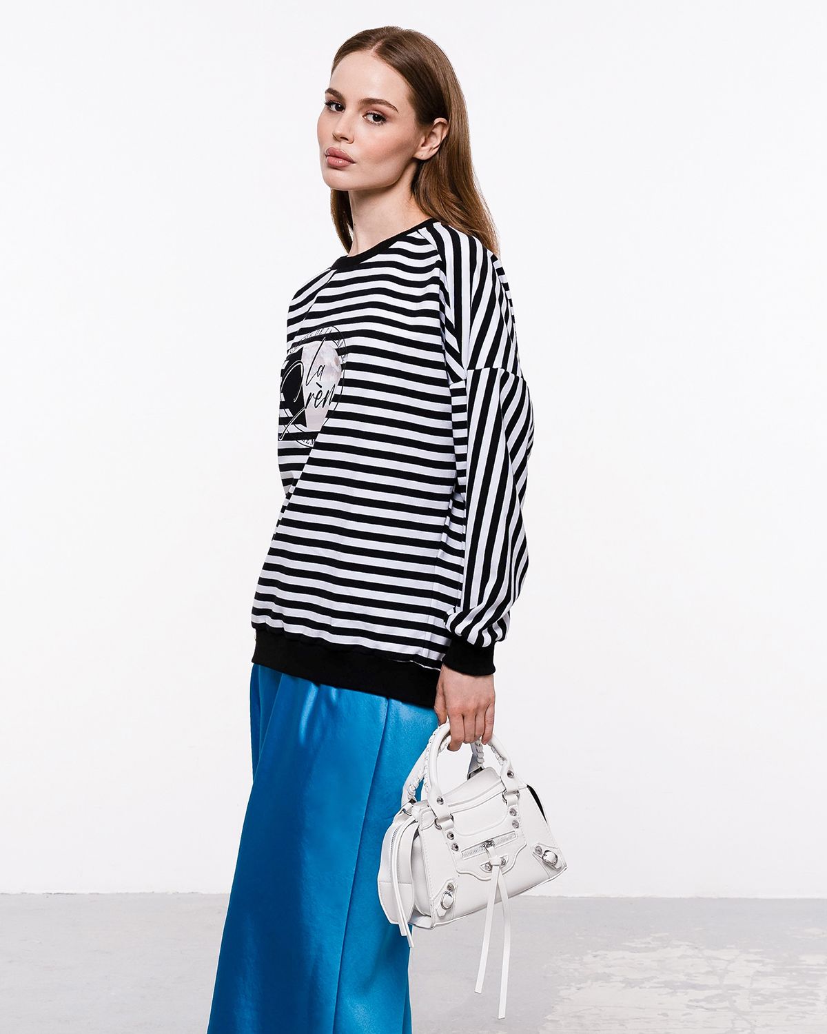 Свитшот женский сделан из футера в полоску. Материал не скатывается, хорошо дышит и сохраняет форму в течение нескольких сезонов. Стильный свитшот из двух классических цветов смотрится как очень приятный вариант не только для прогулок, но даже для офисной работы.