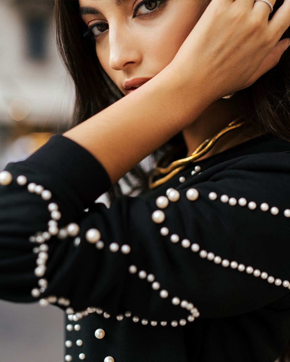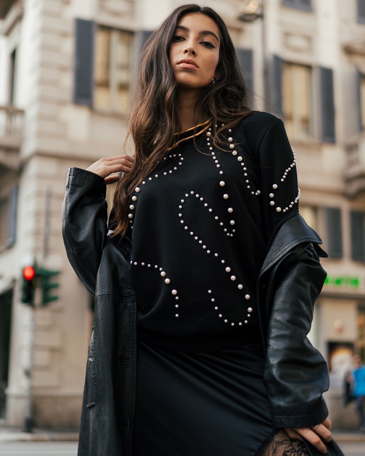 Базовый свитшот с эффектными бусинами-жемчугом — легкая модель для создания расслабленных спокойных образов. Сделан он из приятной для тела футера. Это ткань, которая дышит, гипоаллергенна и не вызывает раздражений. Мягкая и эластичная кулирка хорошо переносит стирки и служит долго. Поэтому можете быть уверены, что изделие с вами на несколько сезонов. Поставщиком ткани для нас является Турция.