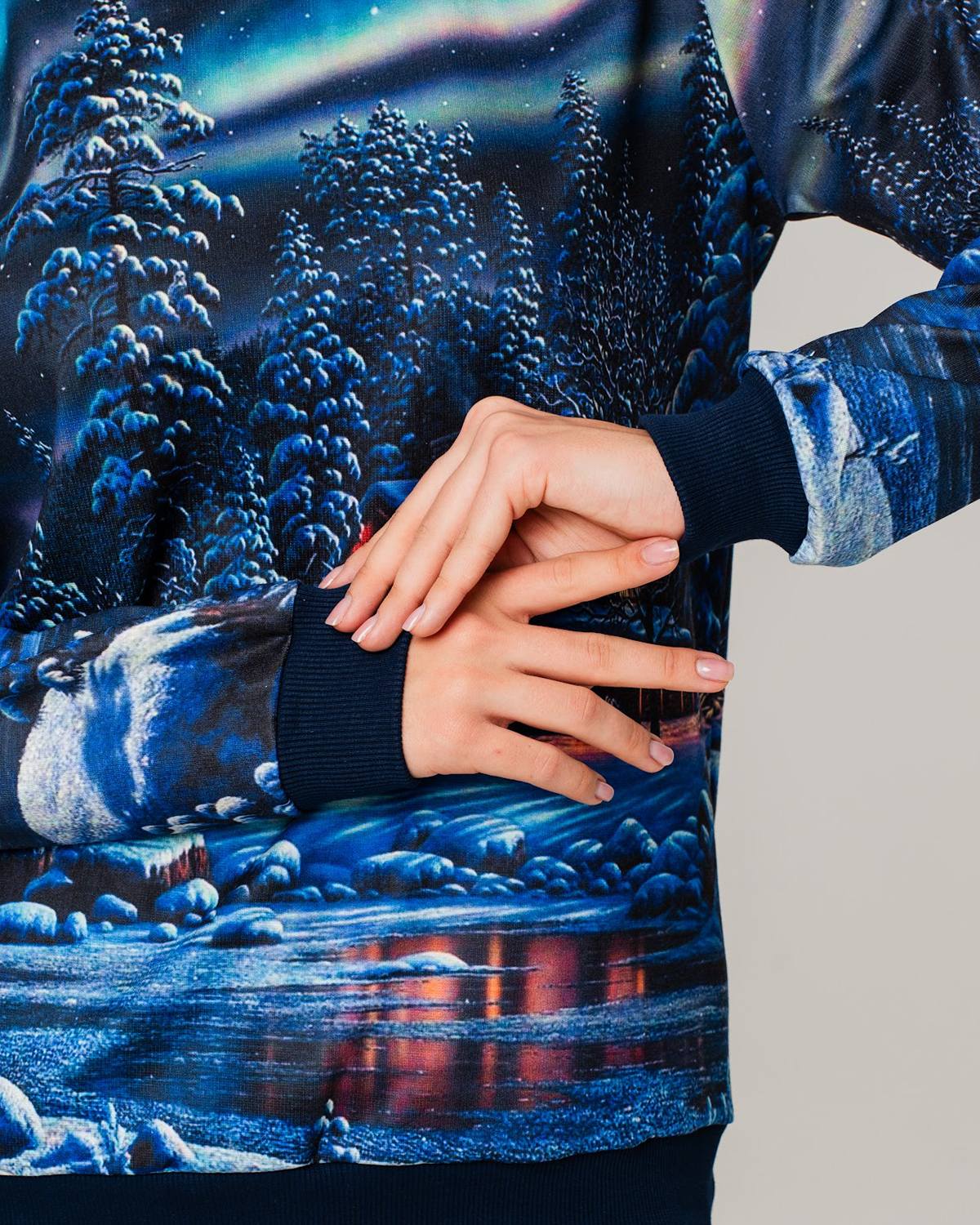 Манжеты и горловина свитшота однотонные, сделаны из кашкорсе - трикотажной ткани, которая отличается эластичностью и стойкостью к долгой носке и стиркам.