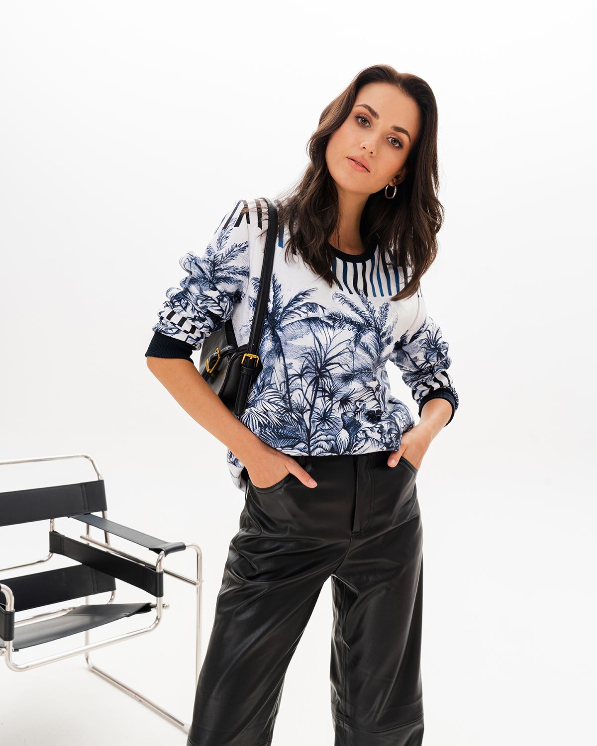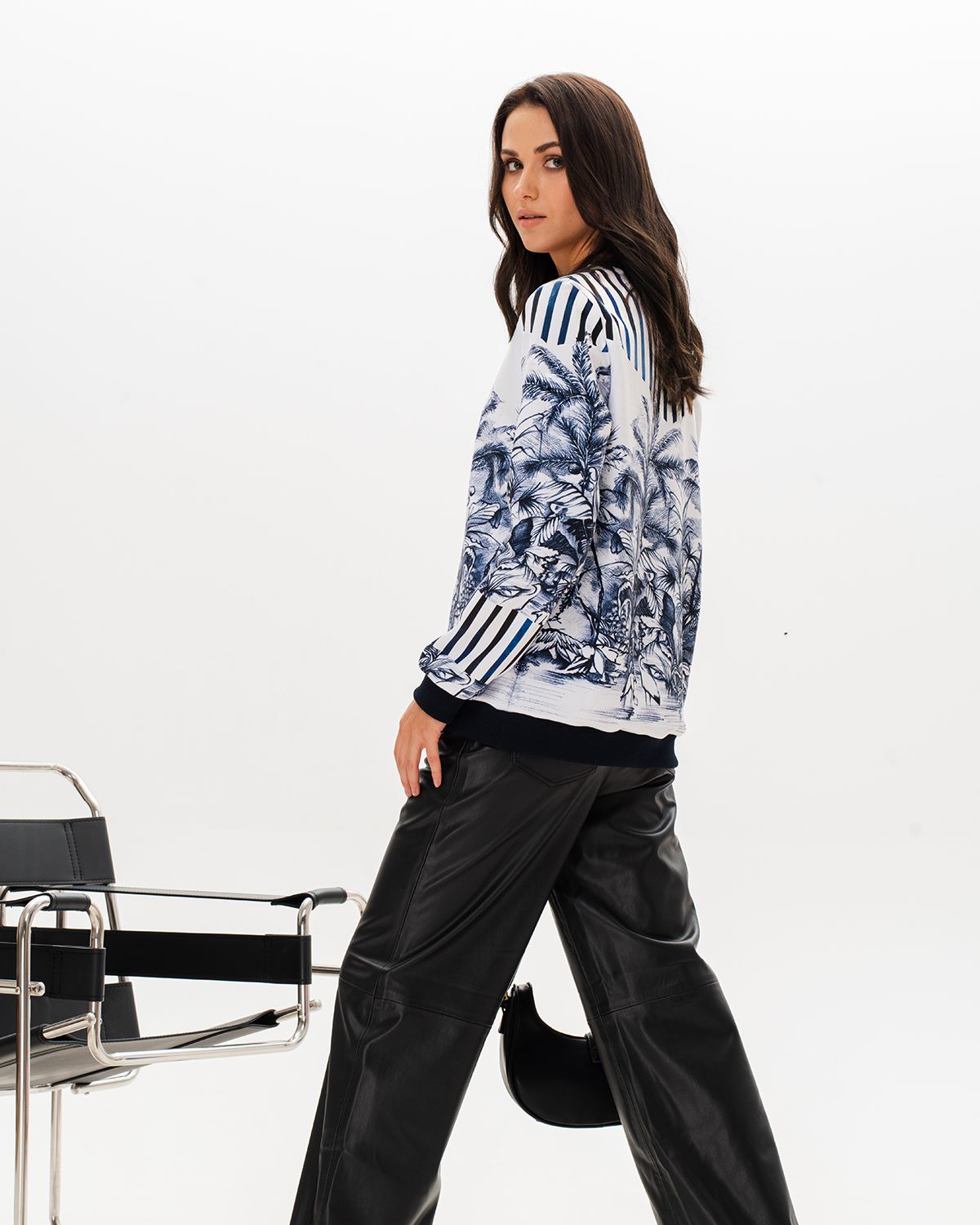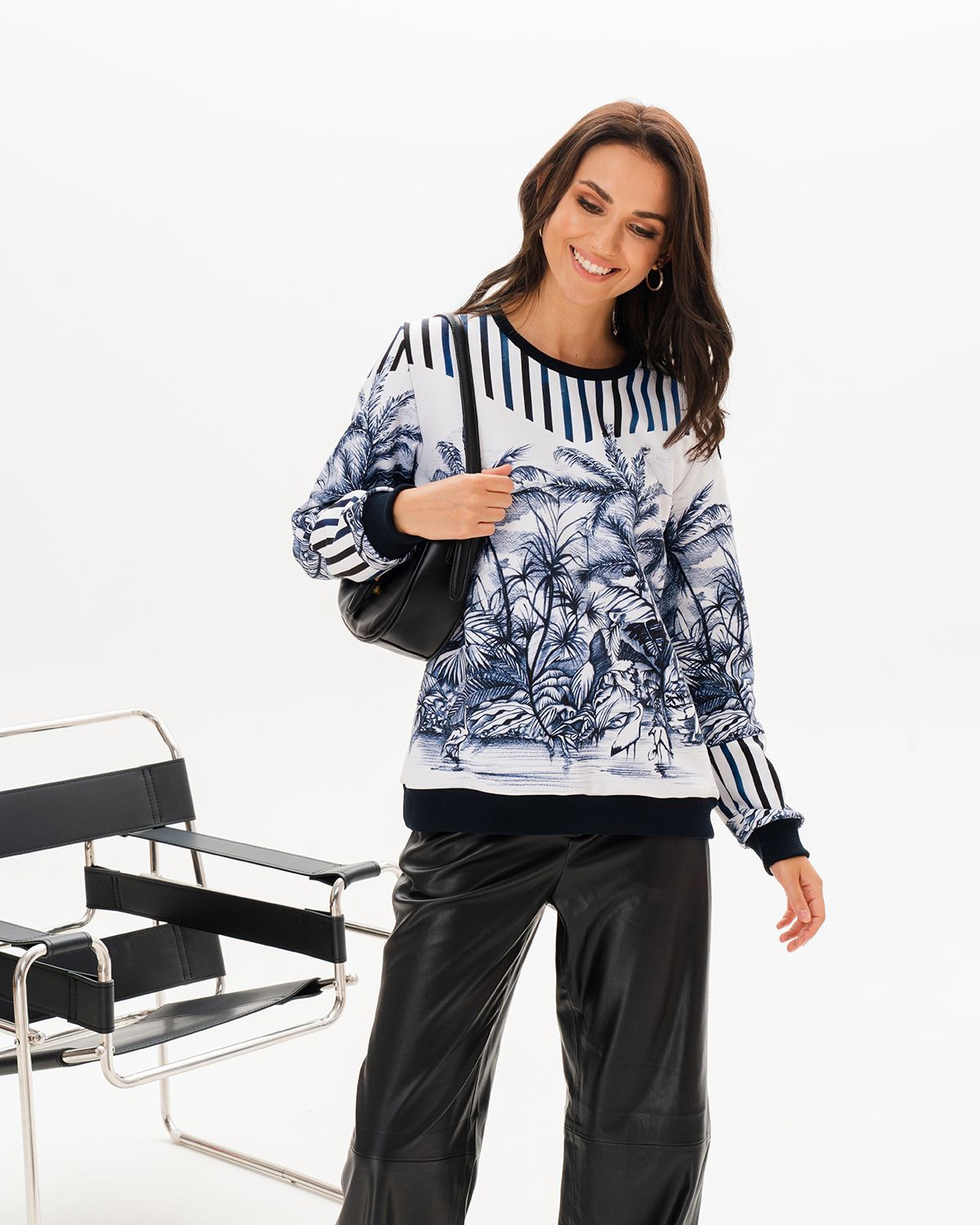 Свитшот с принтом сделан из интерлока - материала, который с изнаночной стороны состоит из хлопка, а снаружи имеет специальный полиэстеровый слой для стойкого нанесения рисунка. Благодаря этому изделие приятно для тела, а принт спокойно переживет хоть сотню стирок и останется таким же ярким и сочным.