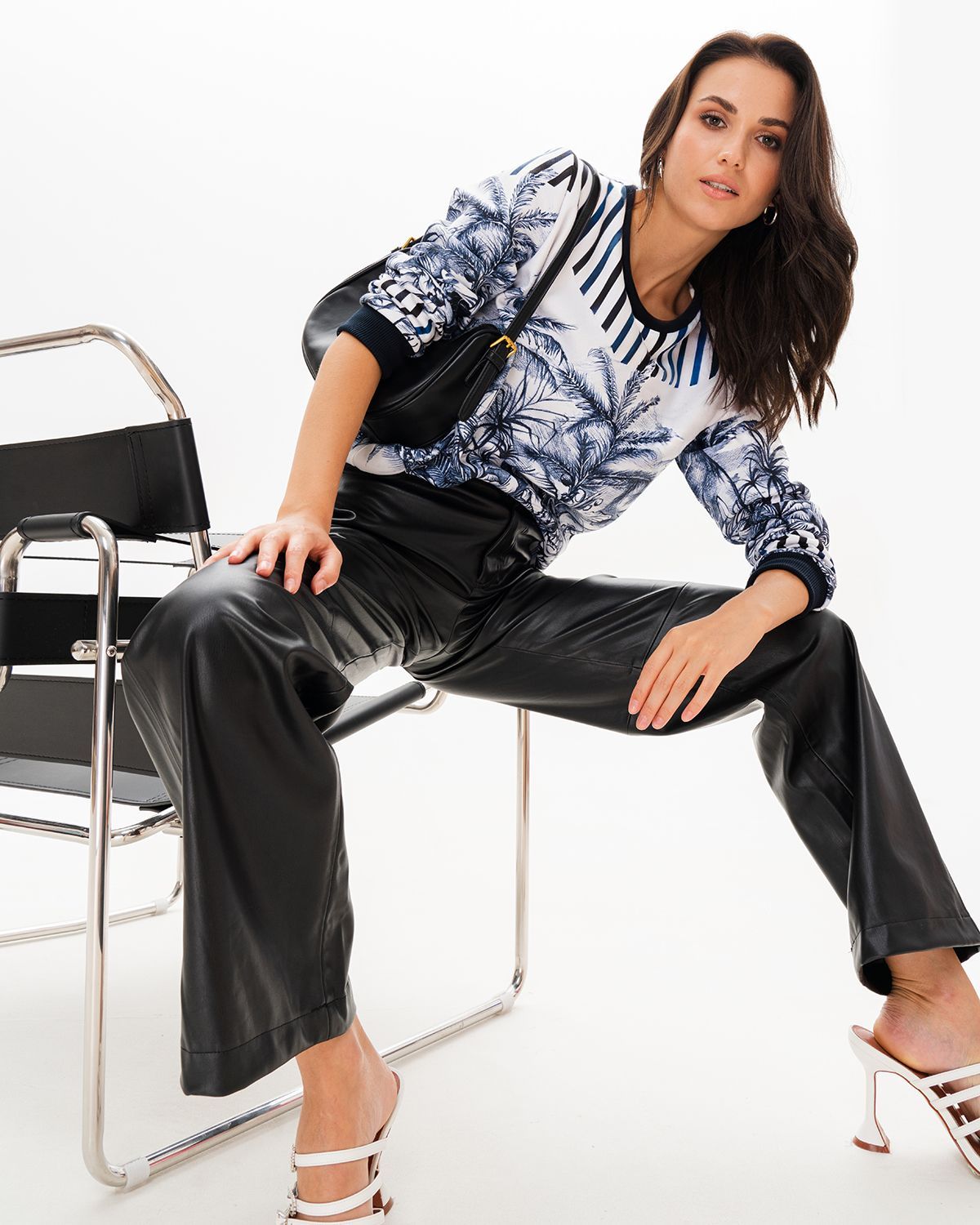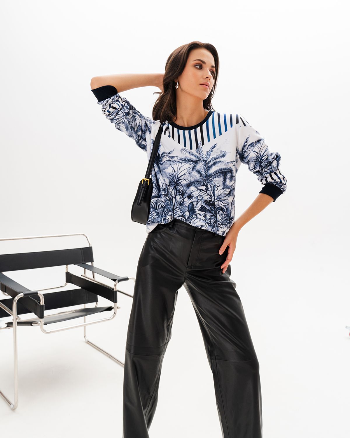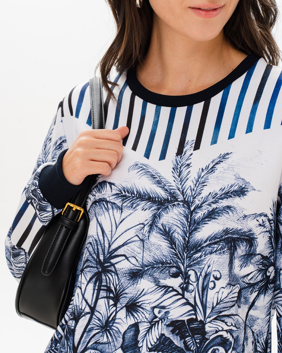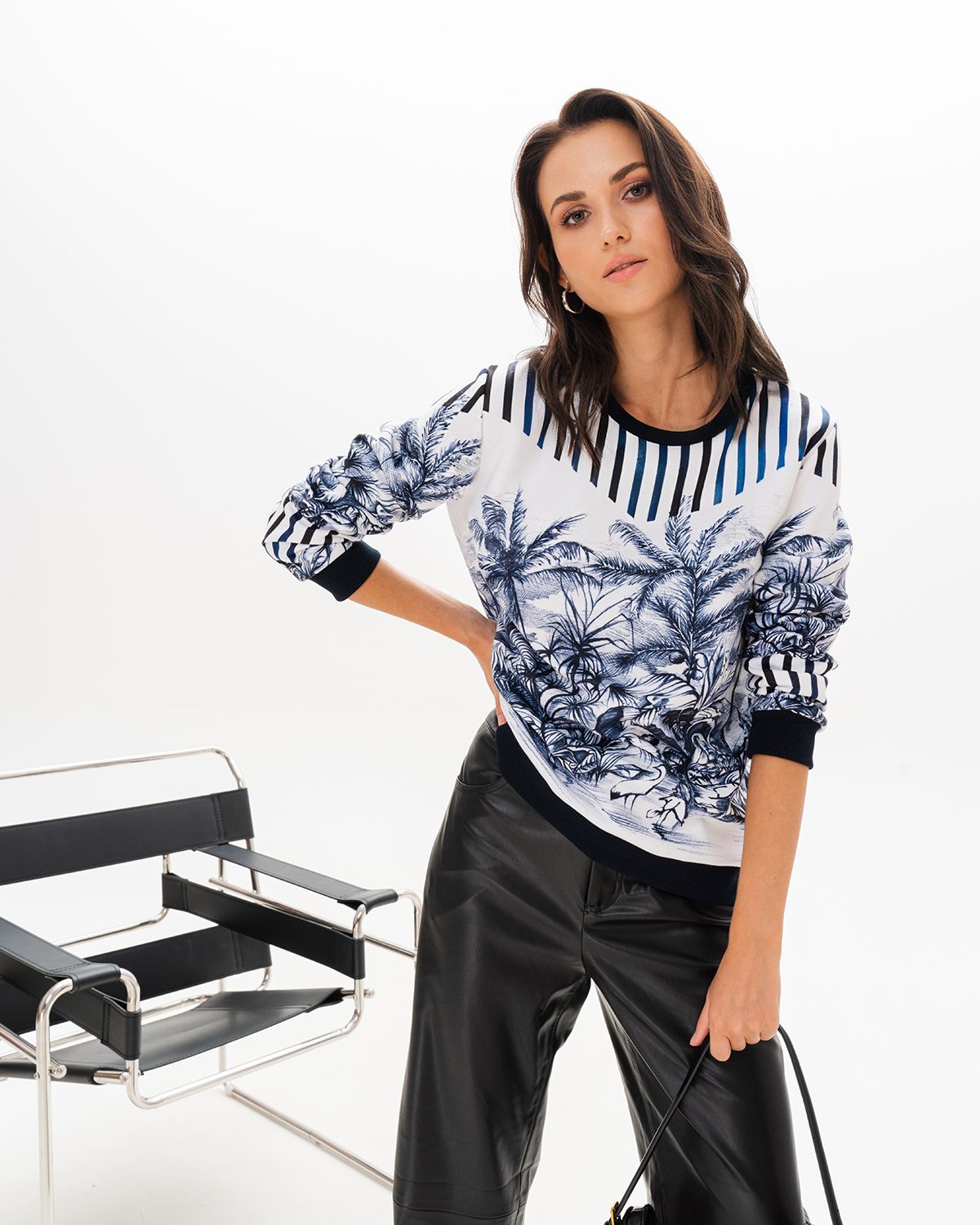 Свитшот с принтом сделан из интерлока - материала, который с изнаночной стороны состоит из хлопка, а снаружи имеет специальный полиэстеровый слой для стойкого нанесения рисунка. Благодаря этому изделие приятно для тела, а принт спокойно переживет хоть сотню стирок и останется таким же ярким и сочным.