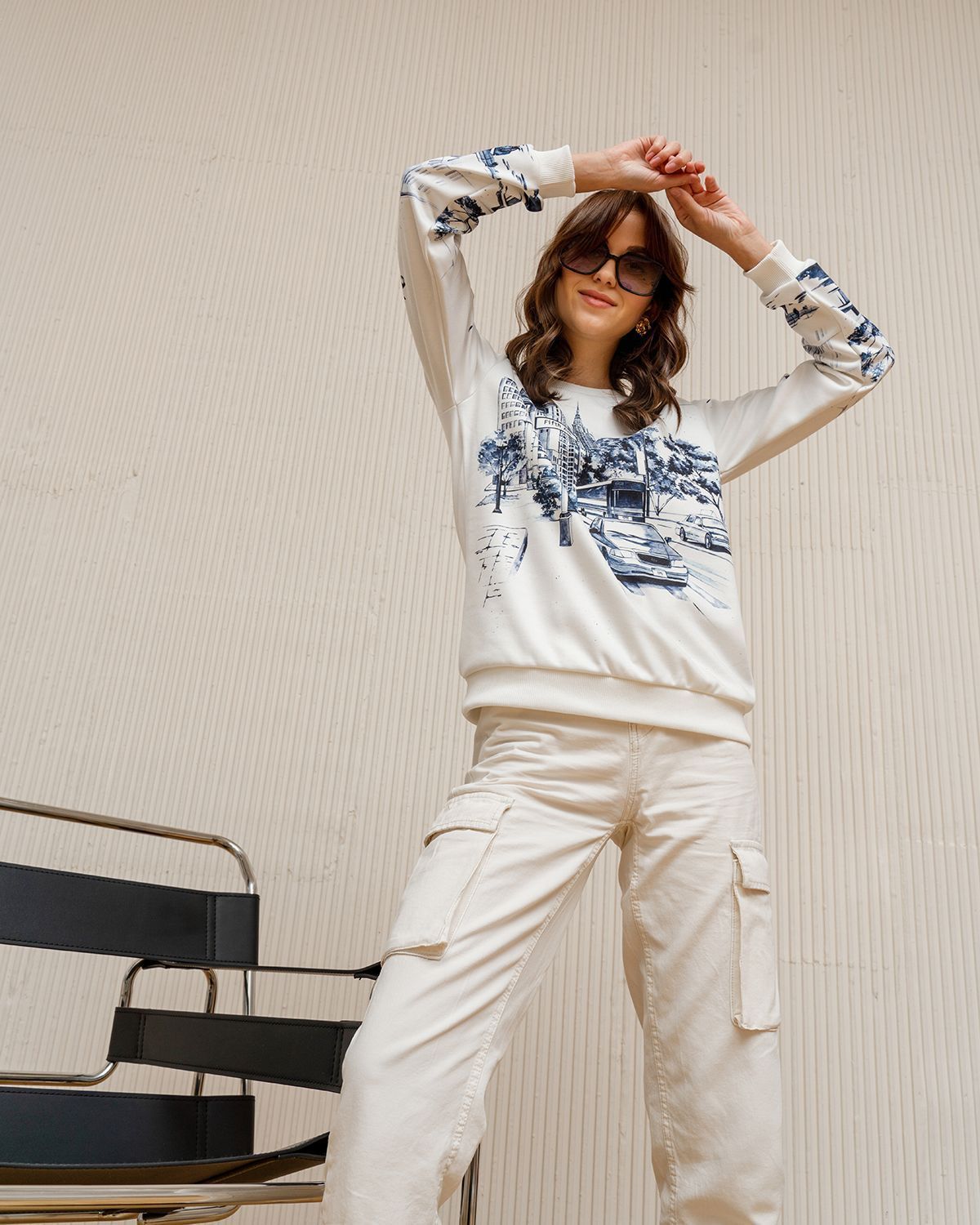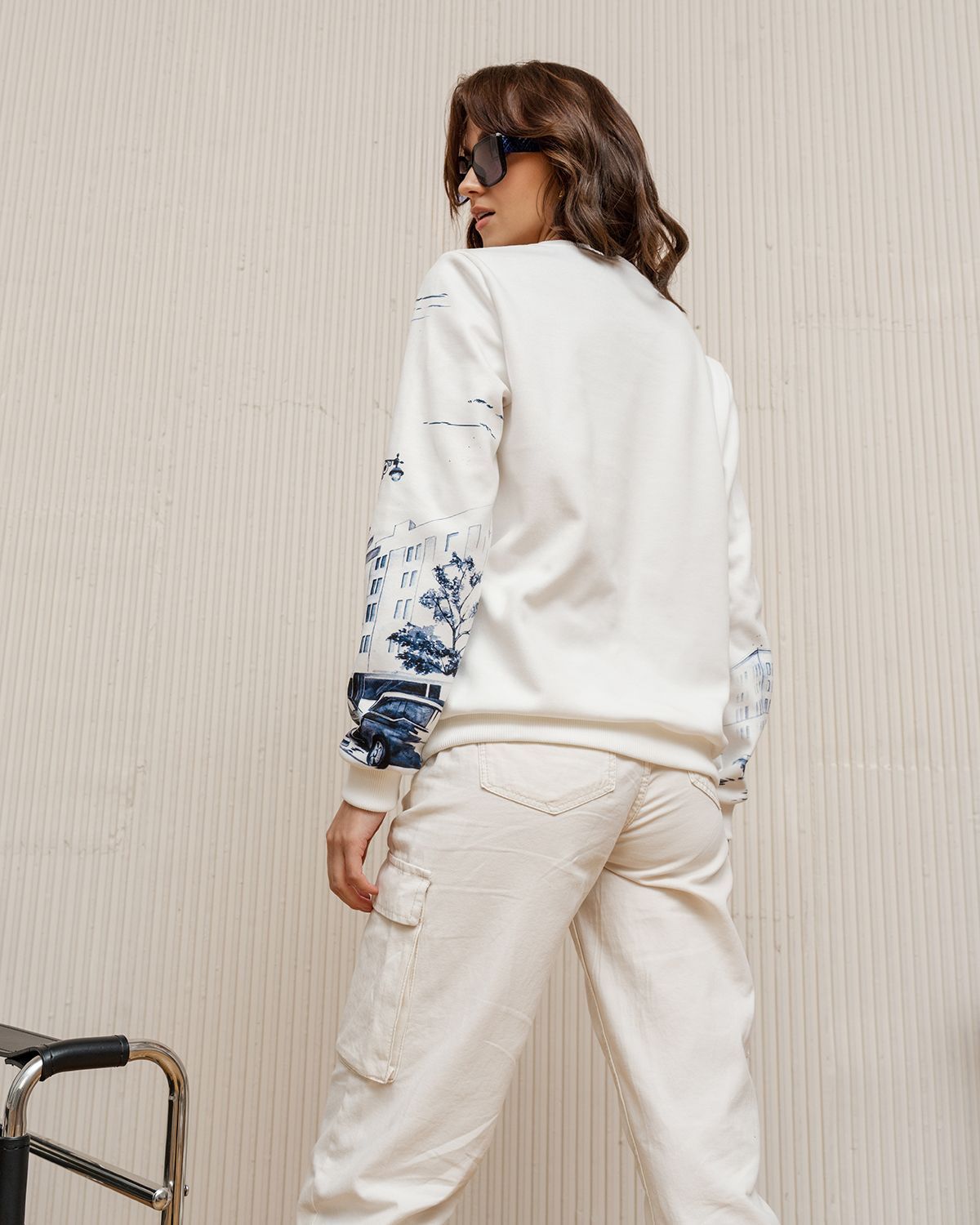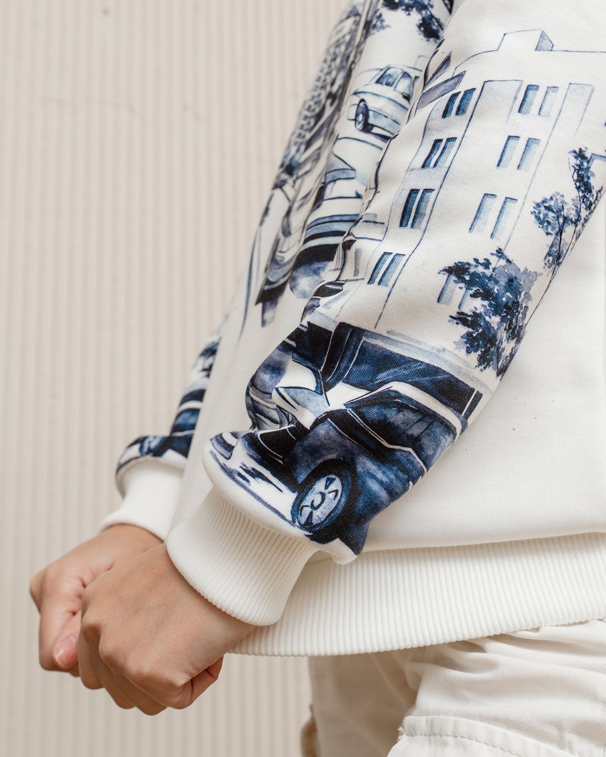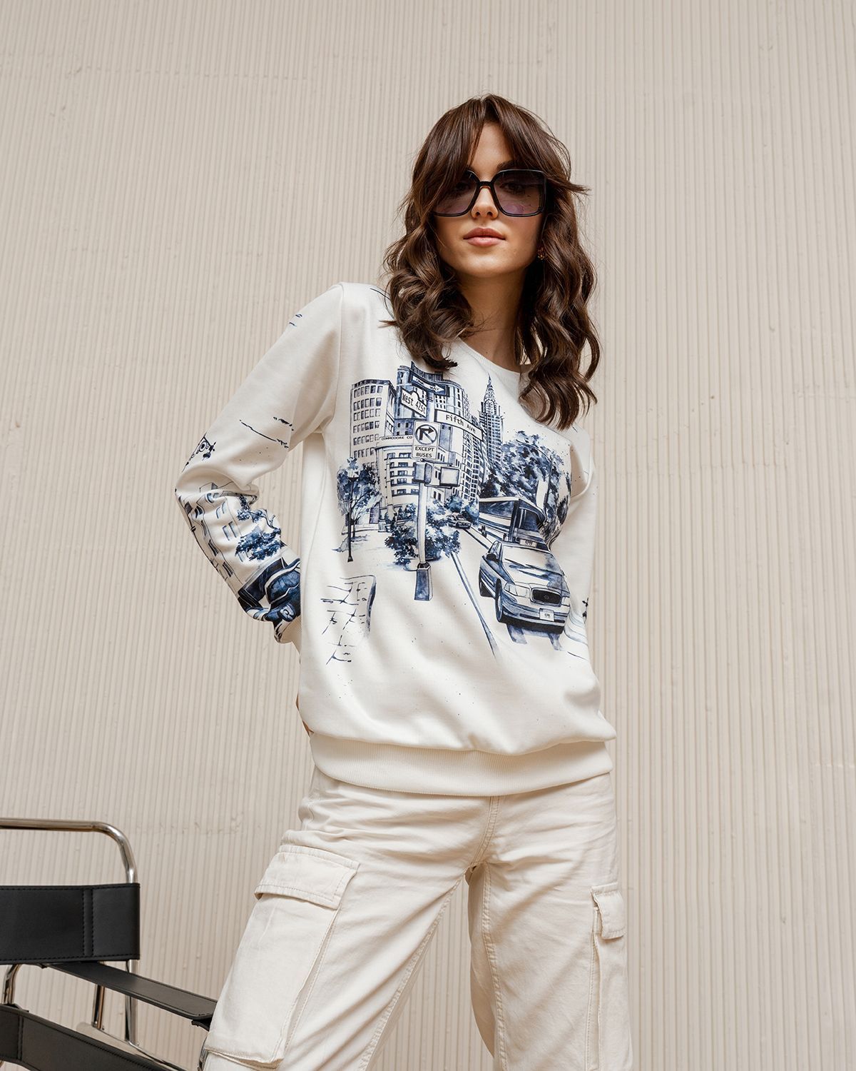 Свитшот с принтом сделан из интерлока - материала, который с изнаночной стороны состоит из хлопка, а снаружи имеет специальный полиэстеровый слой для стойкого нанесения рисунка. Благодаря этому изделие приятно для тела, а принт спокойно переживет хоть сотню стирок и останется таким же ярким и сочным.