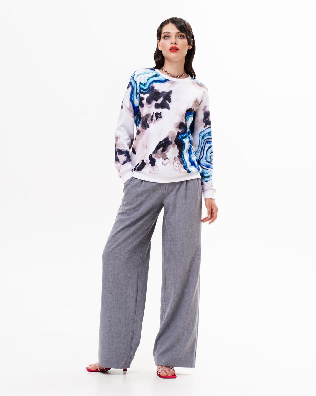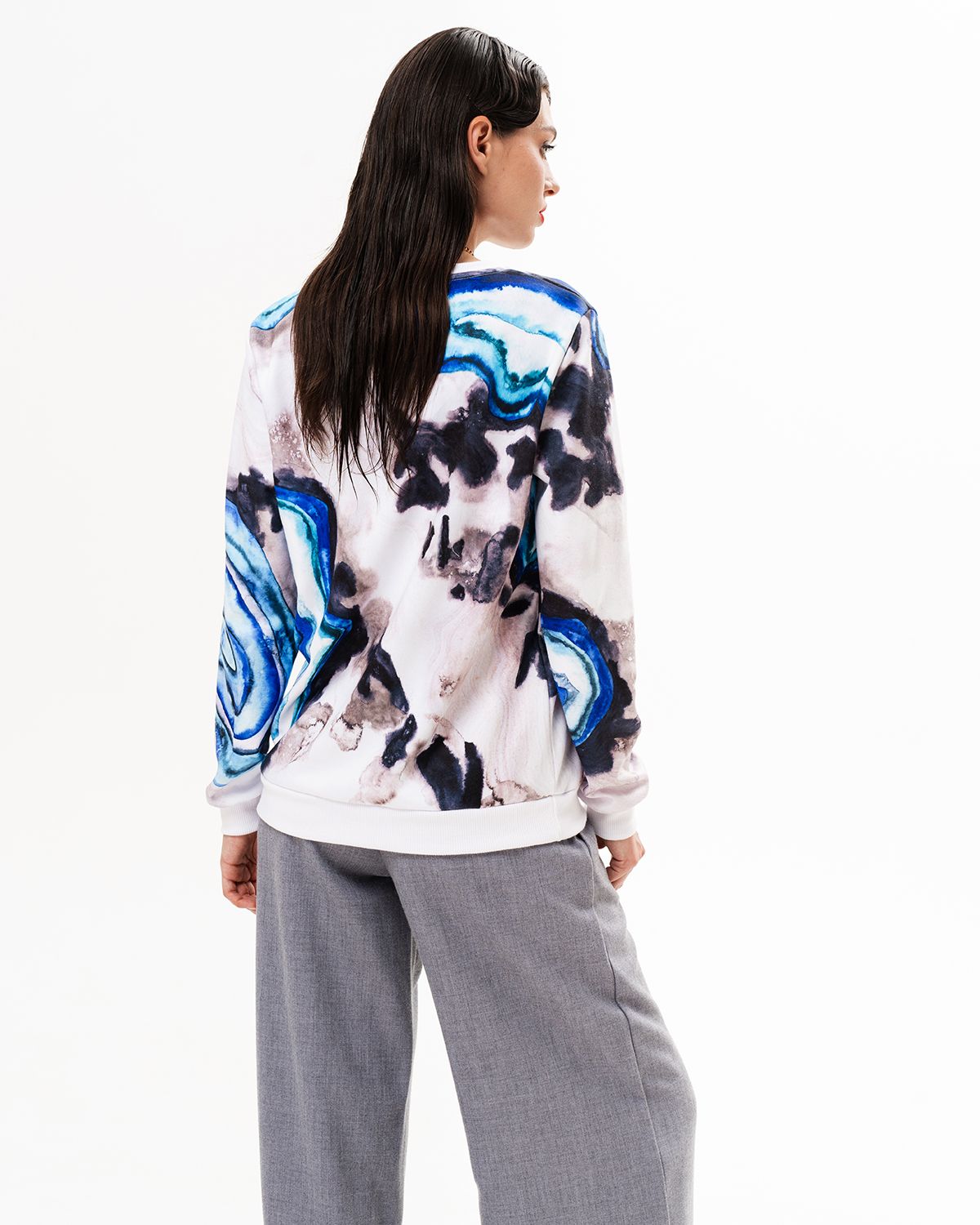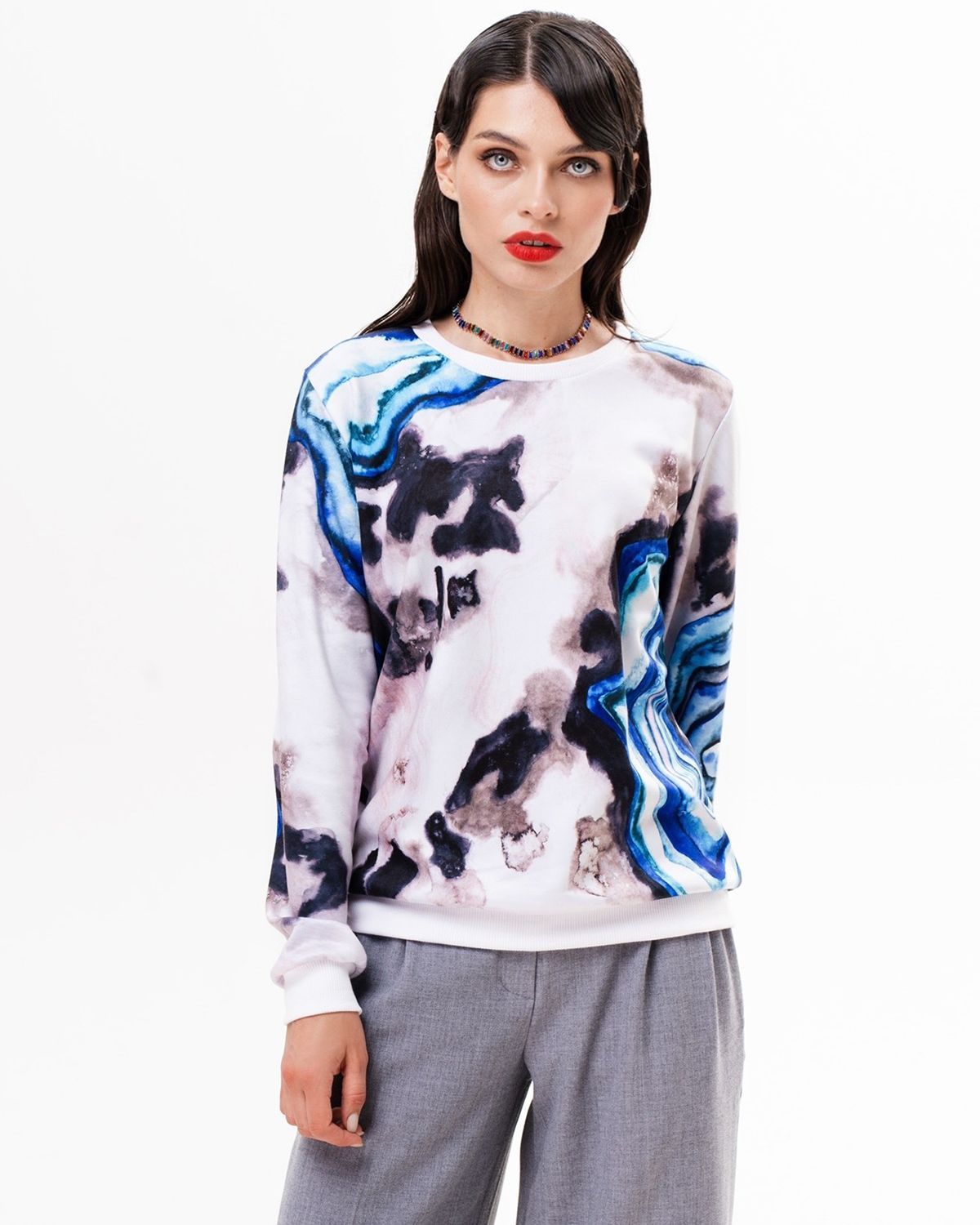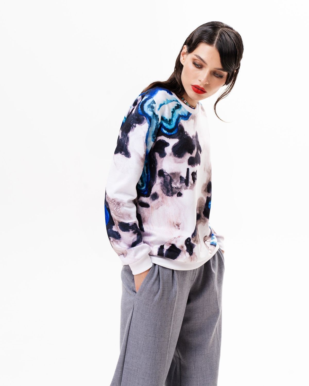 Свитшот с принтом сделан из интерлока - материала, который с изнаночной стороны состоит из хлопка, а снаружи имеет специальный полиэстеровый слой для стойкого нанесения рисунка. Благодаря этому изделие приятно для тела, а принт спокойно переживет хоть сотню стирок и останется таким же ярким и сочным.