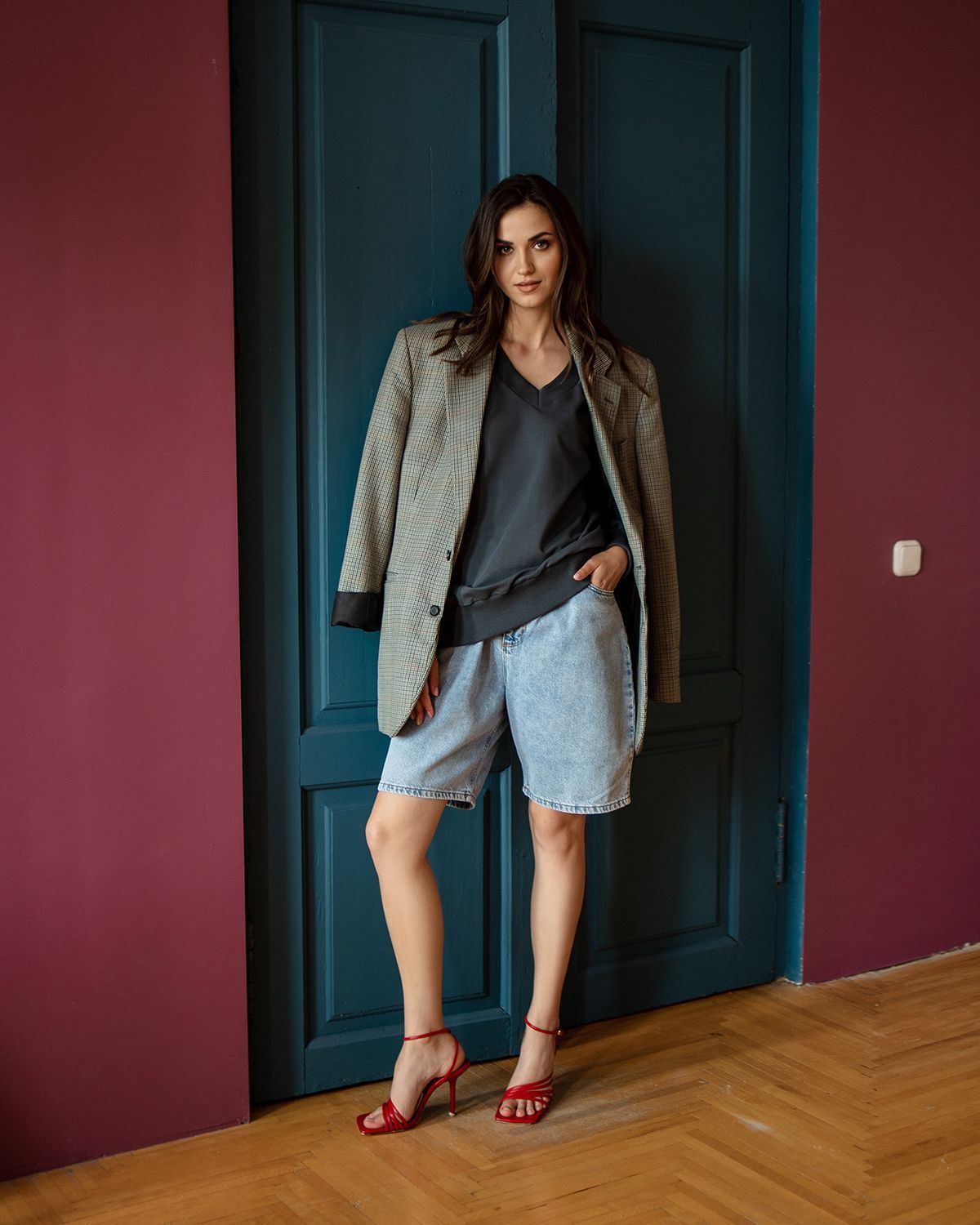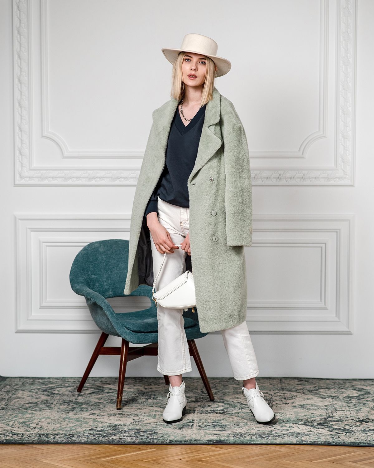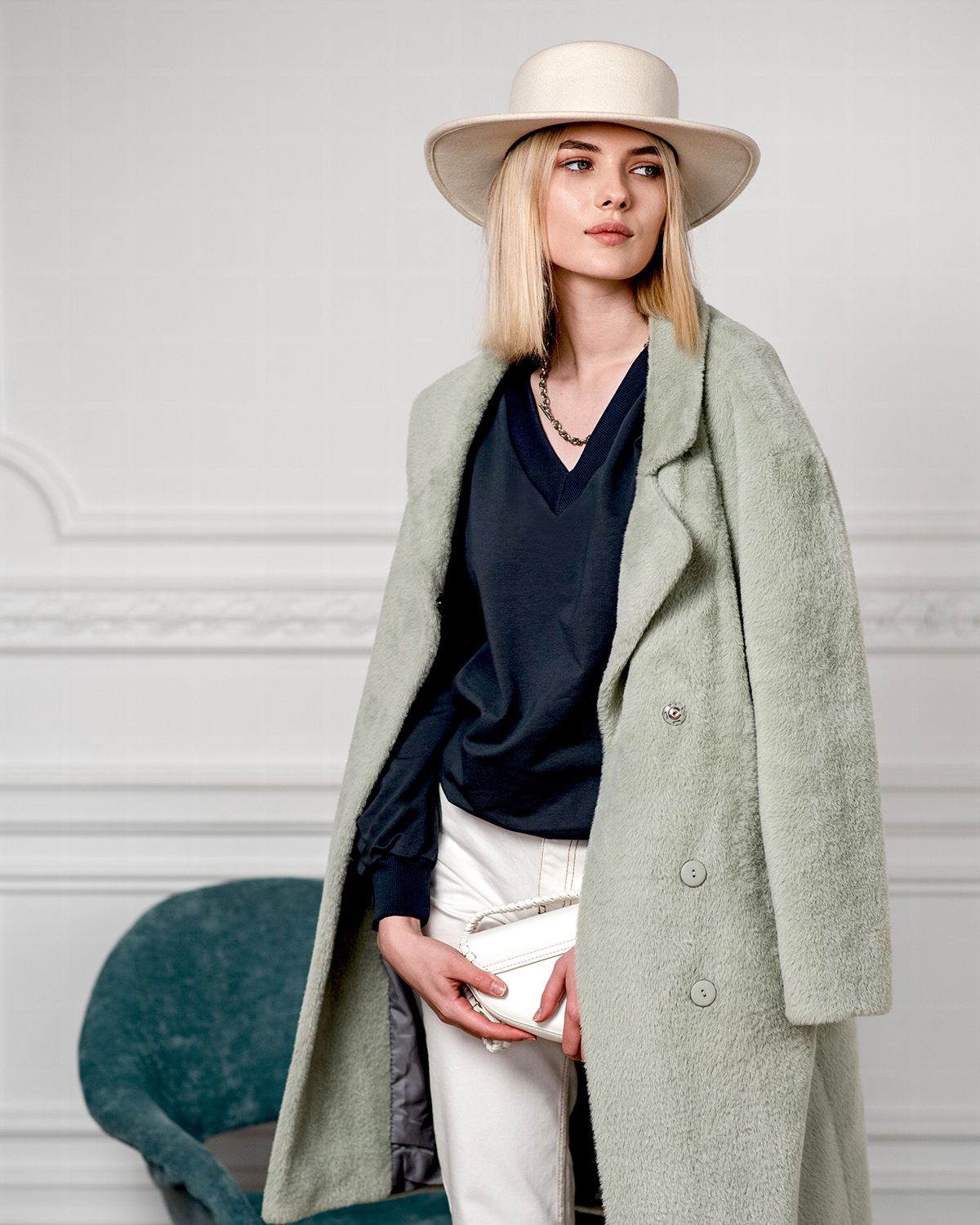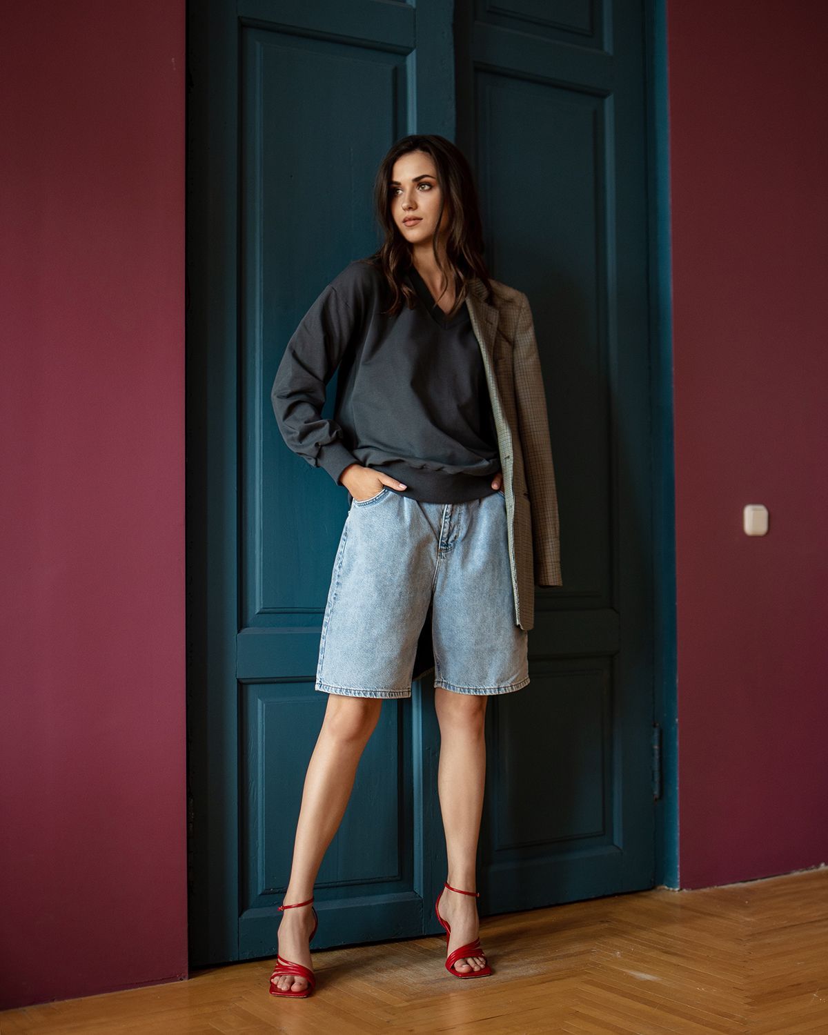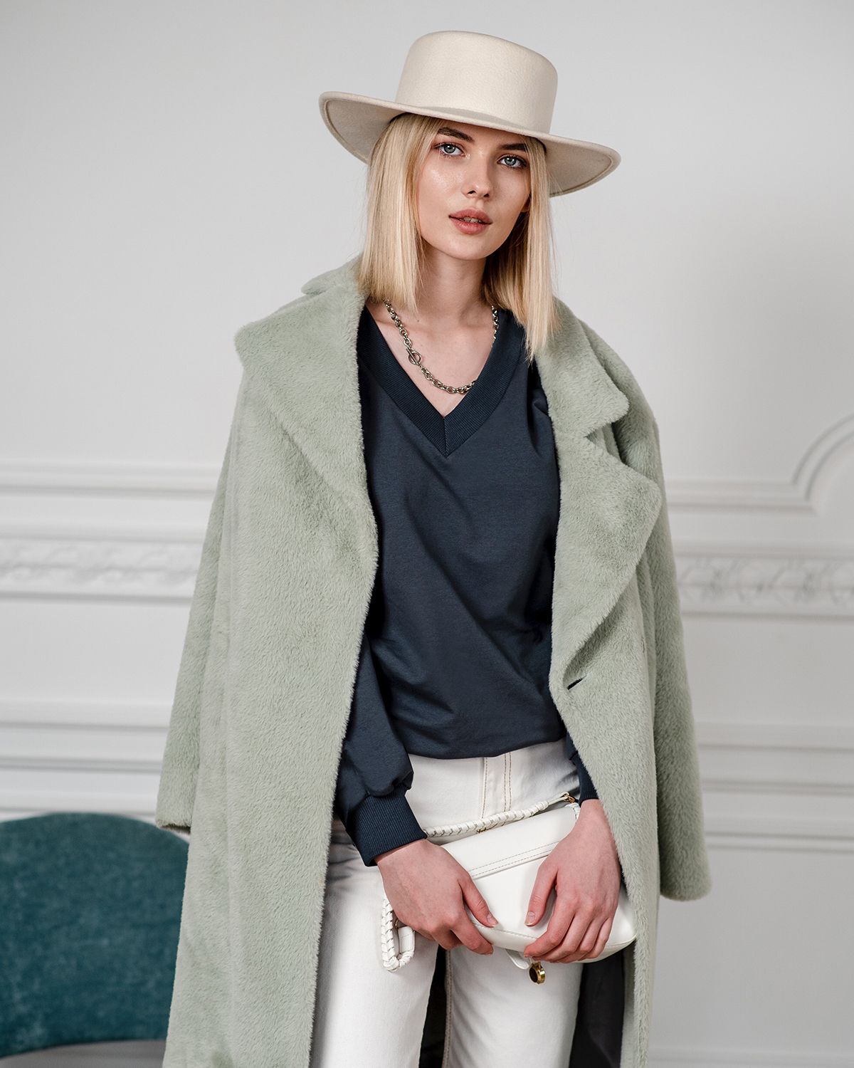 Свитшот оверсайз с v-образным вырезом - не самое традиционное сочетание, но мы любим нестандартные решения. Такая форма воротника красиво открывает шею и подчеркивает её длину.