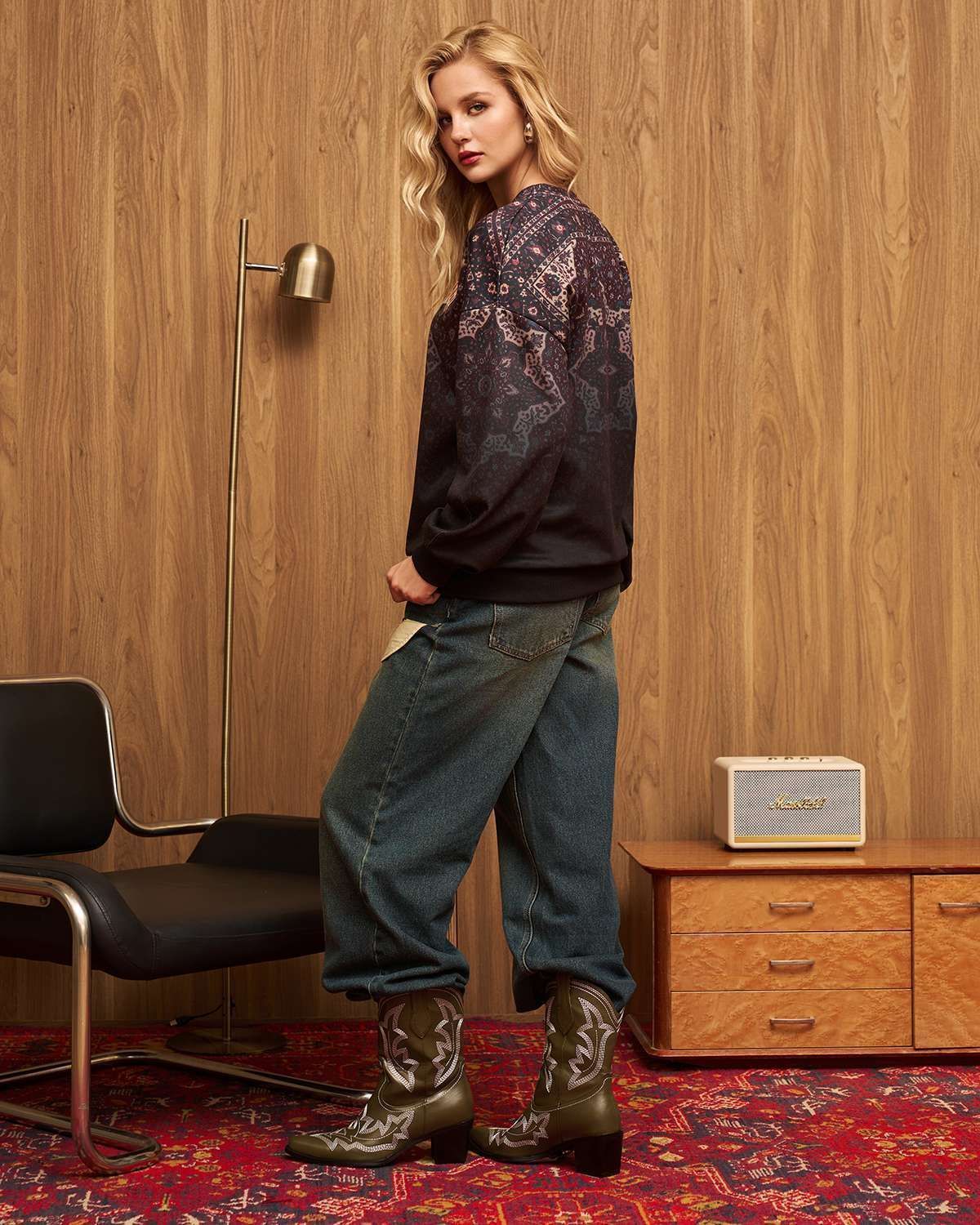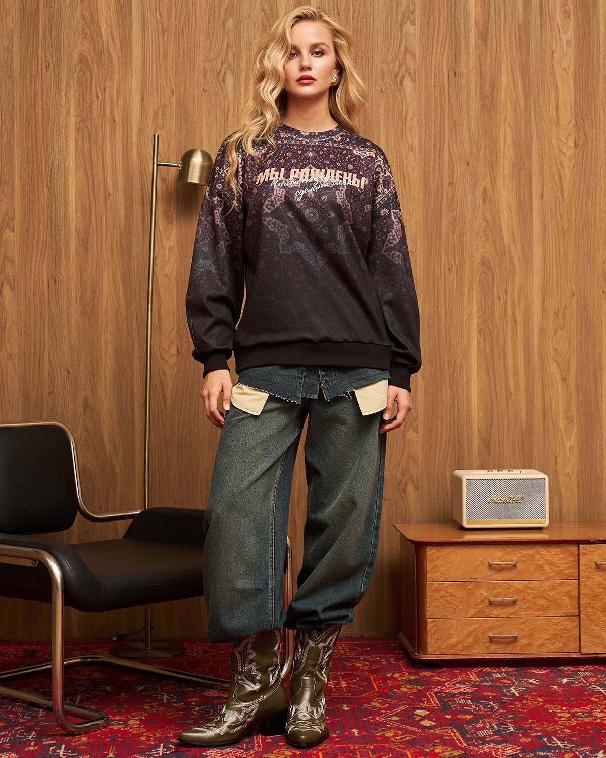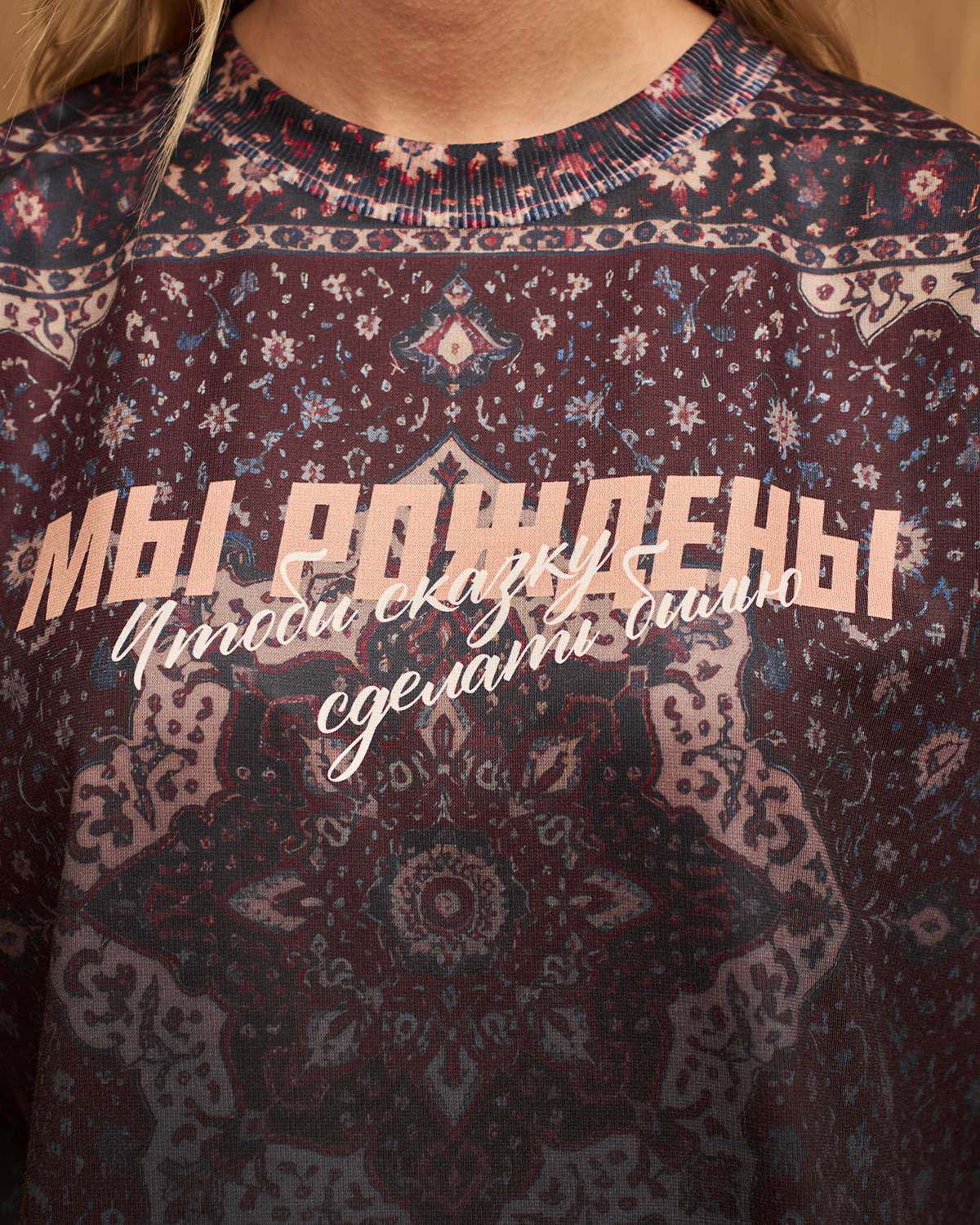 Cвитшот, вдохновленный эстетикой советских времен, сочетающий уютные мотивы традиционного русского быта и современные дизайнерские решения. Центральным элементом изделия является яркая картина советского ковра с характерными орнаментами, наполненная теплыми красками и четкими линиями, придающая вещи неповторимый шарм.